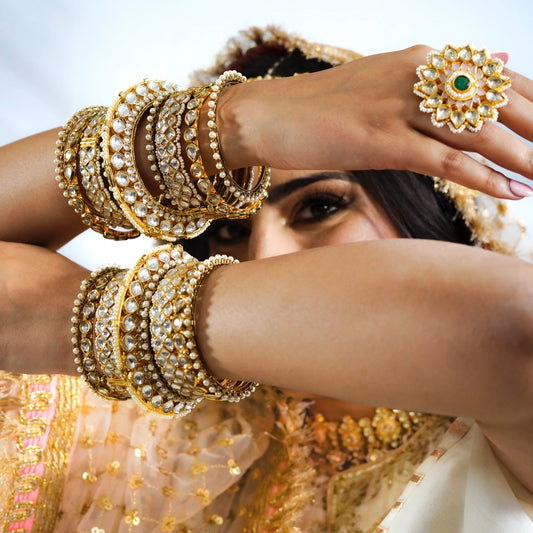 Elevate your jewellery collection with our exquisite Indian bangles. ...Choose from the timeless detailing of Paachi Kundan styles or the regal charm of Polki pieces. Whether you're looking to stack multiple bangles for a bold look or wear a single piece to make a statement, our collection offers the perfect accessory for every occasion. Discover our bridal collection for ready made bridal choora sets and more.