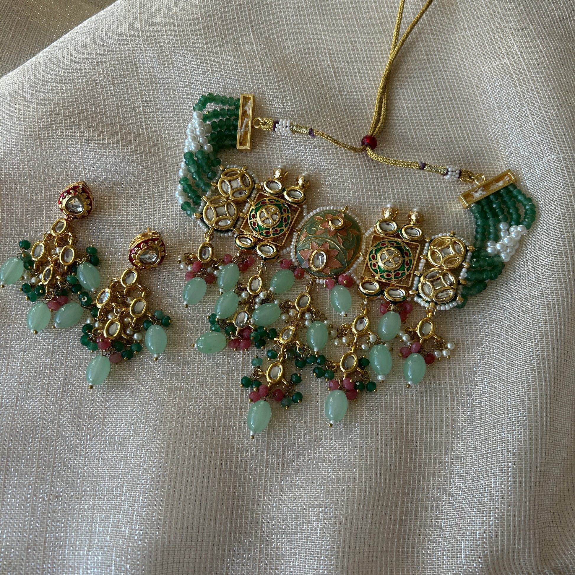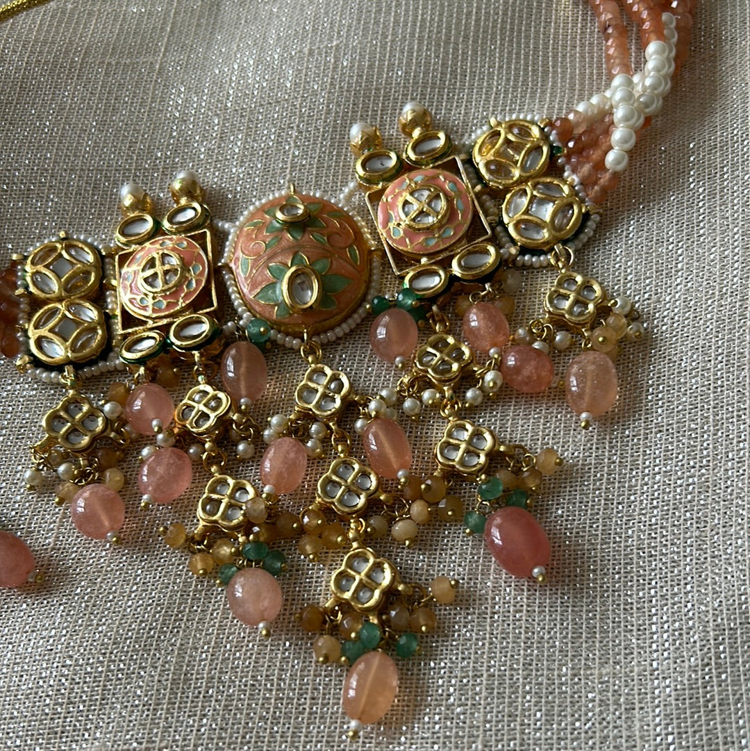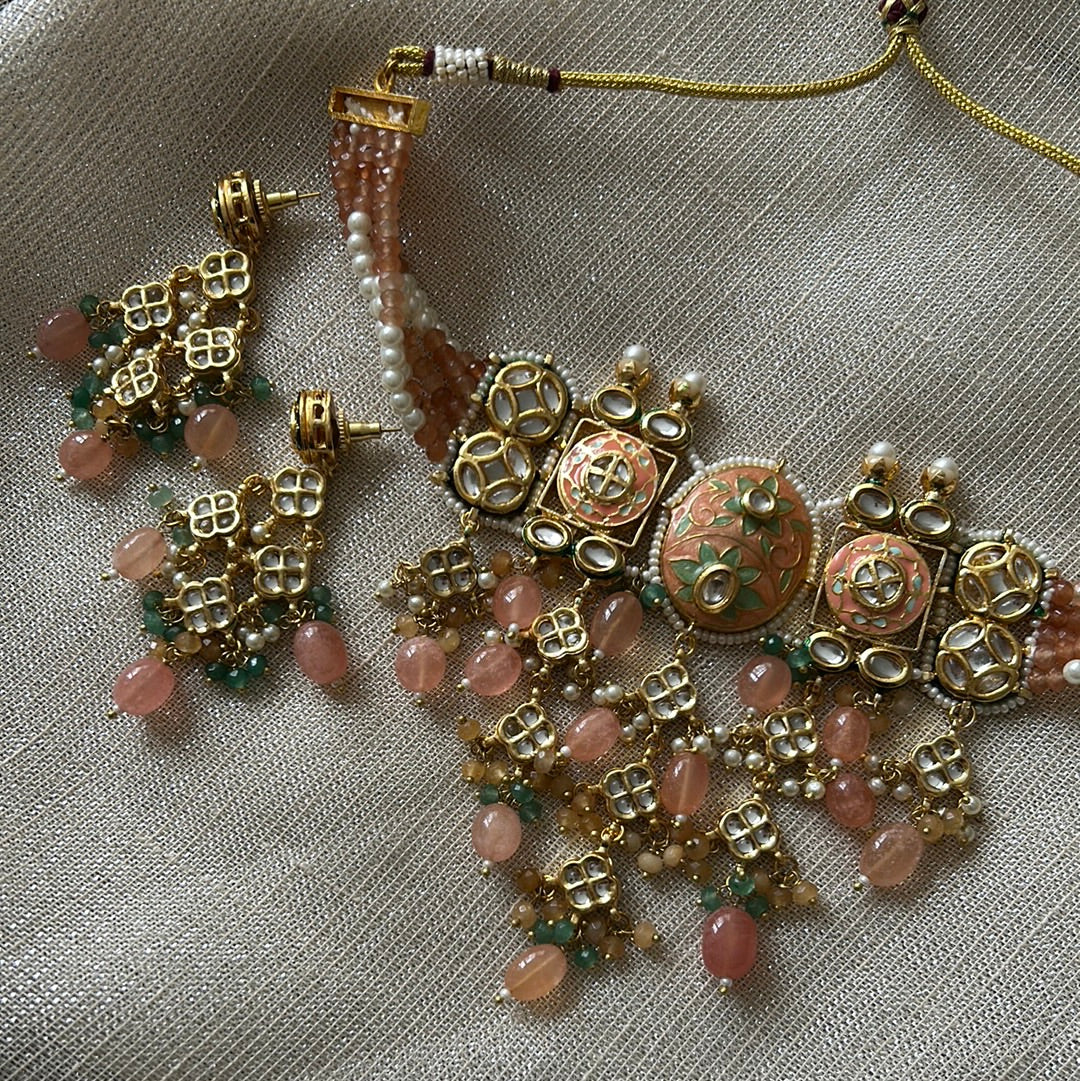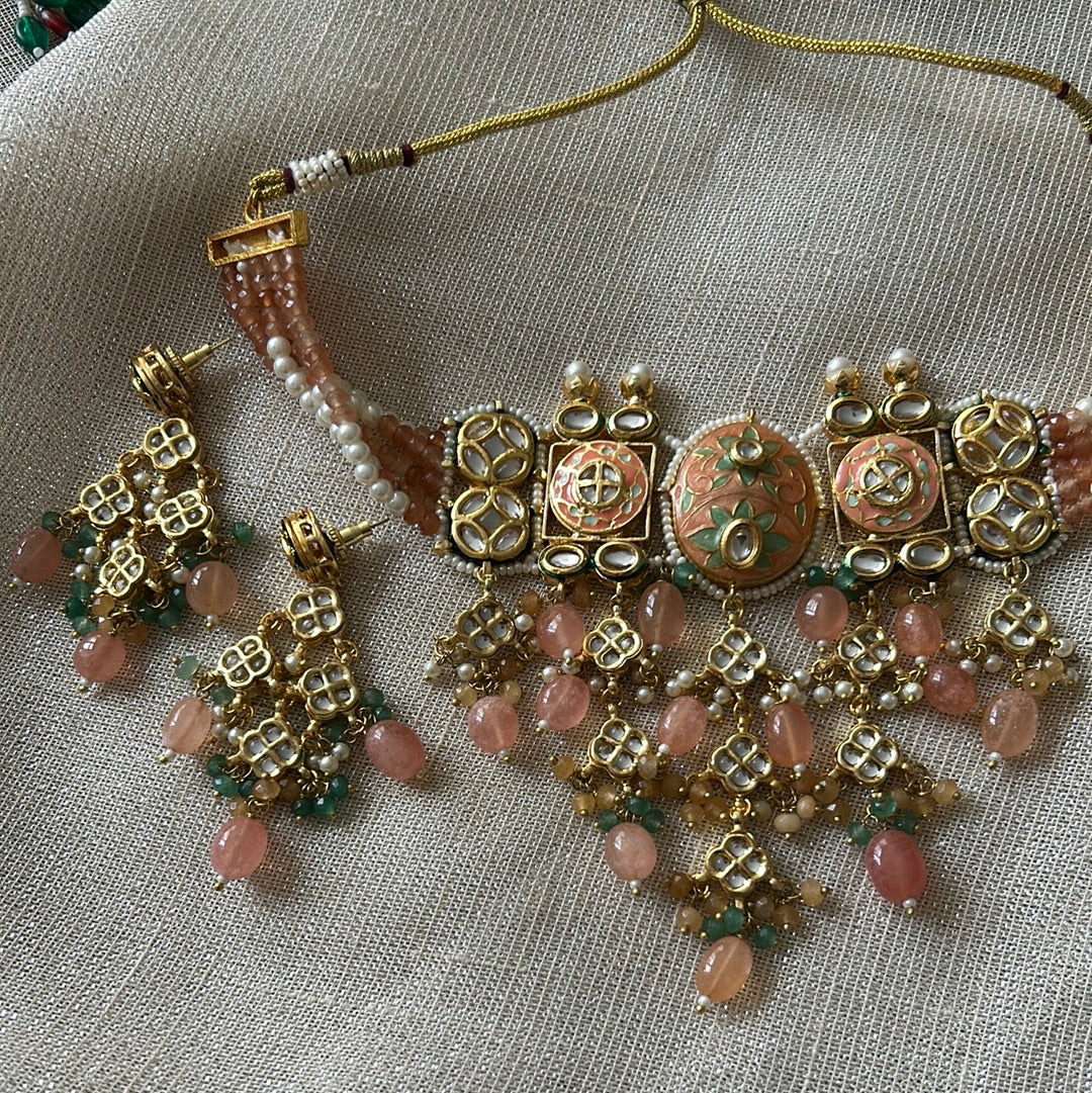 Beautiful hand painted Meenakari set in peach or pink. Meenakari pattern in greens and gold add a delicate touch whilst the bold necklace design will make heads turn. Complete with matching earrings.