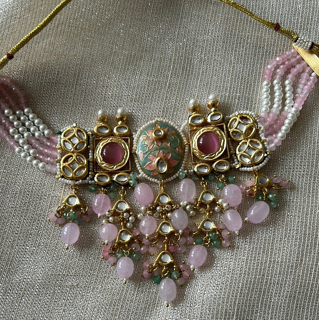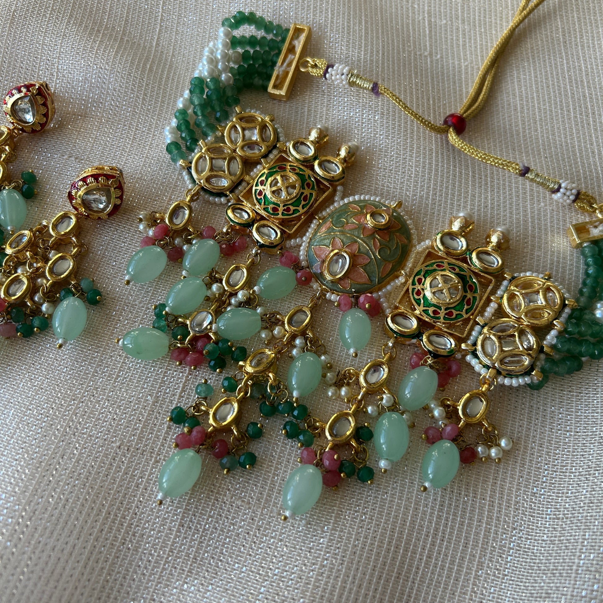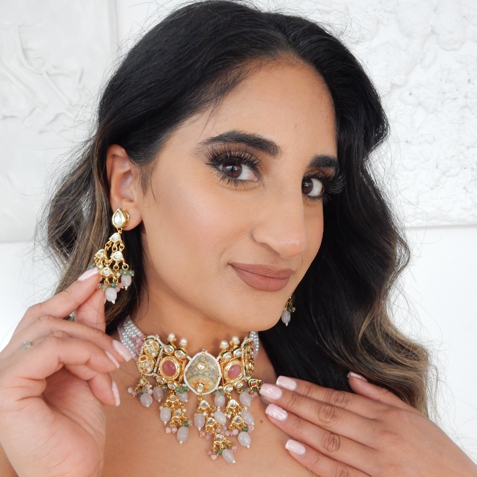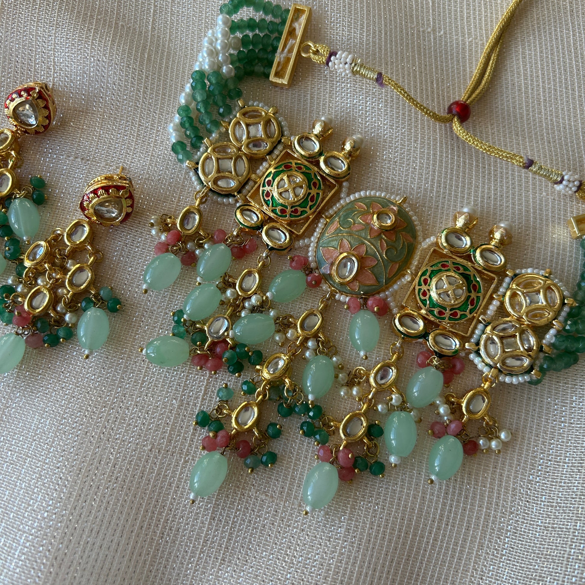 Beautiful hand painted Meenakari set in peach or pink. Meenakari pattern in greens and gold add a delicate touch whilst the bold necklace design will make heads turn. Complete with matching earrings.