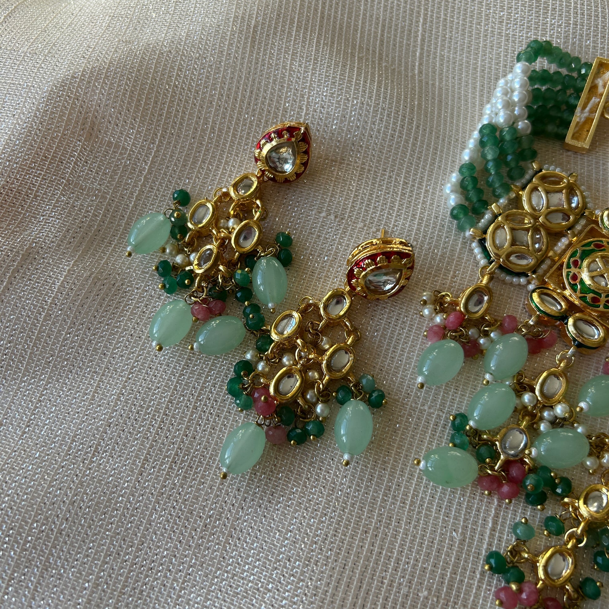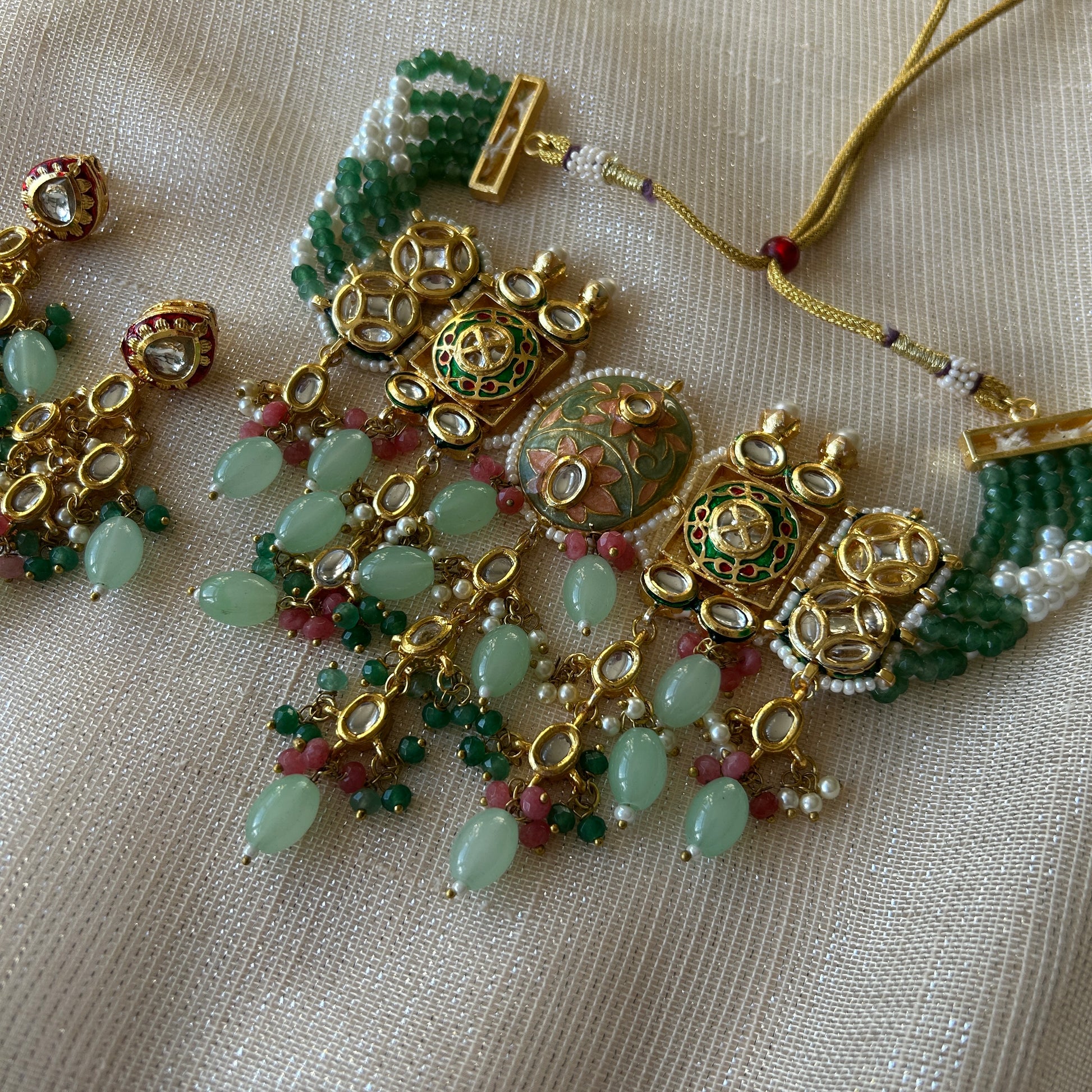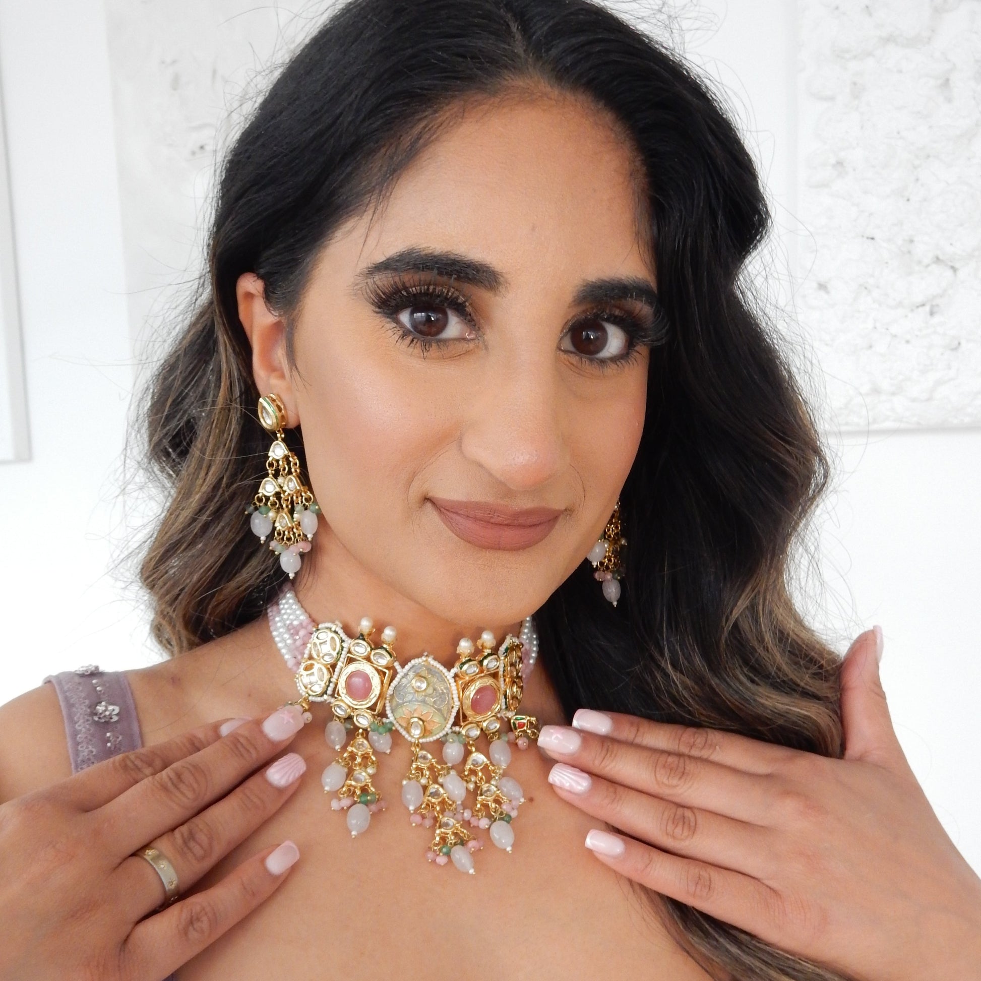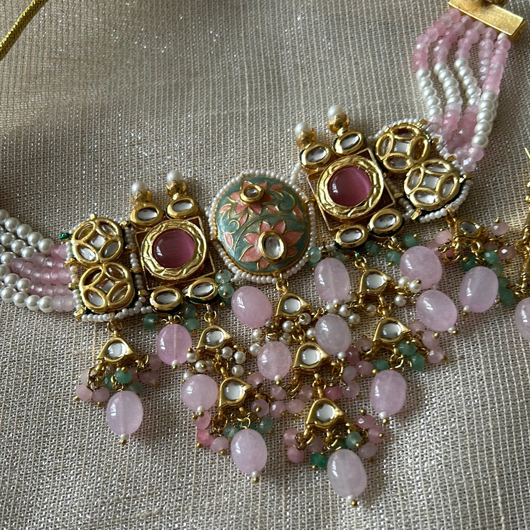 Beautiful hand painted Meenakari set in peach or pink. Meenakari pattern in greens and gold add a delicate touch whilst the bold necklace design will make heads turn. Complete with matching earrings.