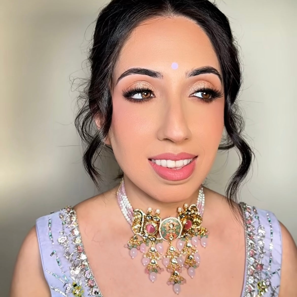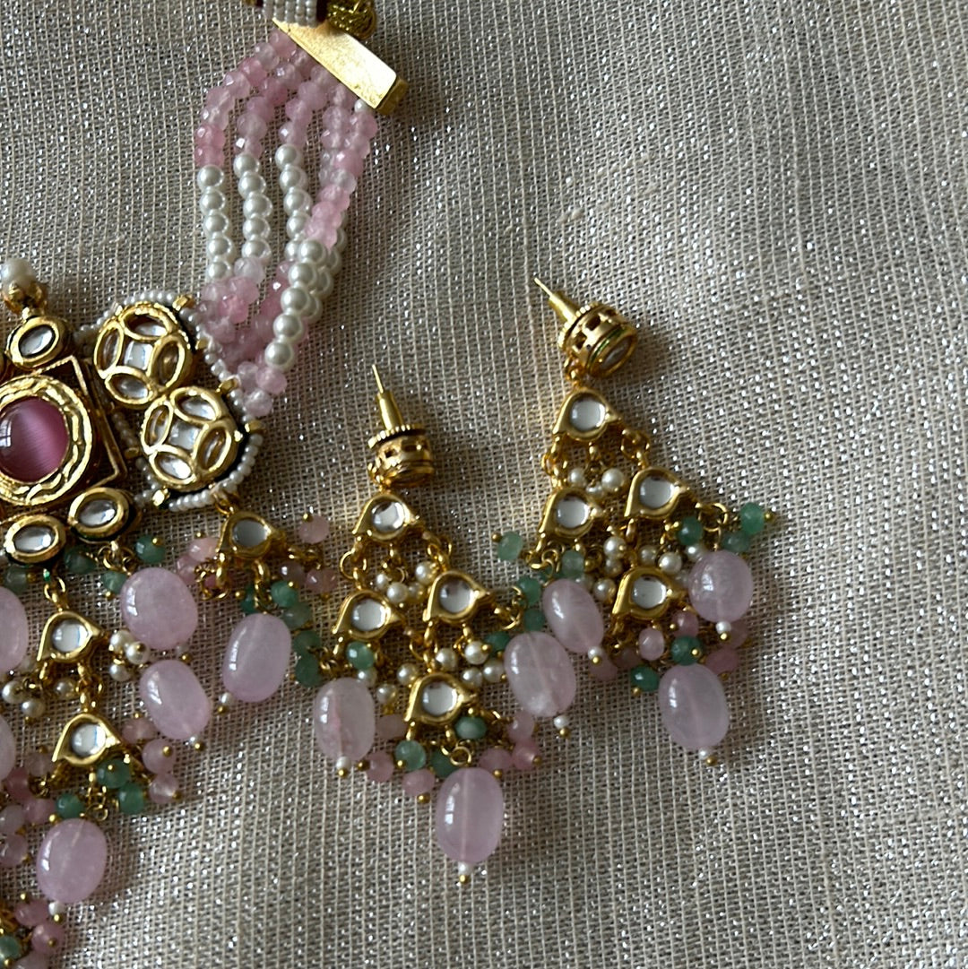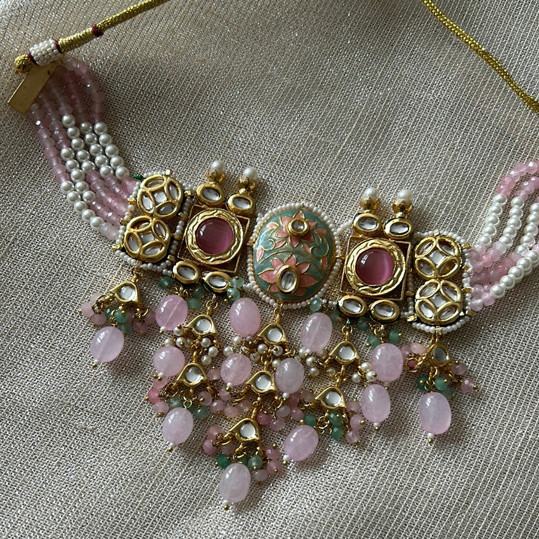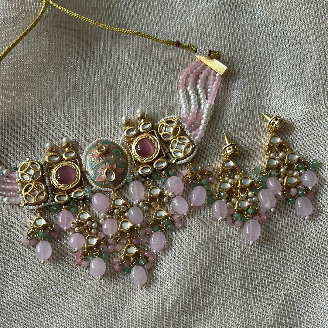 Beautiful hand painted Meenakari set in peach or pink. Meenakari pattern in greens and gold add a delicate touch whilst the bold necklace design will make heads turn. Complete with matching earrings.