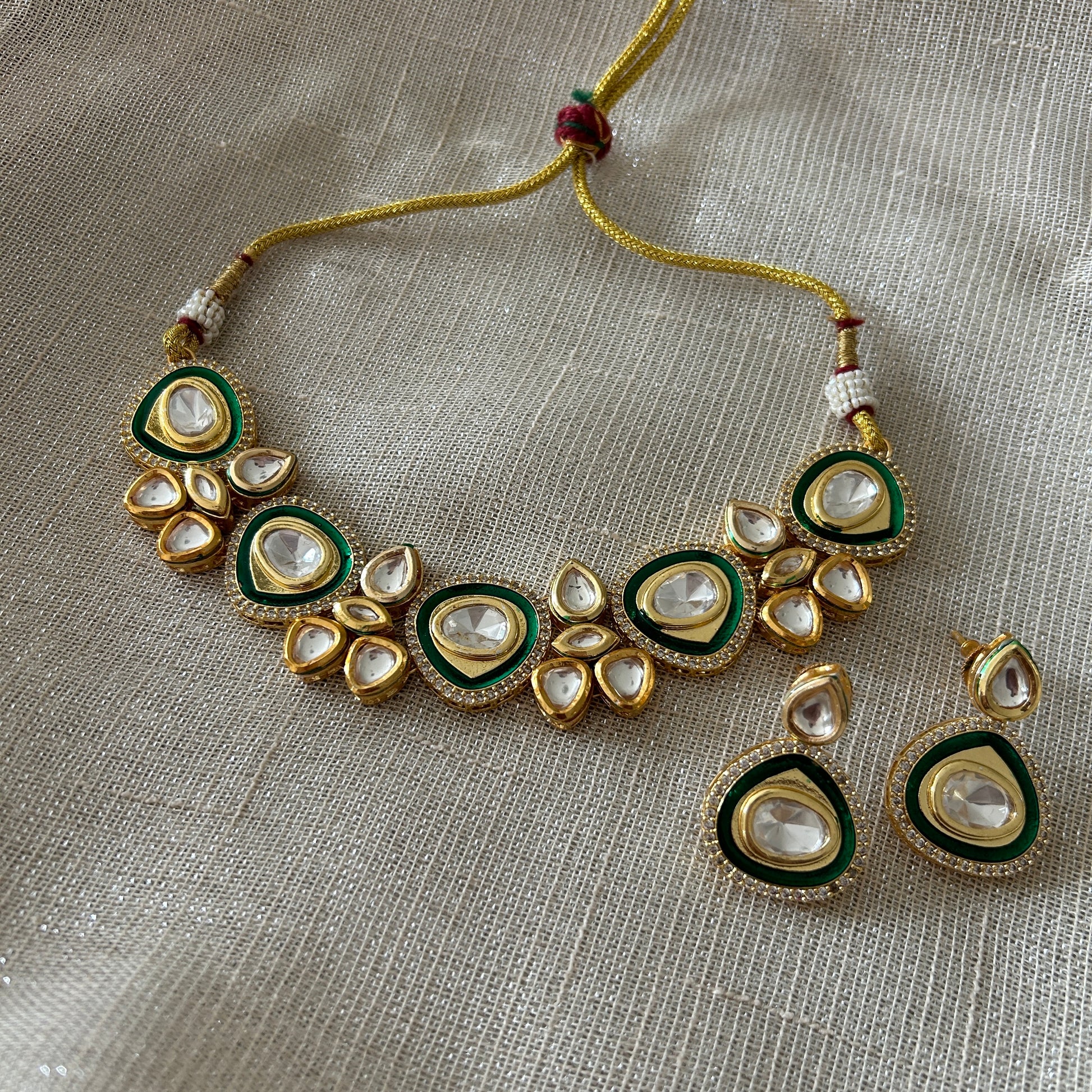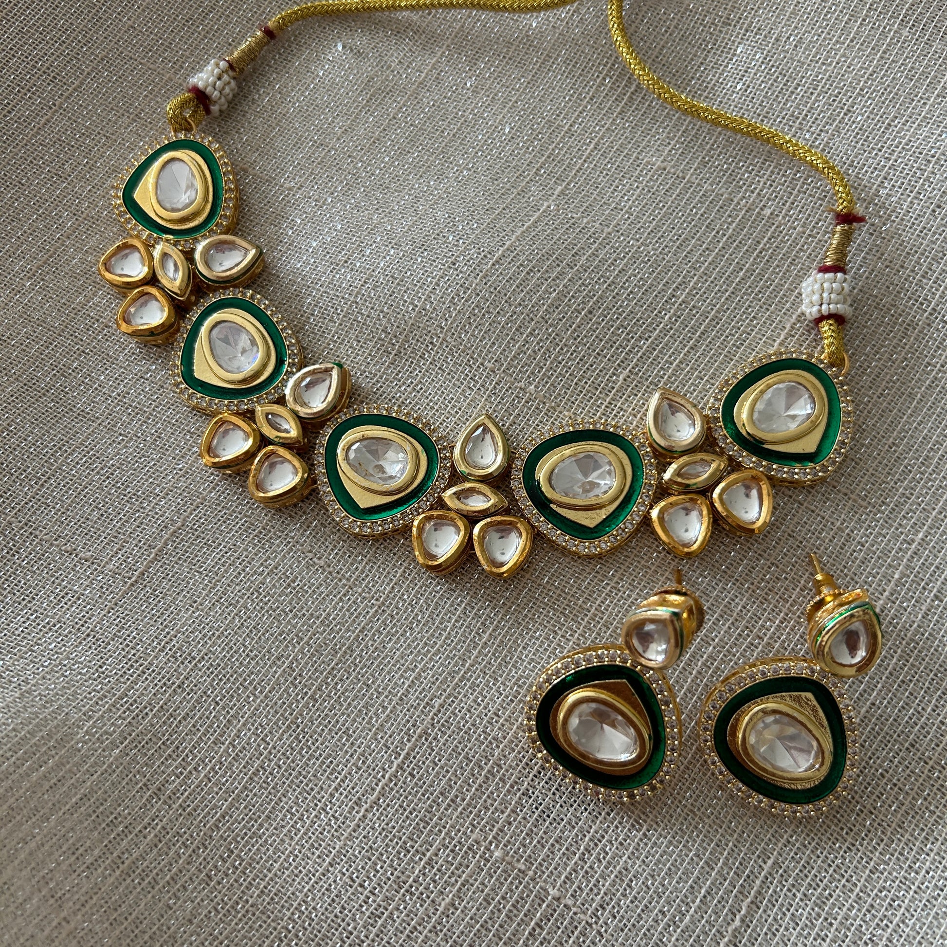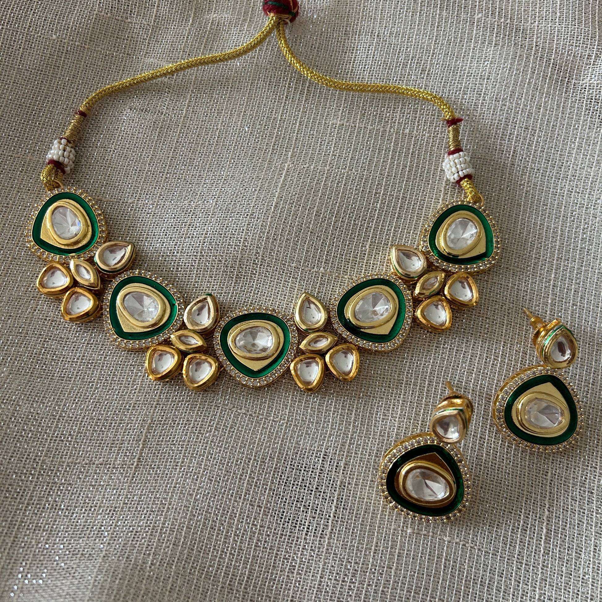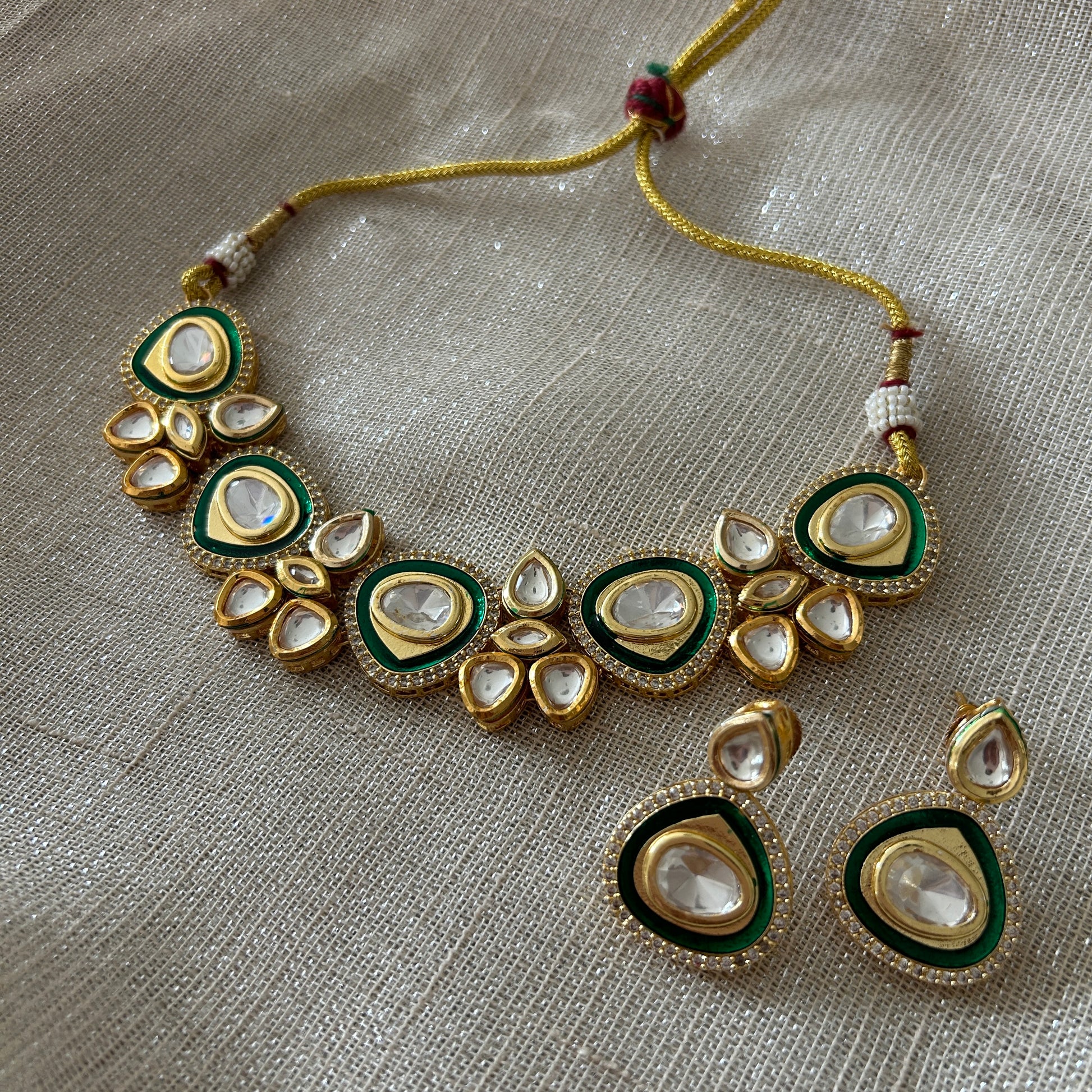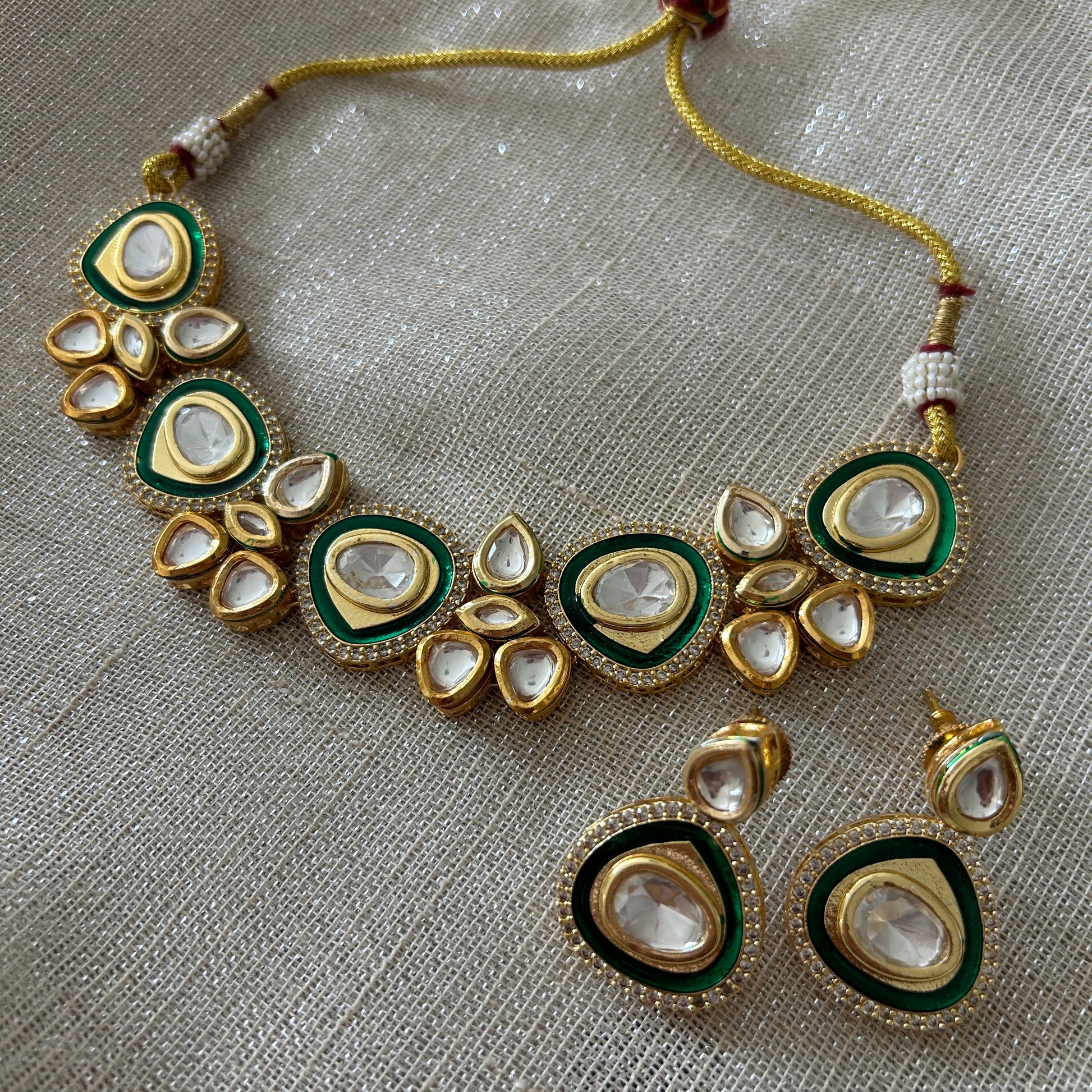 Make a statement with our new ayaan set. This lightweight set features beautiful emerald and clear stones on a gold-plated base. Easy to wear and perfect for any party occasion.
