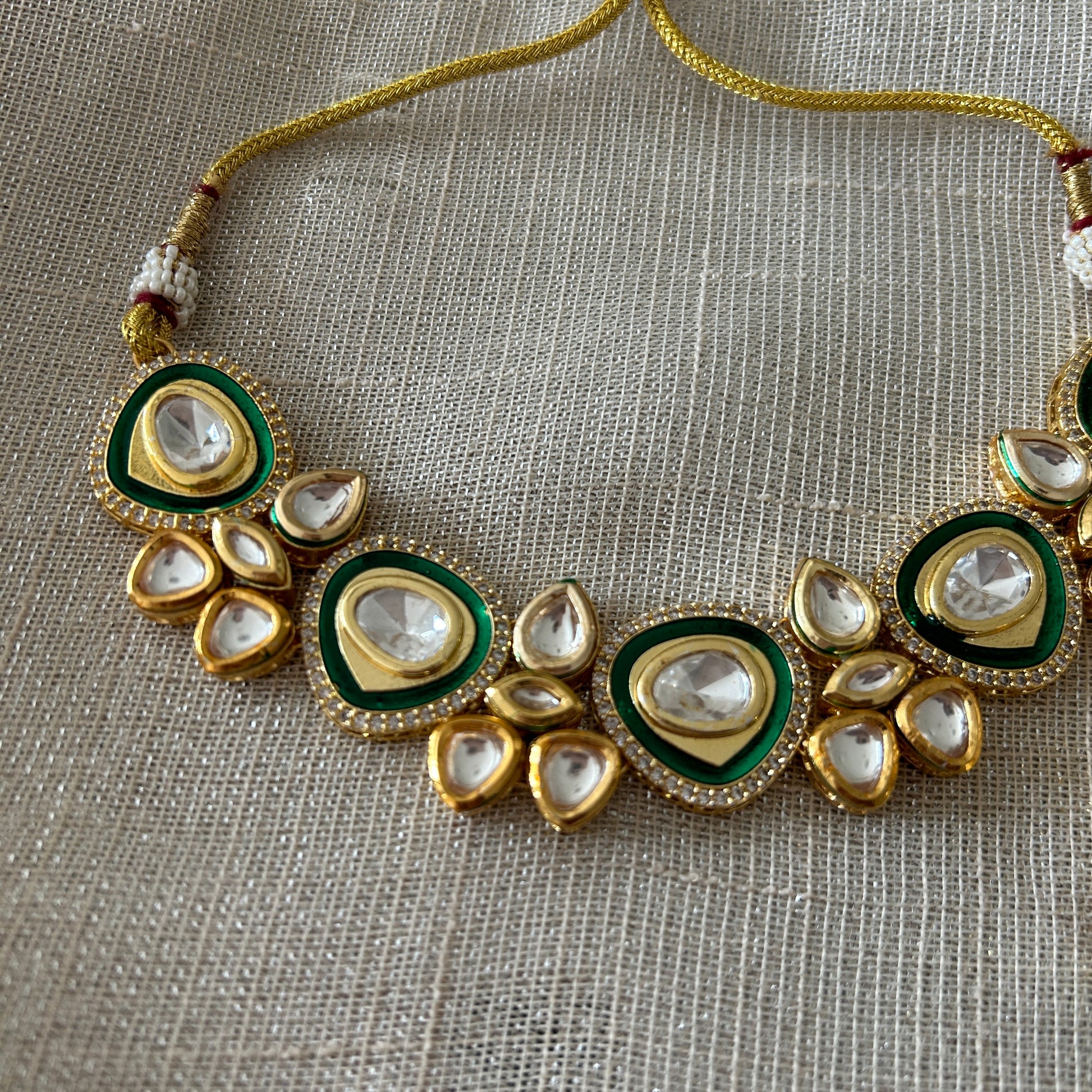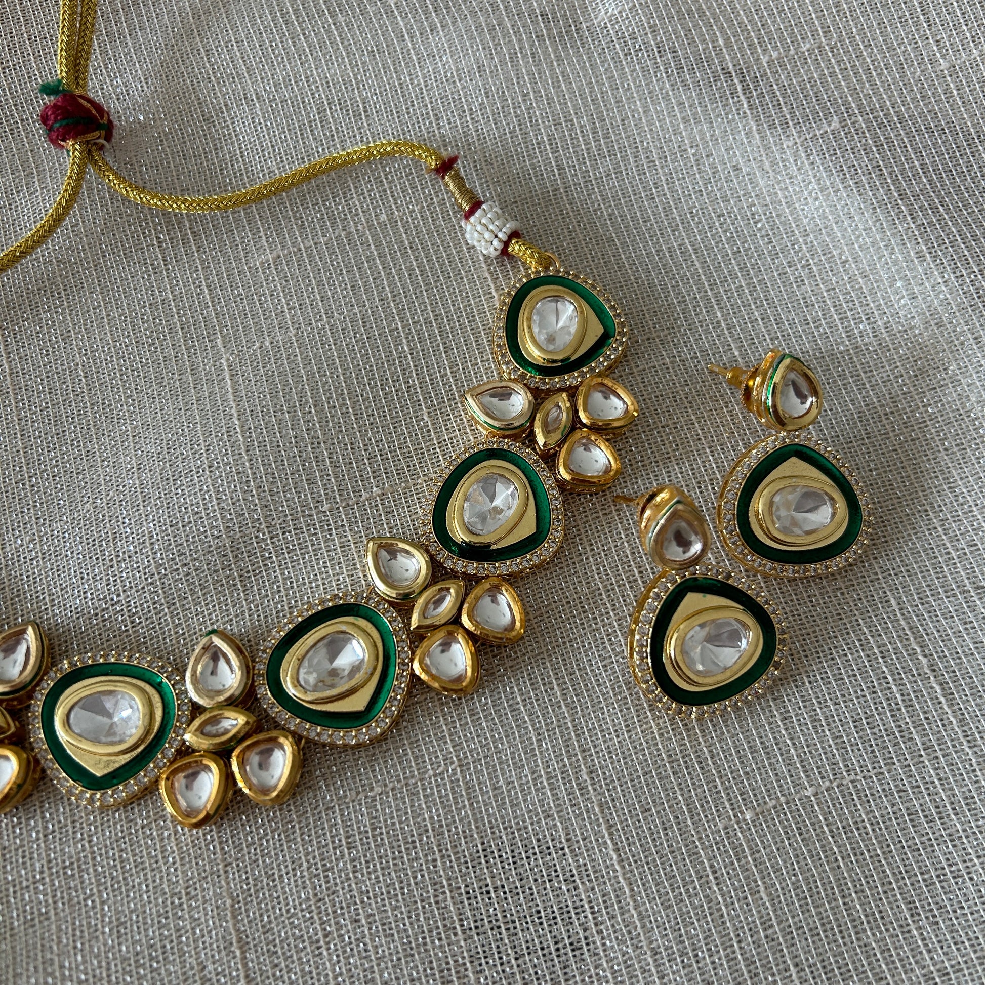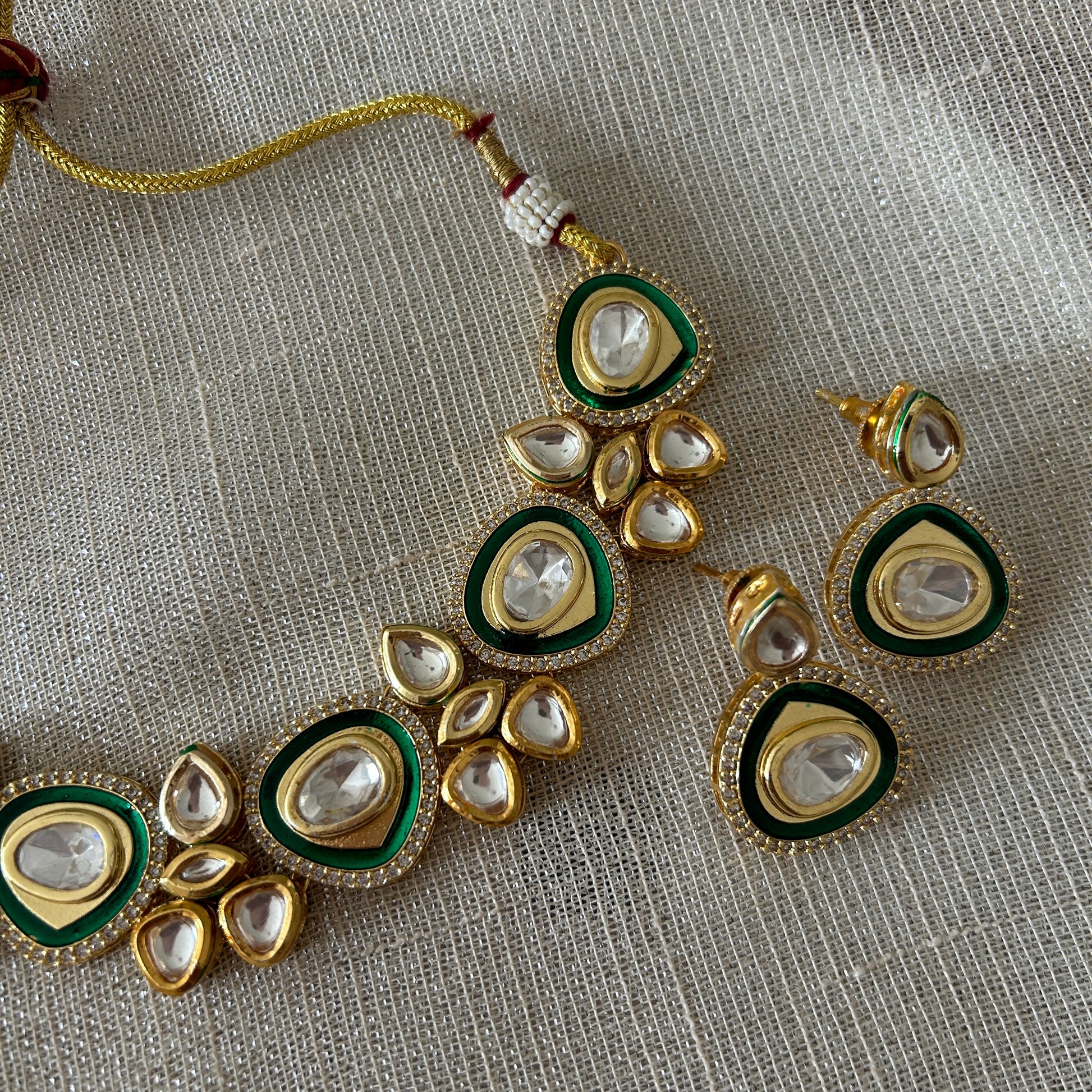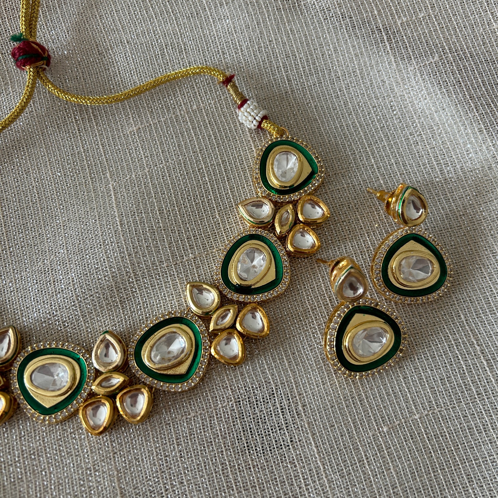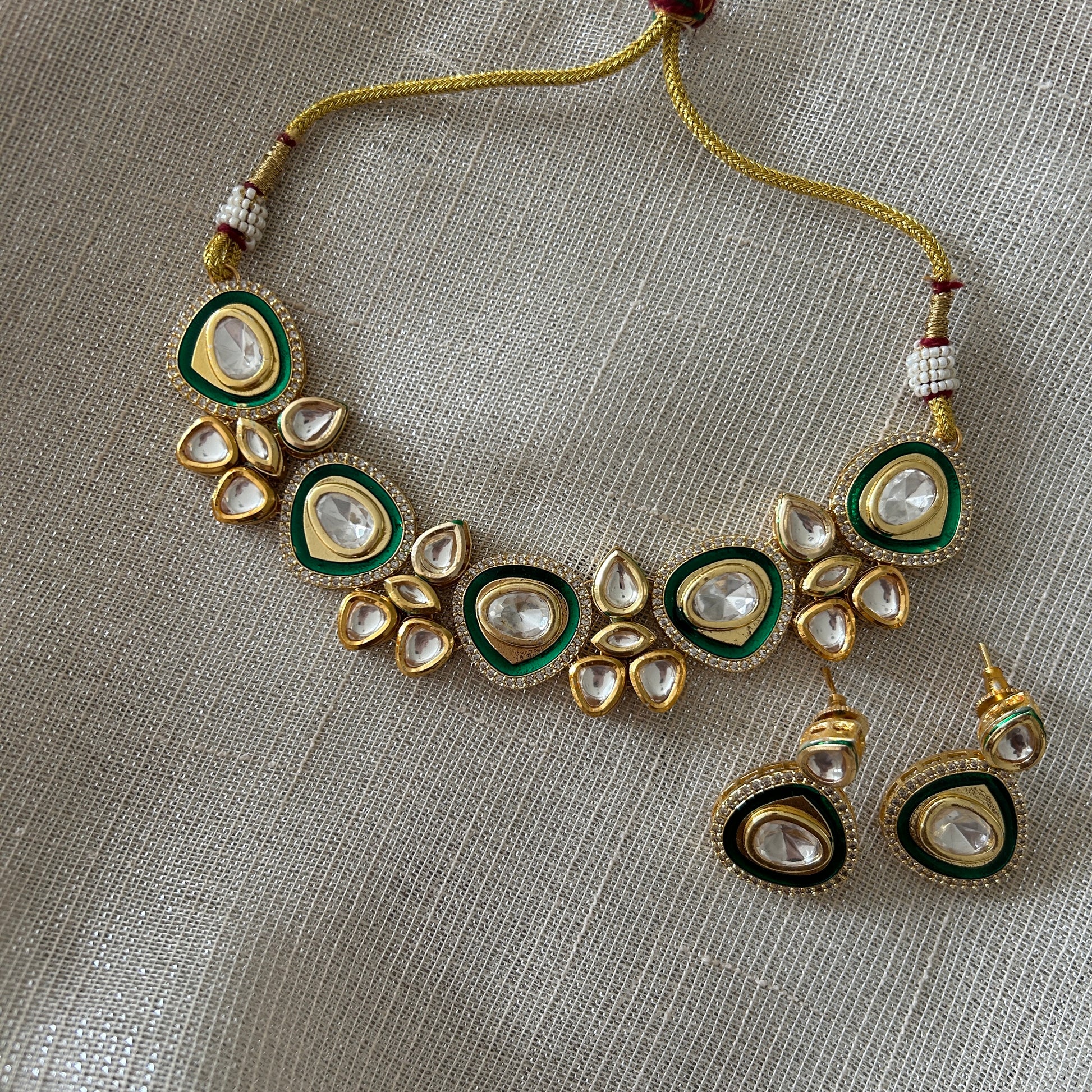 Make a statement with our new ayaan set. This lightweight set features beautiful emerald and clear stones on a gold-plated base. Easy to wear and perfect for any party occasion.