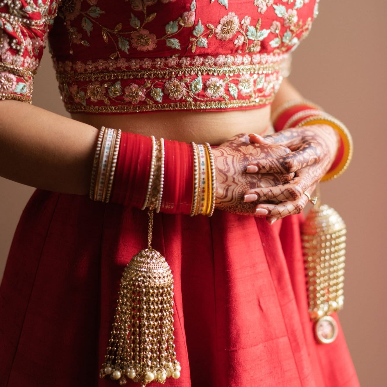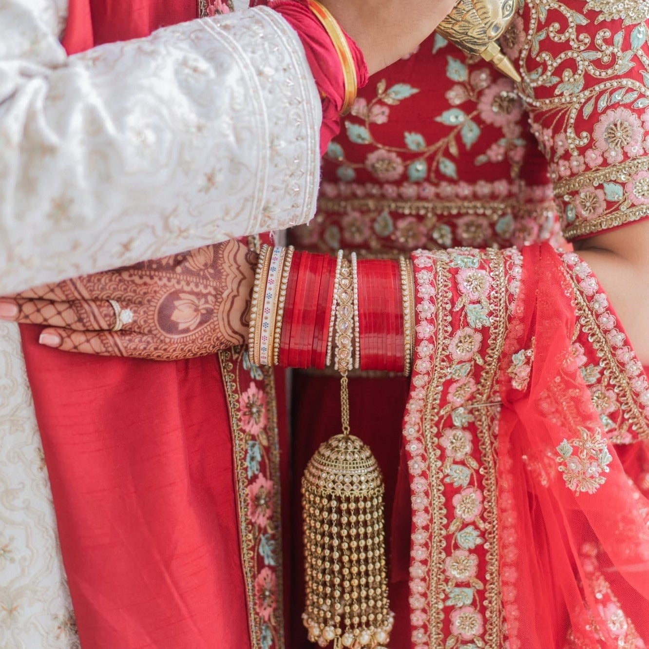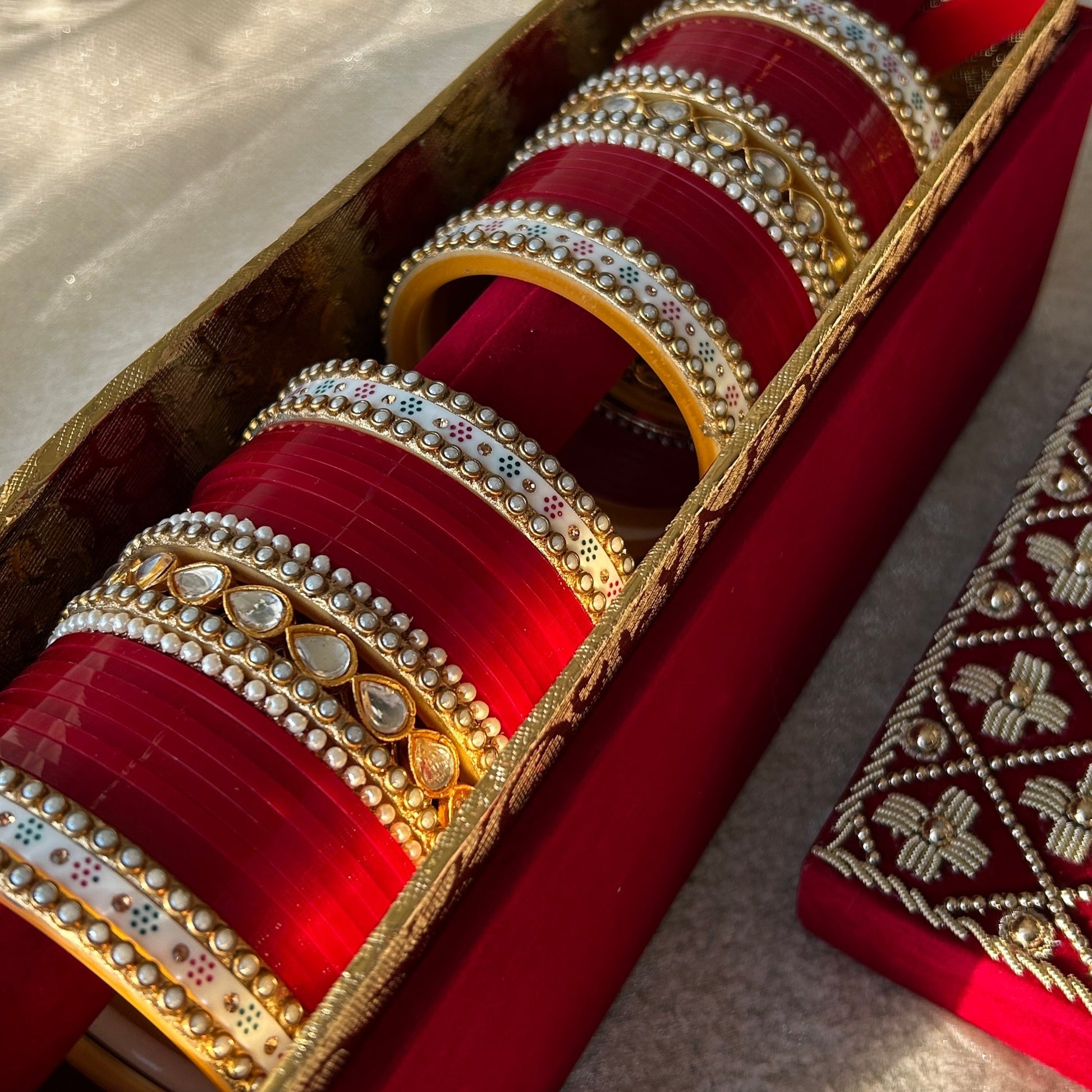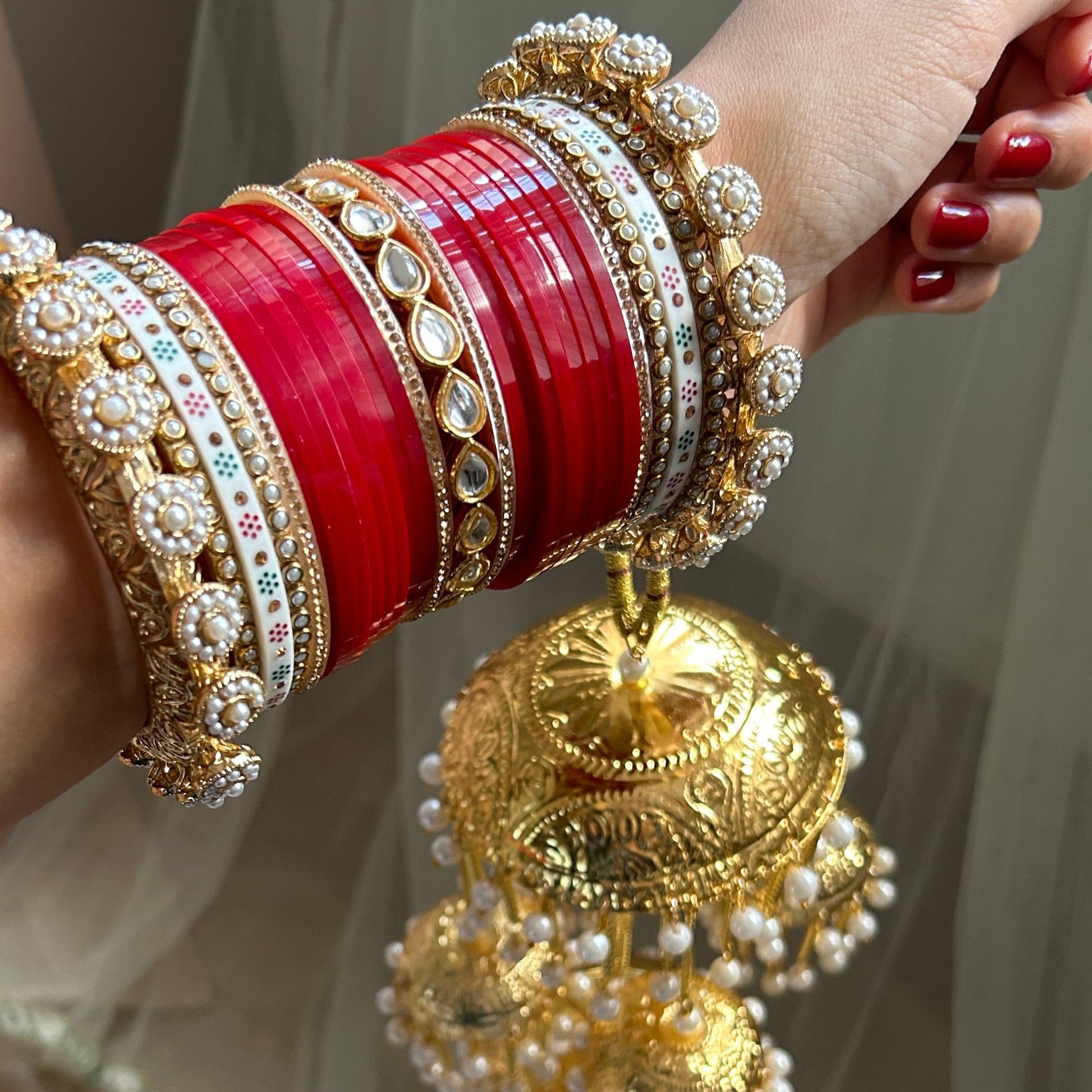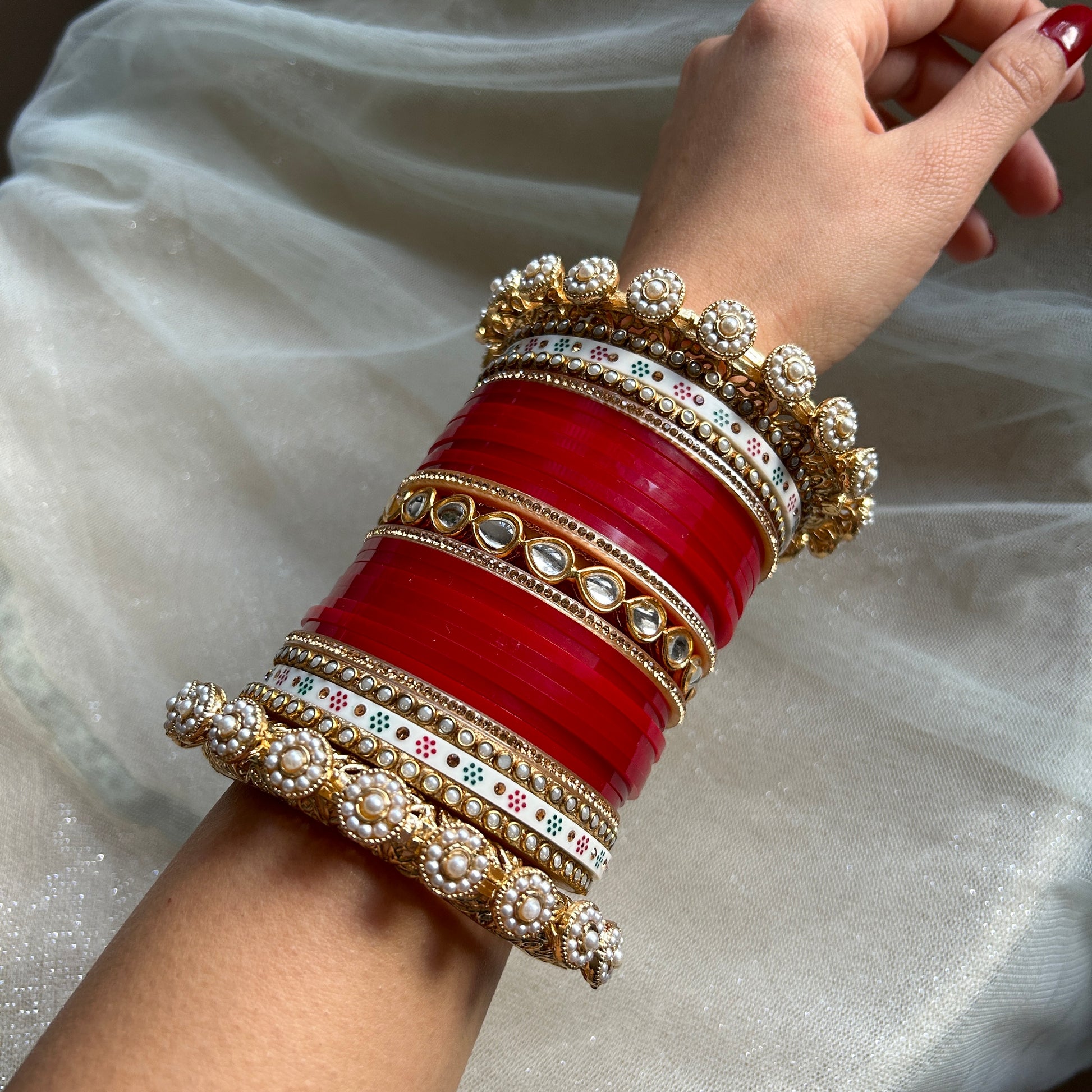 Regal wedding choora set in deep red featuring pearl and printed bindi elements for a traditional touch. A teardrop stone bangle breaks up the center and our bestselling flower kangan bangles are added to the ends for a statement finish. these are great to wear by themselves too.