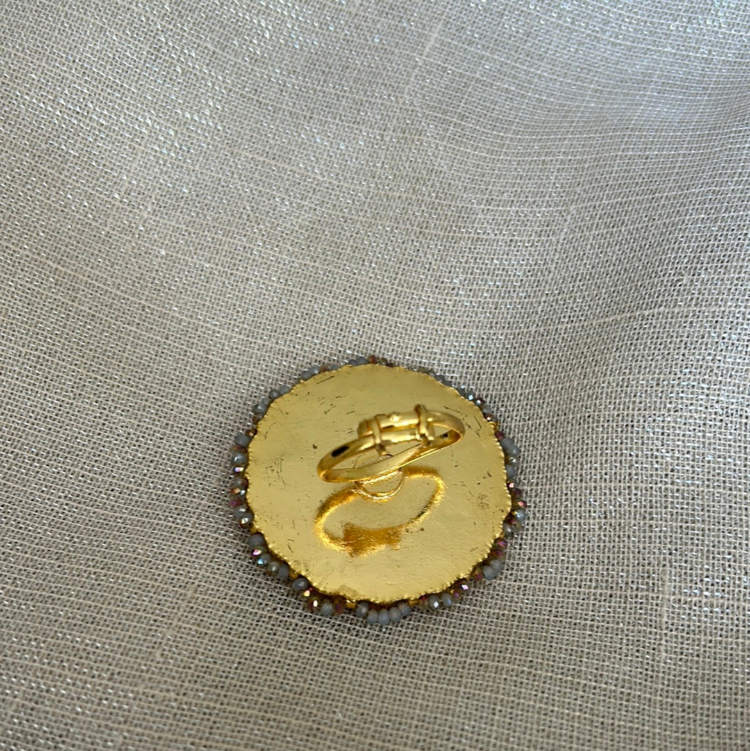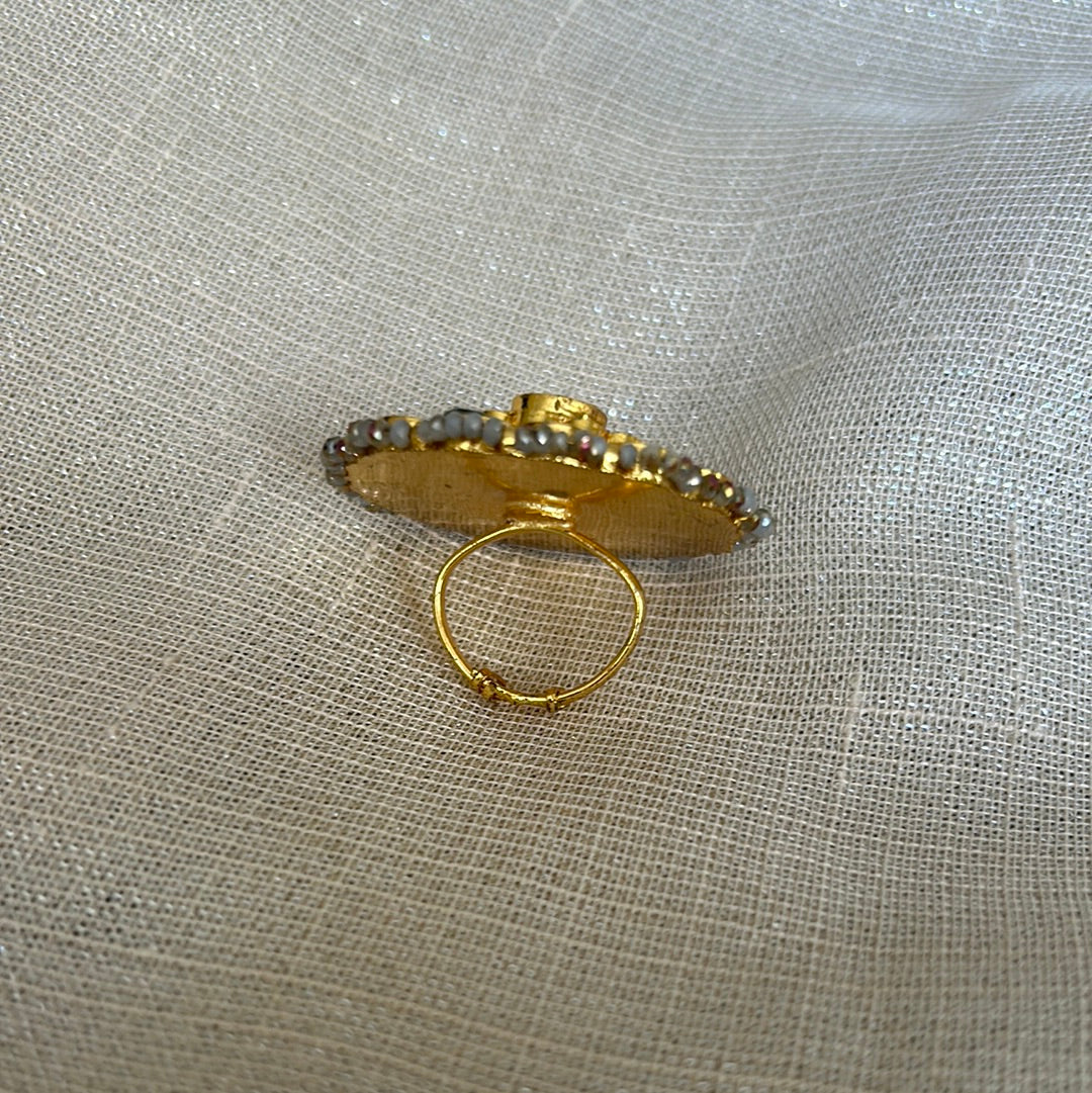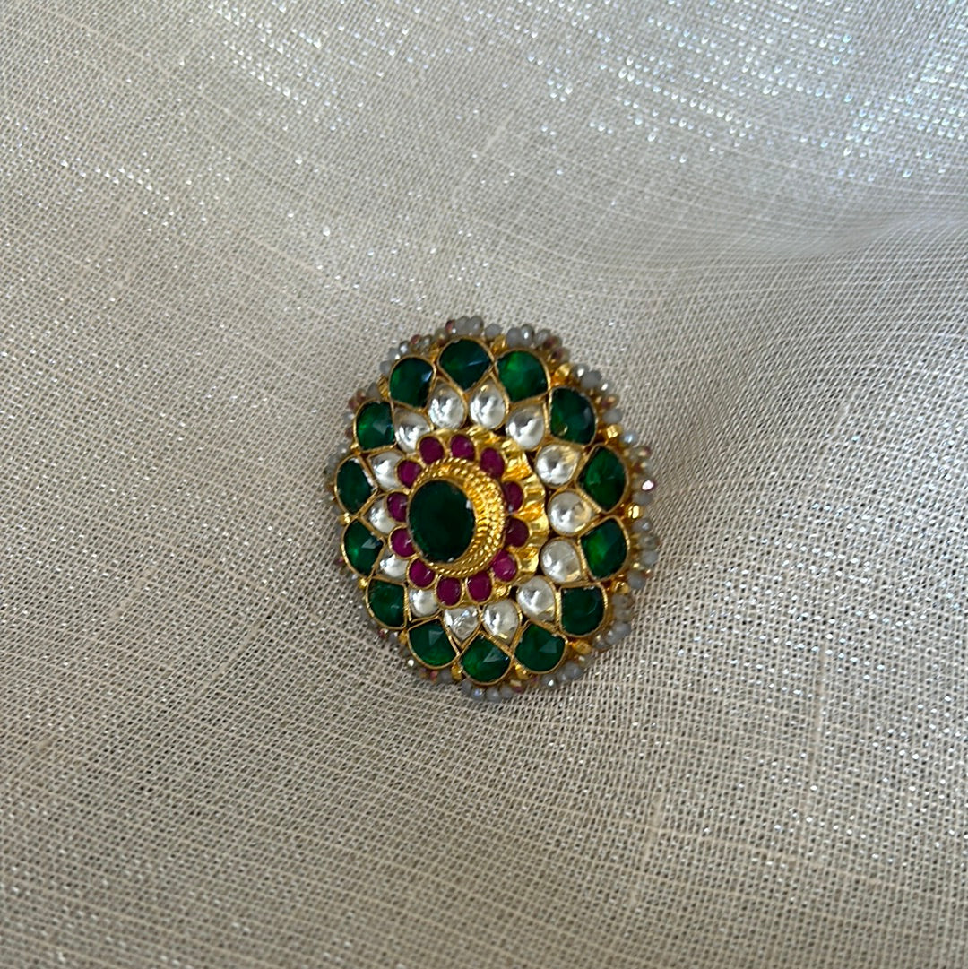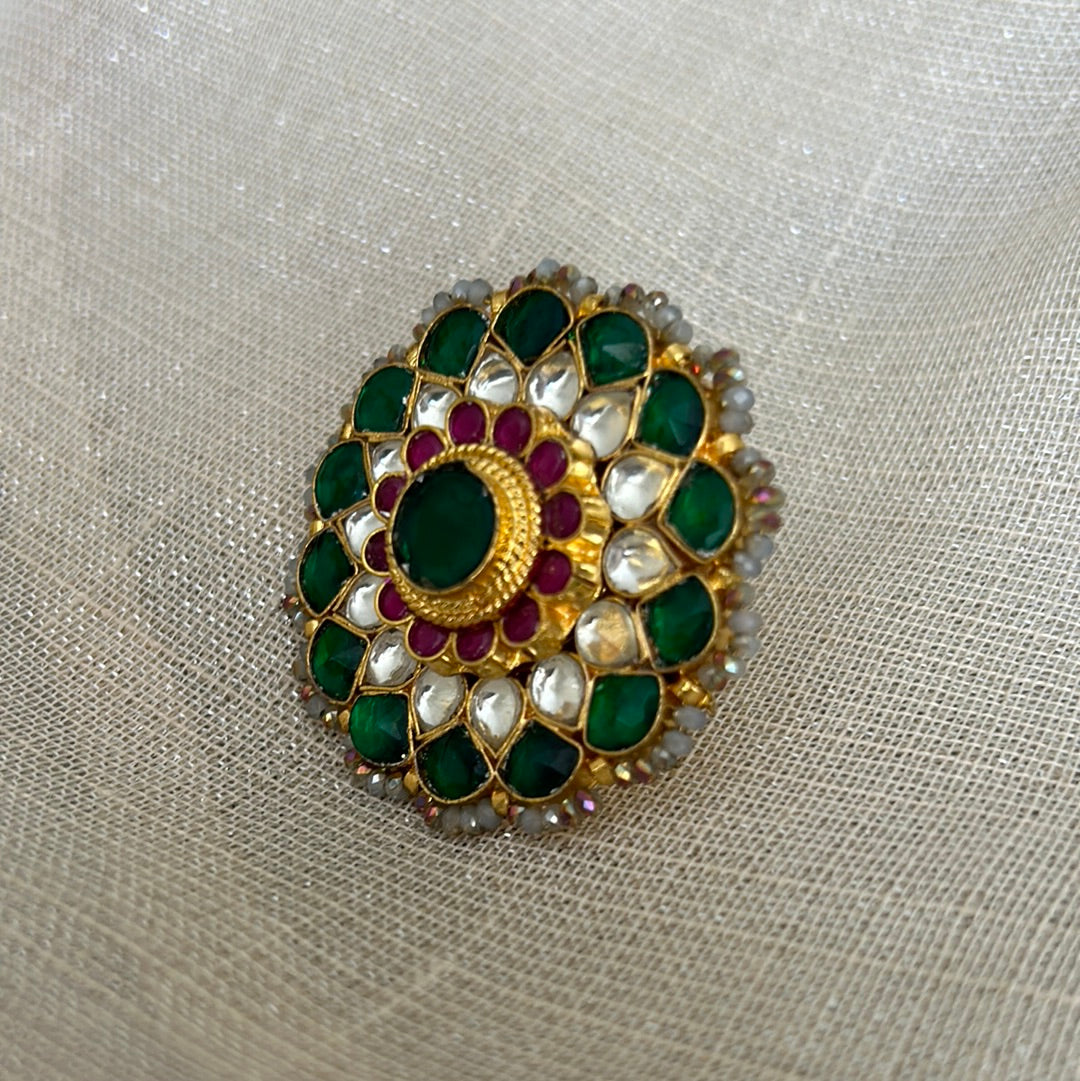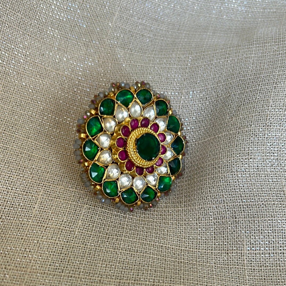 Gold plated large Kundan ring in emerald, clear and ruby stones.
