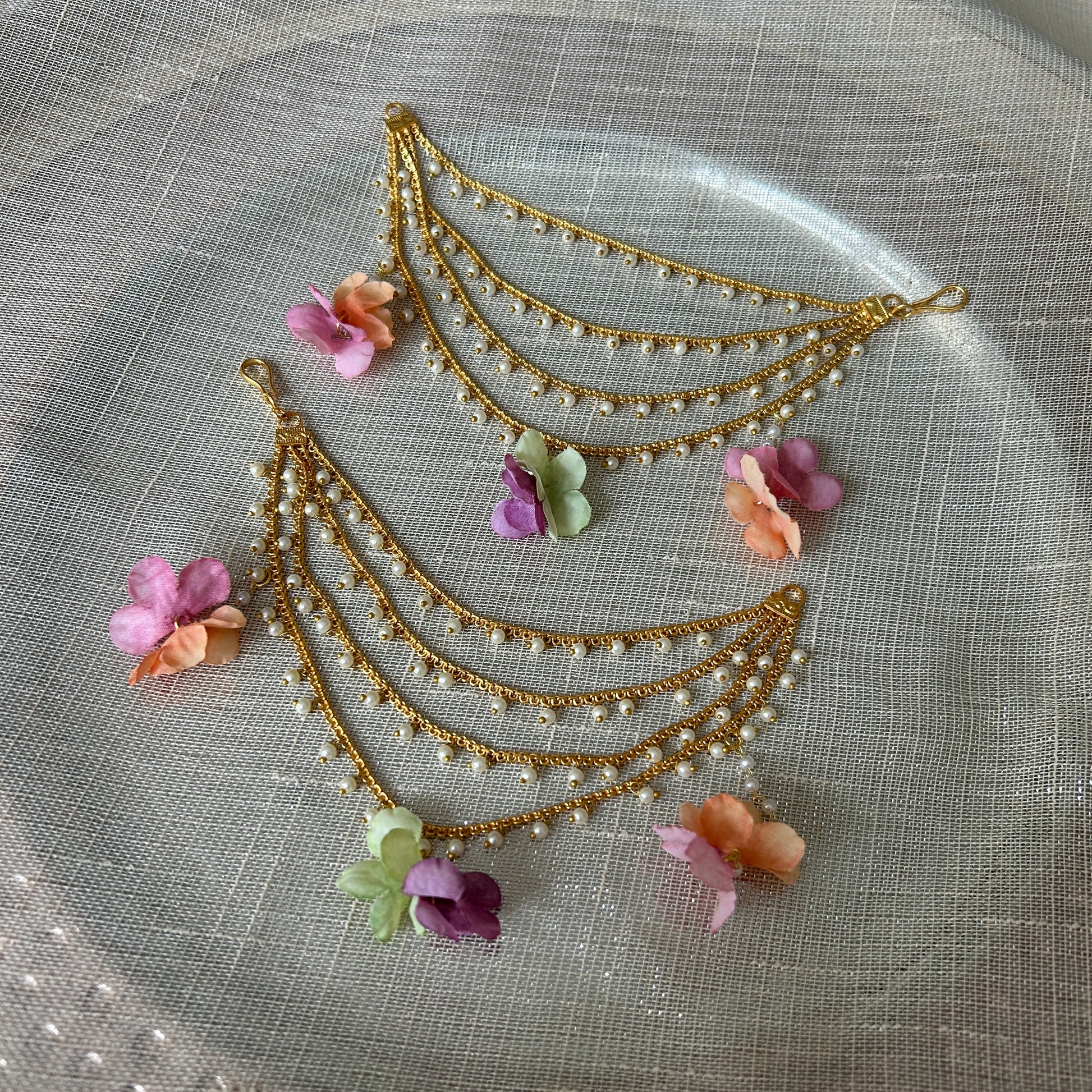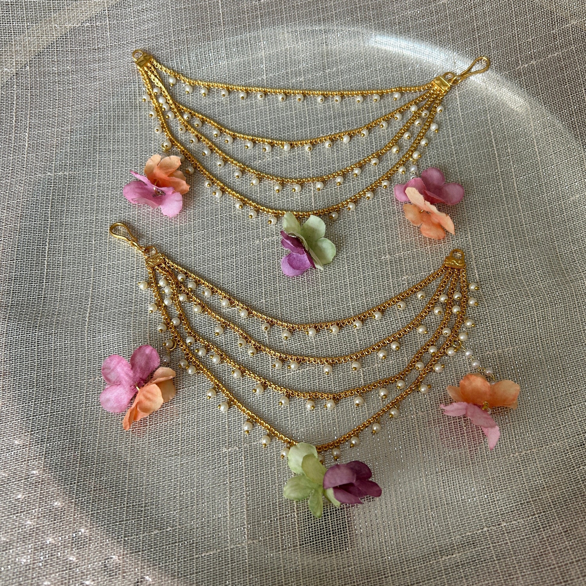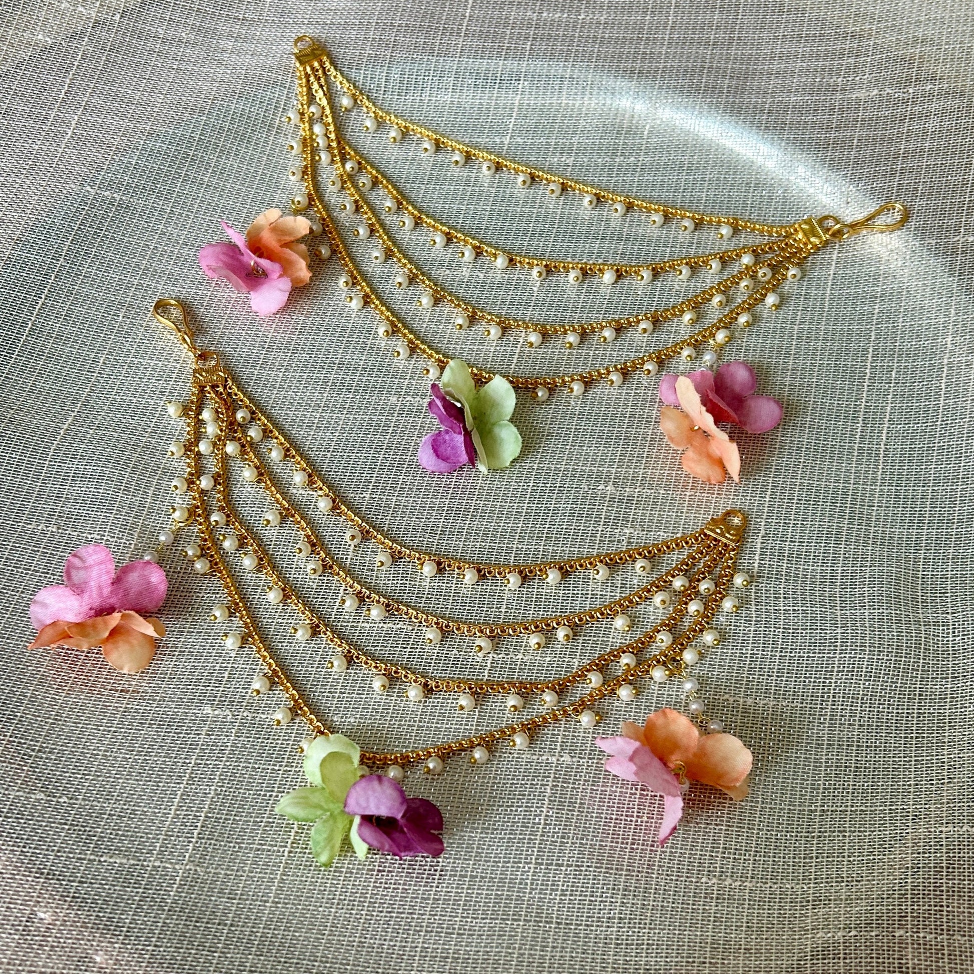 Custom designed sahare topped with pastel coloured faux flowers. Perfect for Sangeet and Mehndi functions for a fun and playful look.