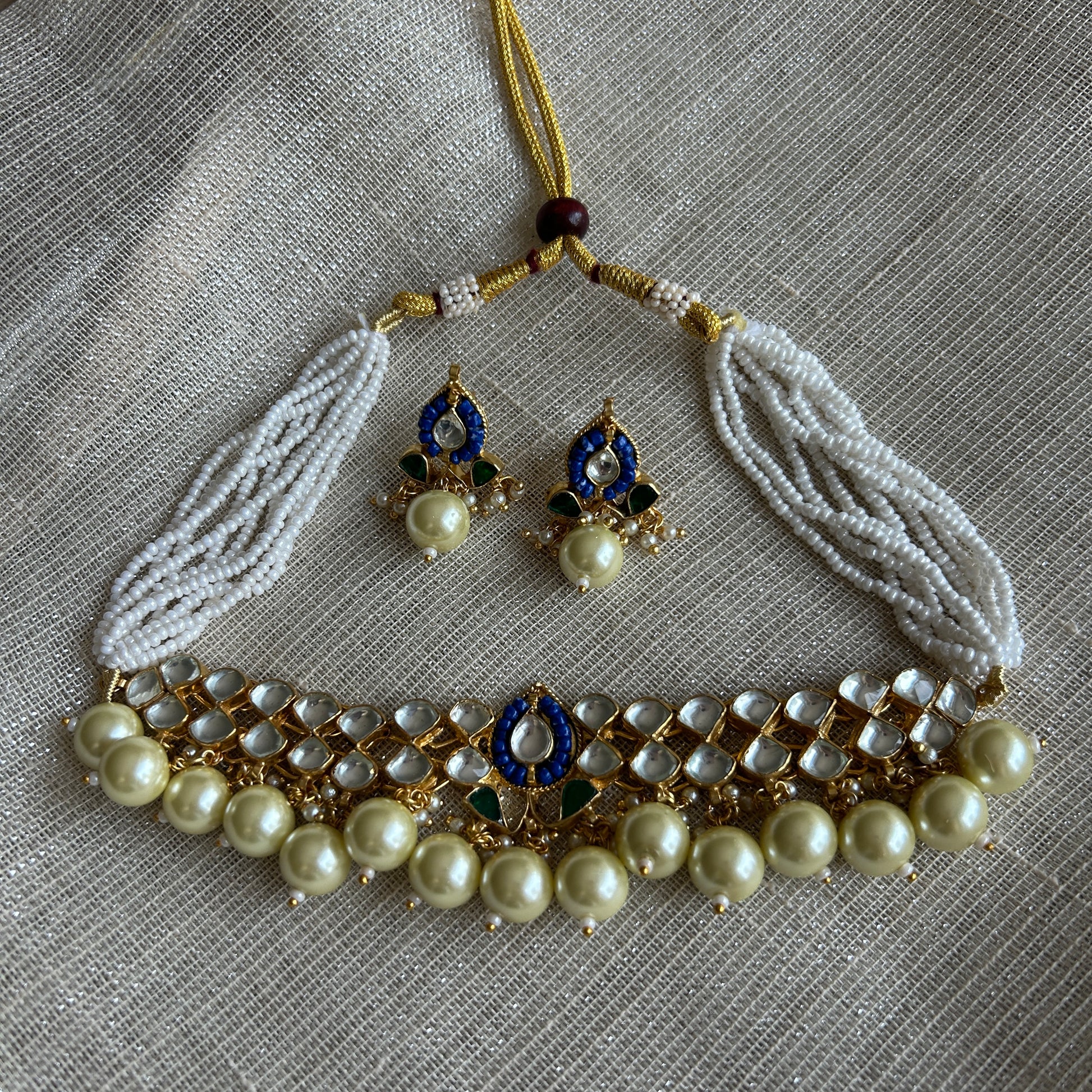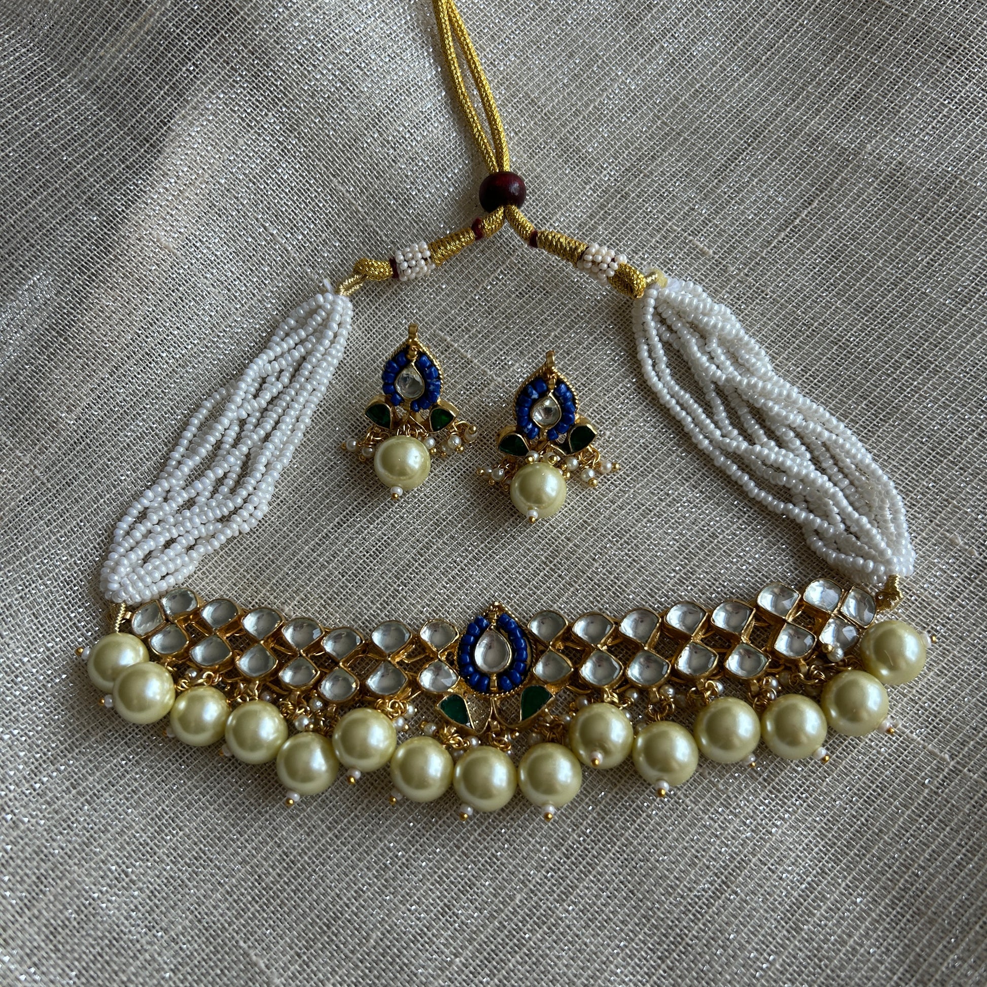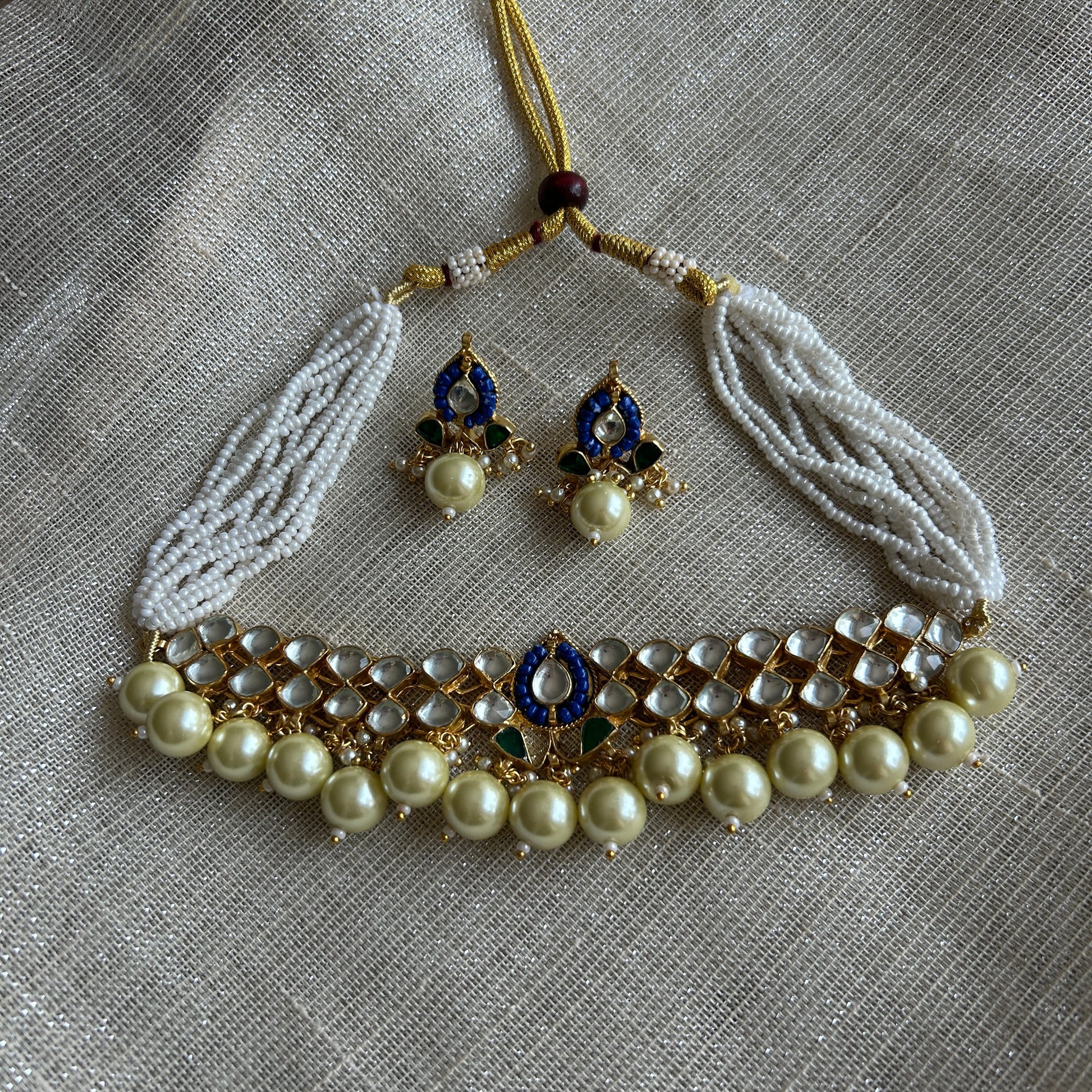 Elevate your look with our Haroon Kundan Set designed with lustrous pearls and a teardrop center featuring blue beads for a pop of fun colour. Ideal for indian party occasions, pair this choker set with any outfit.