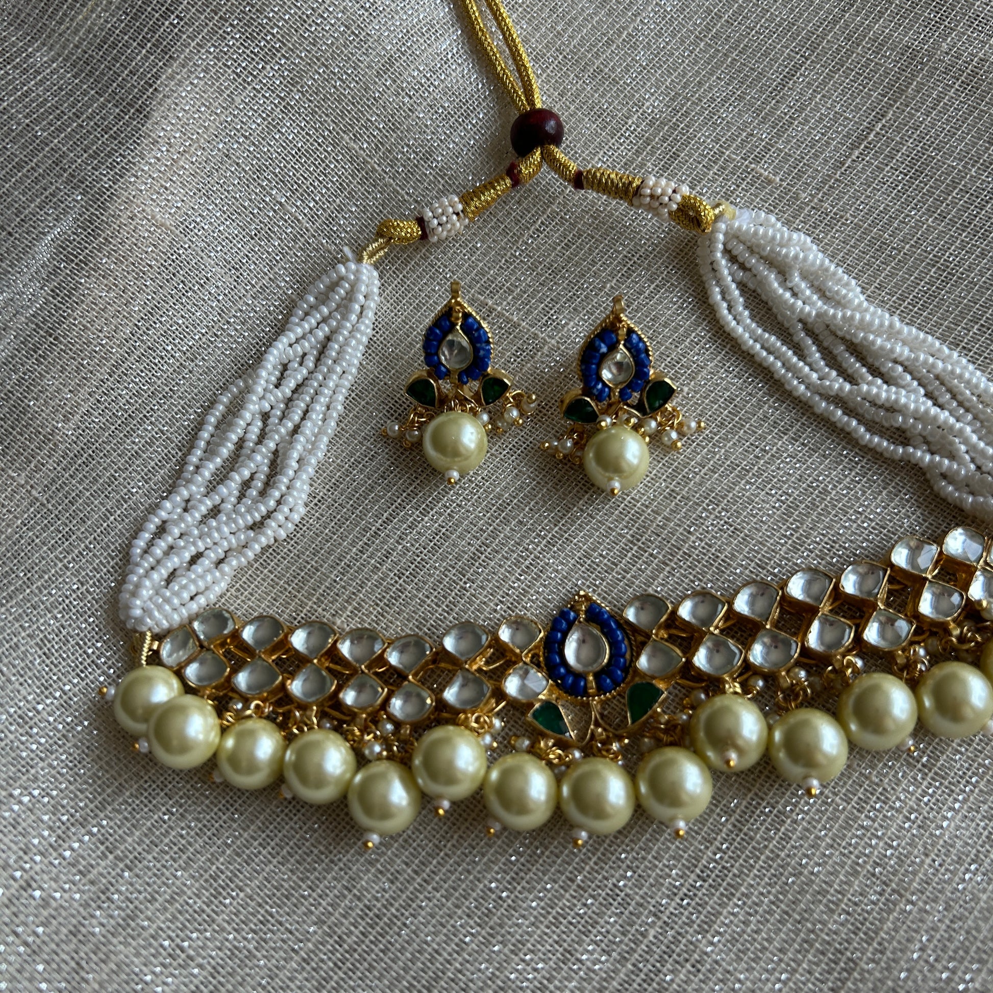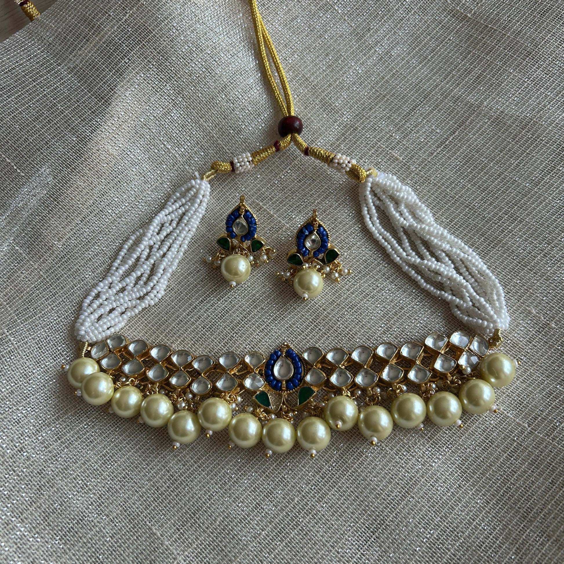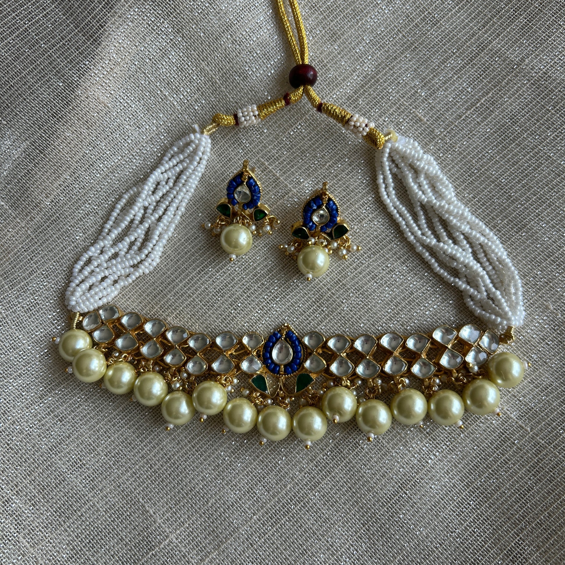 Elevate your look with our Haroon Kundan Set designed with lustrous pearls and a teardrop center featuring blue beads for a pop of fun colour. Ideal for indian party occasions, pair this choker set with any outfit.