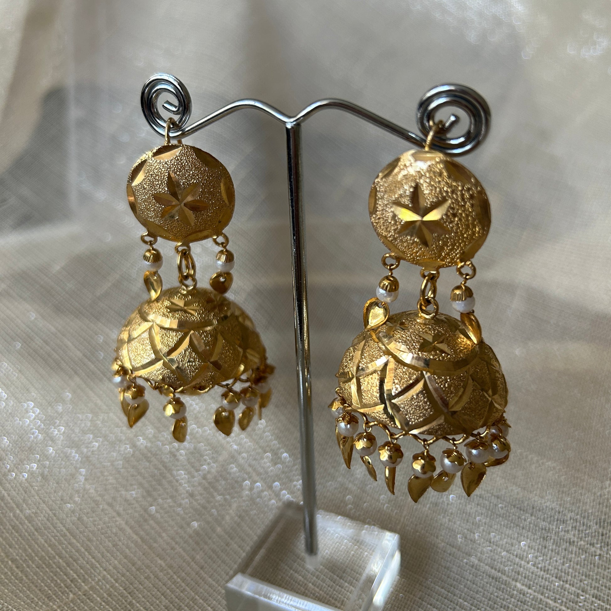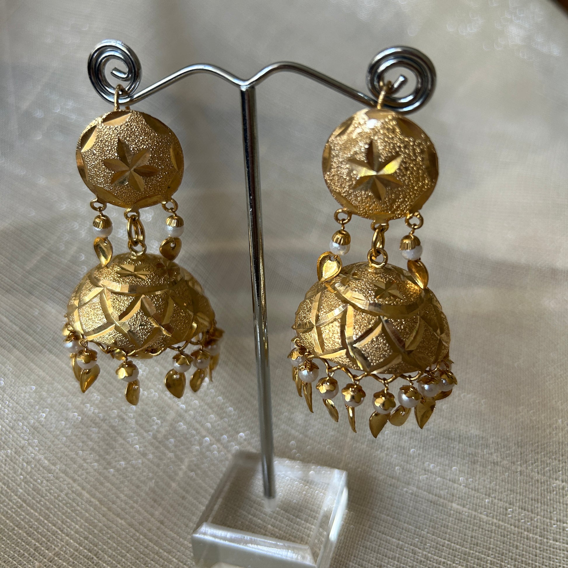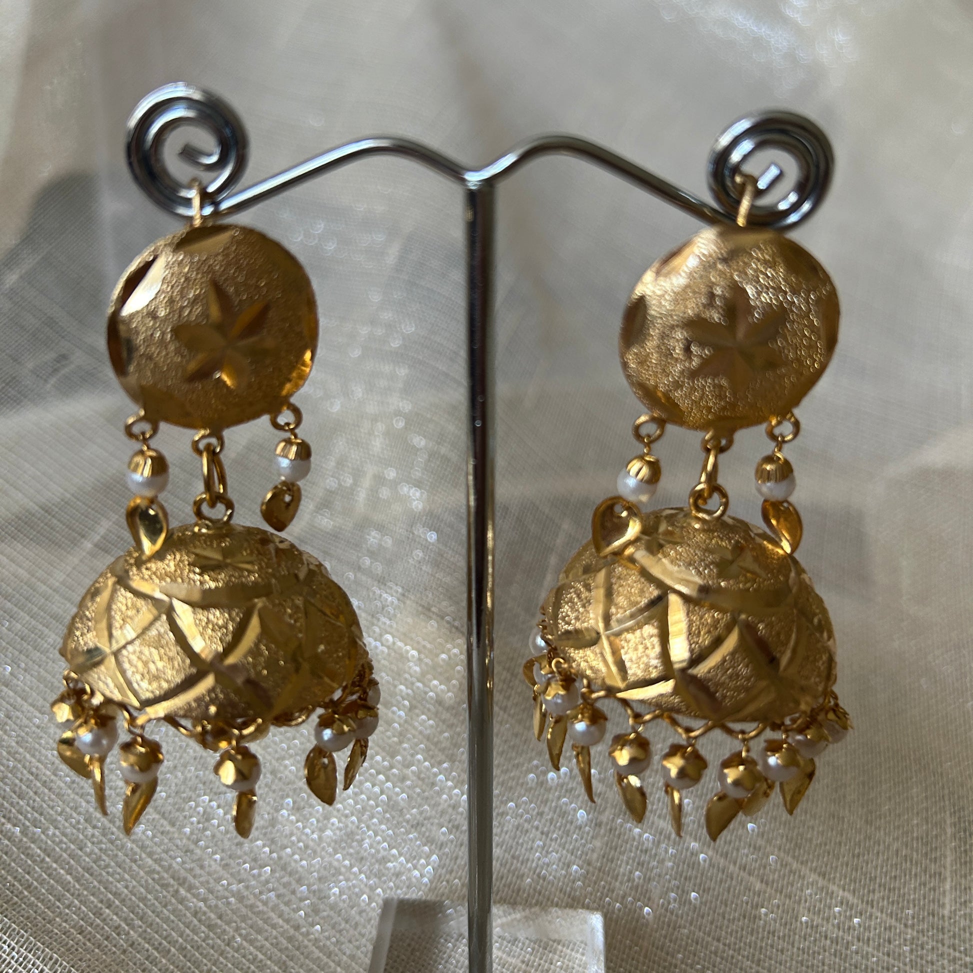 Pair of golden jhumki earrings in pippal patti. Perfect for Sangeet and jago parties.