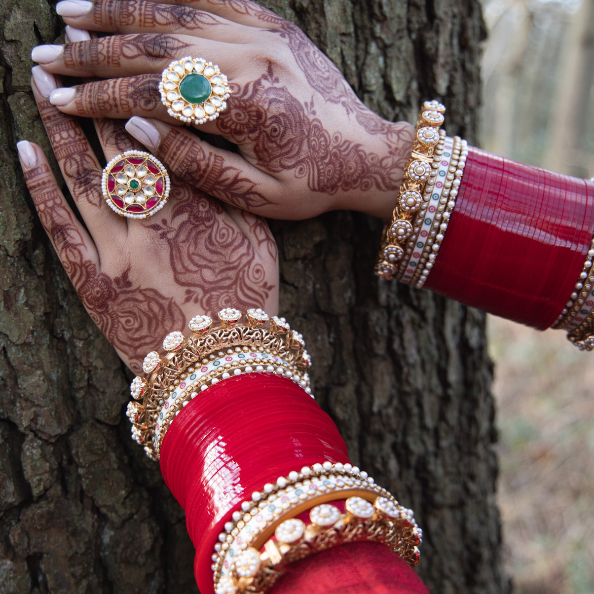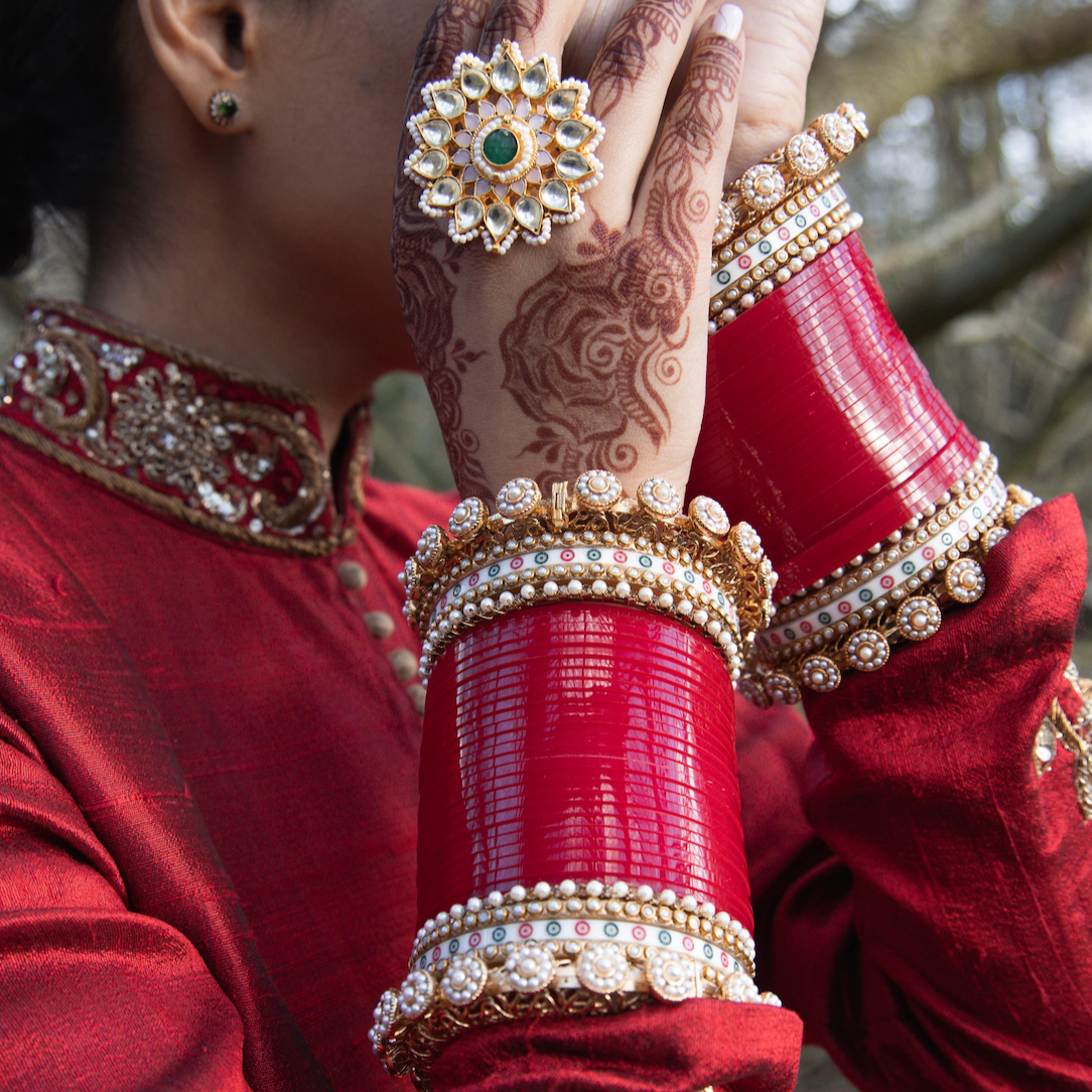 Regal wedding choora set in deep red featuring pearl and printed bindi elements for a traditional touch. we have added our bestselling flower pearl kangan on the ends for a statement finish. these are great to wear by themselves too.