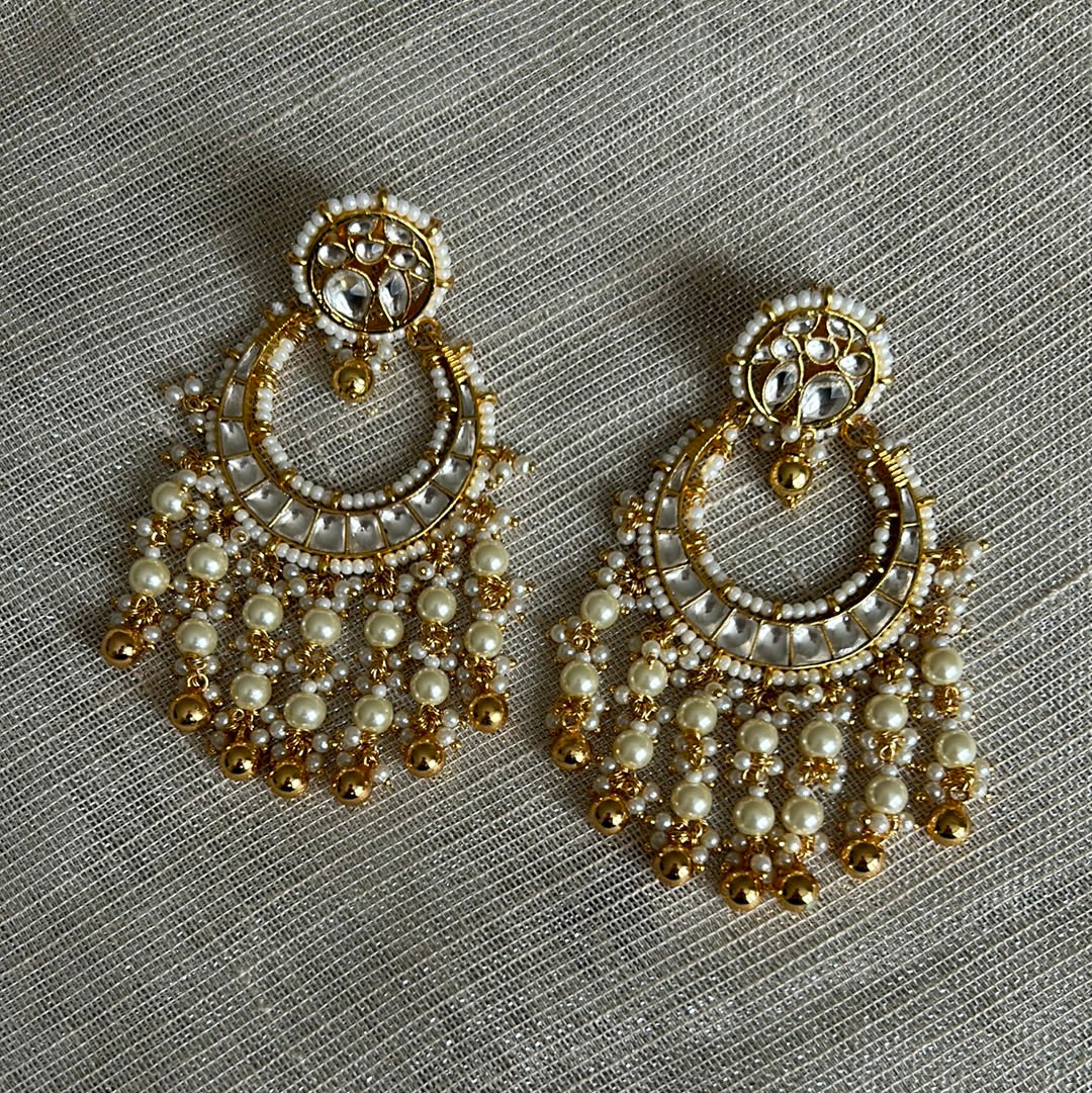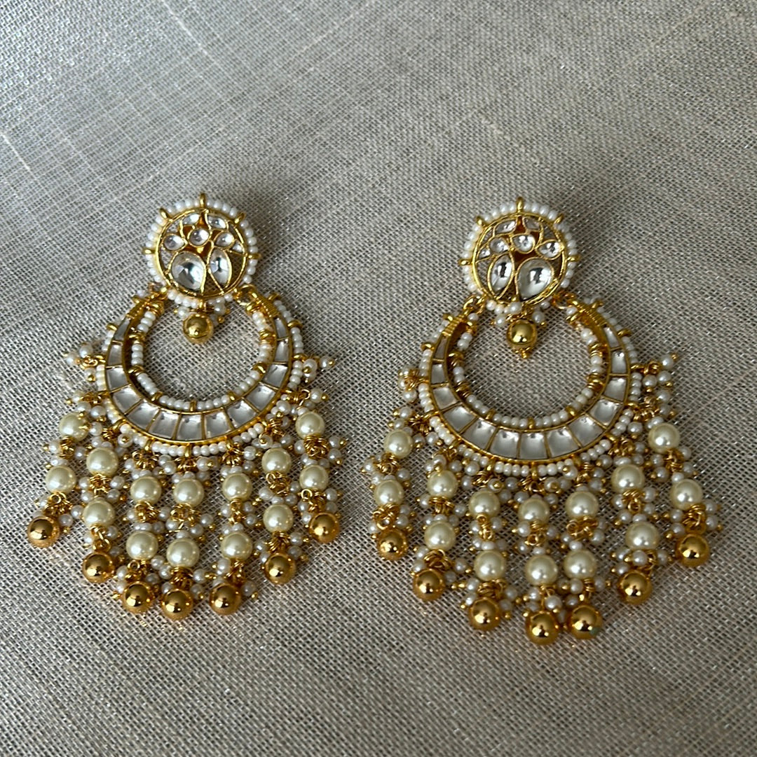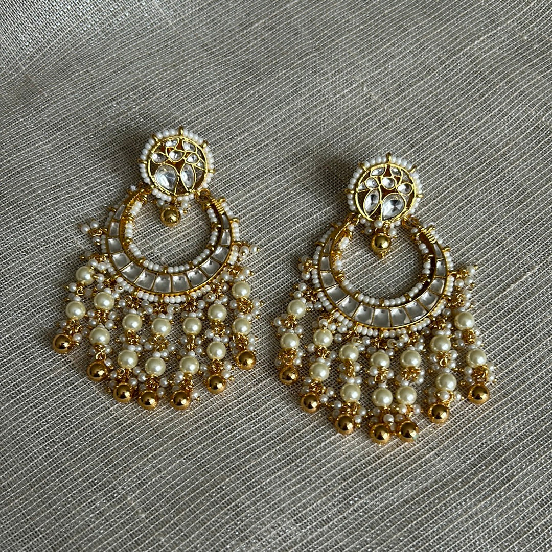 Classic kundan chandbali earrings in a round design with pearls and gold beads.
