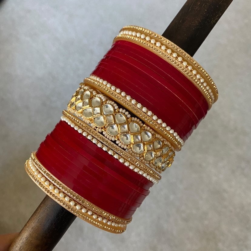 Regal wedding choora set in deep red featuring pearl and printed bindi elements for a traditional touch. Statement paachi Kundan bangles take center stage in this stunning design. these are great to wear by themselves too.