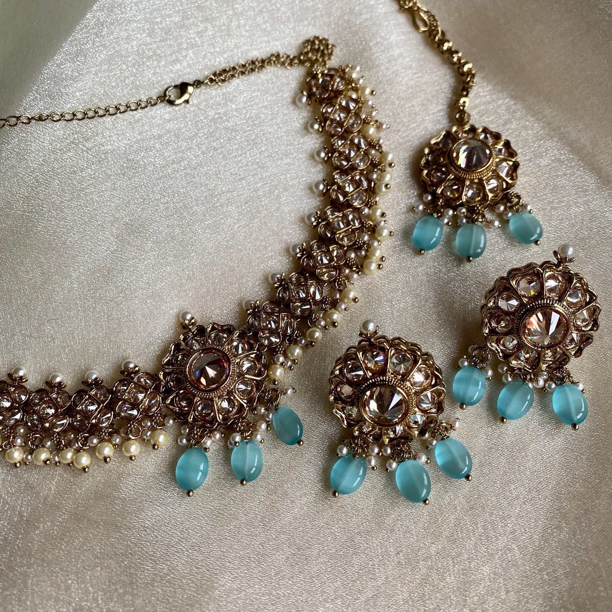 Necklace set in golden polki stones with matching round earrings and tikka. Comes in a variety of colours.