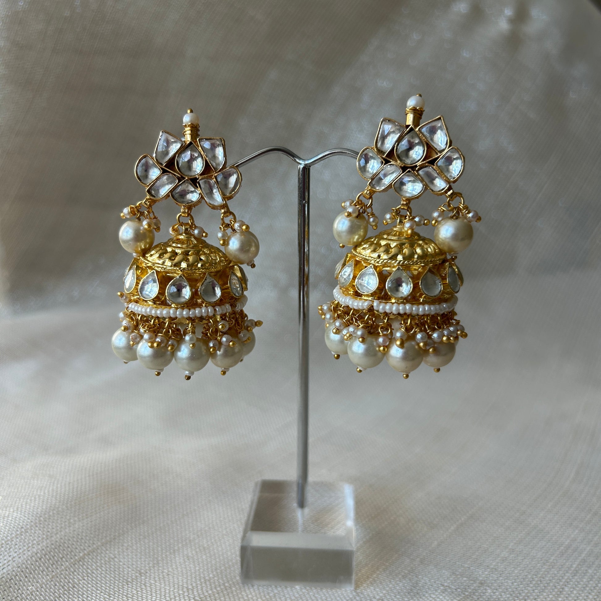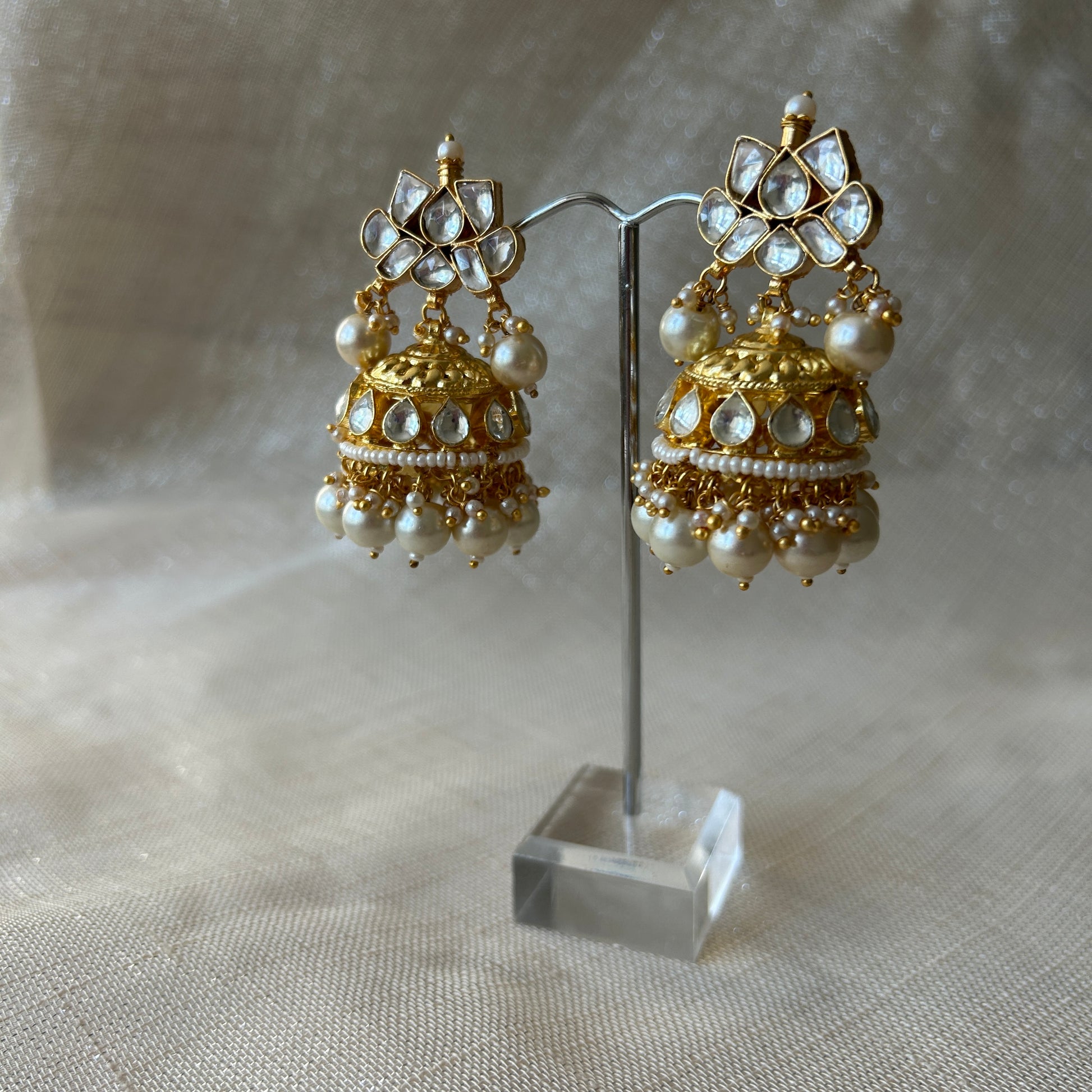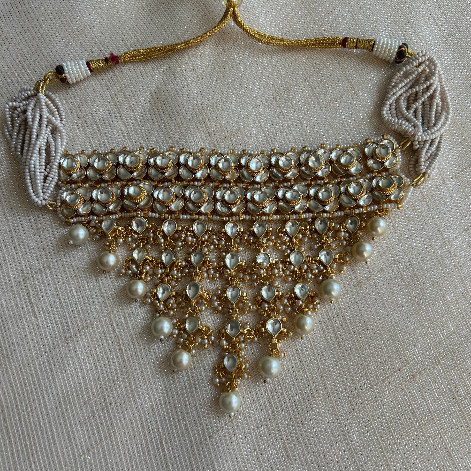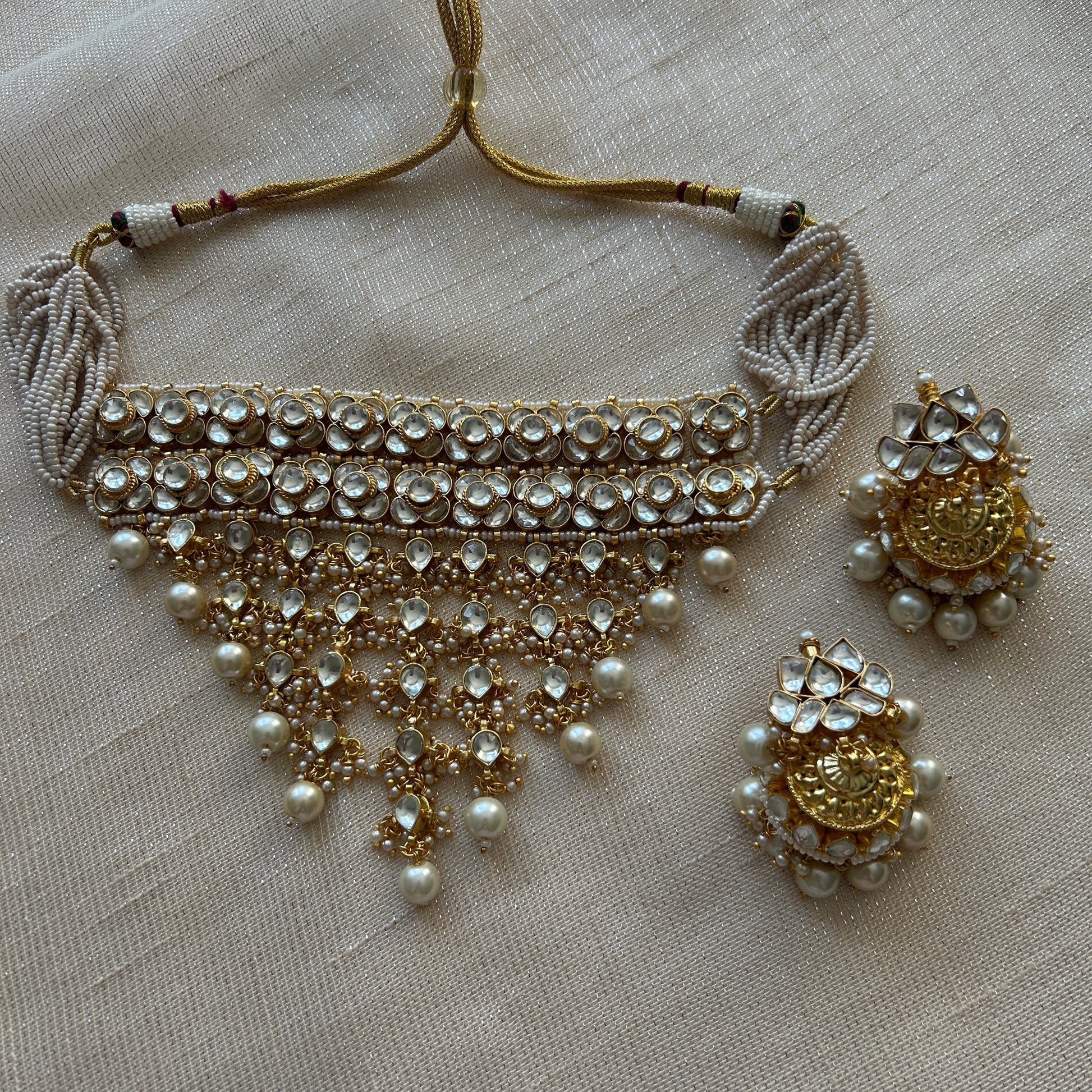 Elevate your jewellery collection with our new SANYAIR SET. Featuring a timeless design, the statement pendant necklace and matching earrings are crafted in paachi Kundan stones and delicate pearl trims.