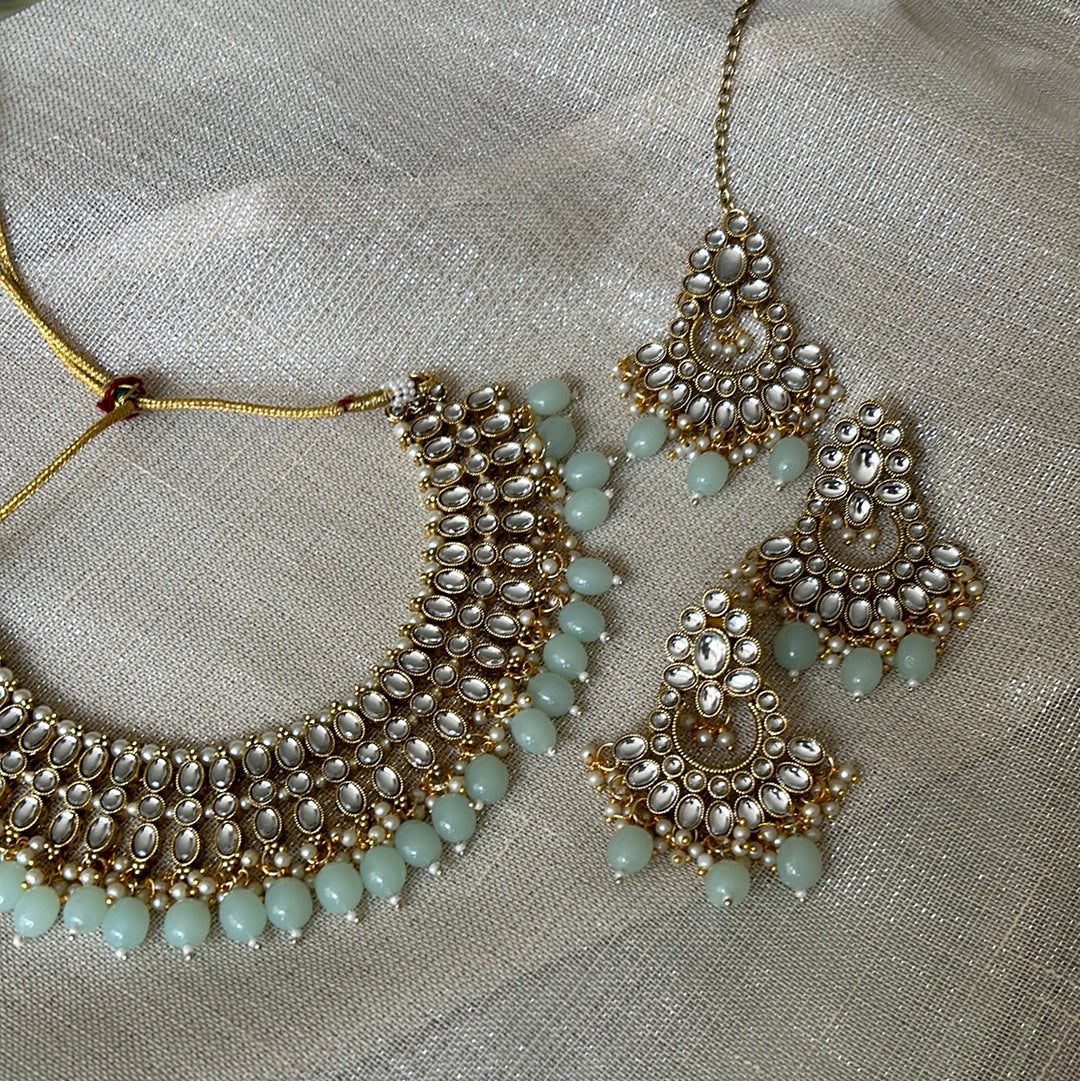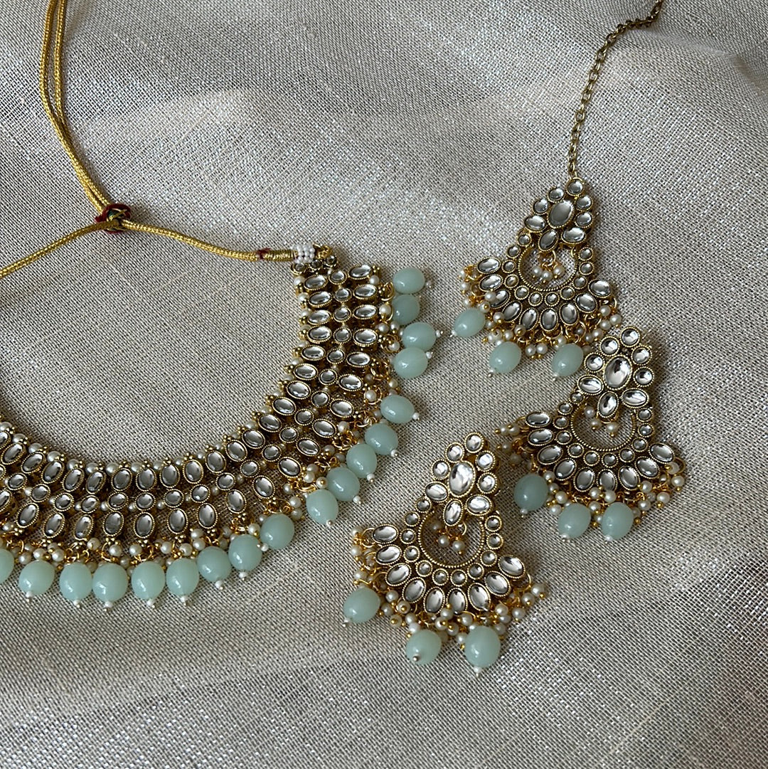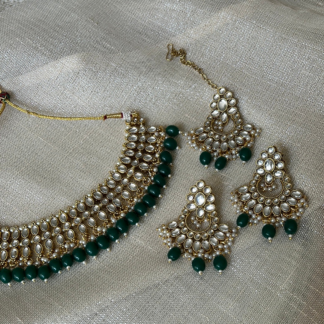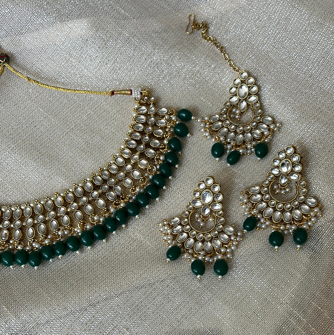 A classic style to complement any Indian outfit. Silver coloured stones on a gold base with bead details. Choose from emerald, baby pink, mint or classic pearls. Matching earrings and tikka complete the set.