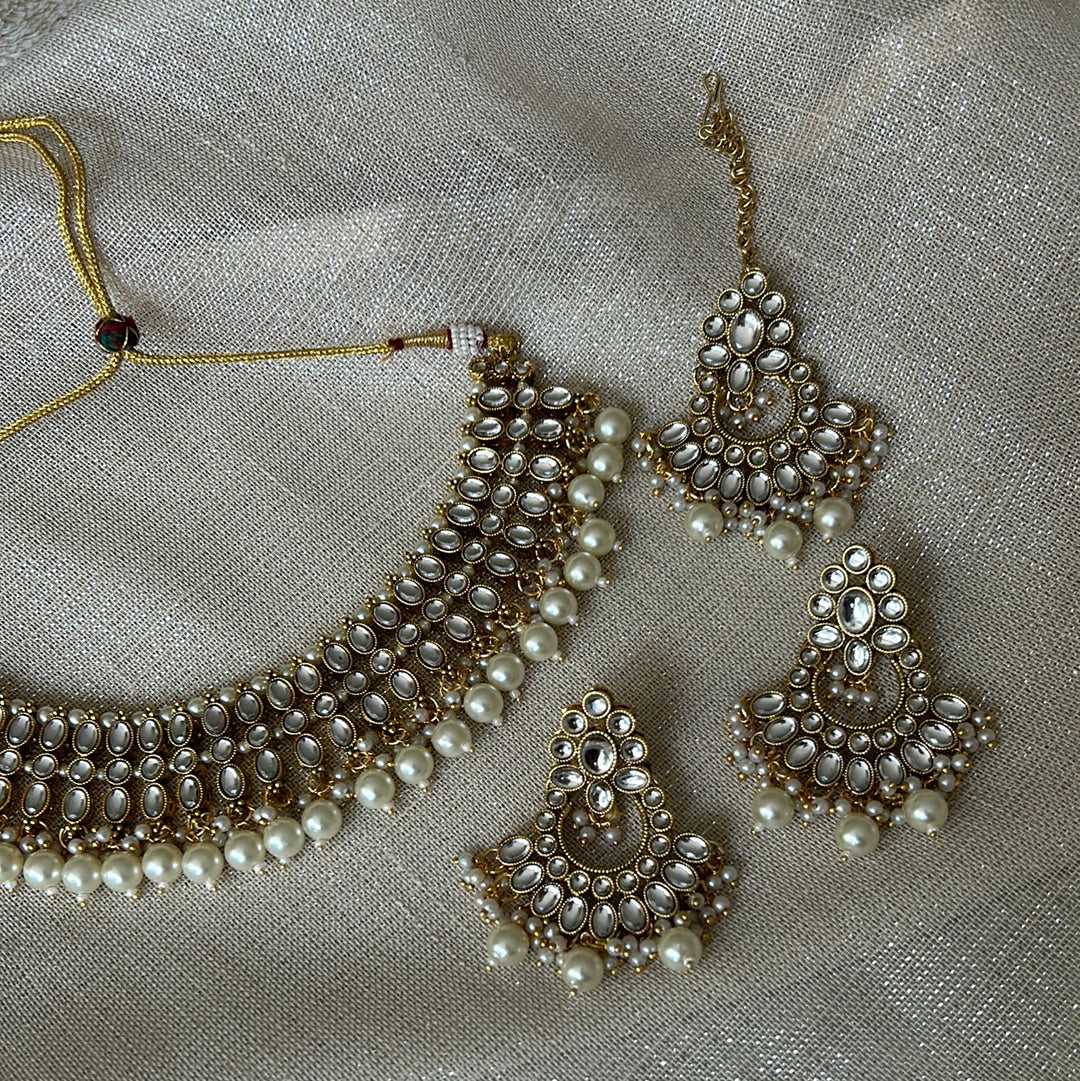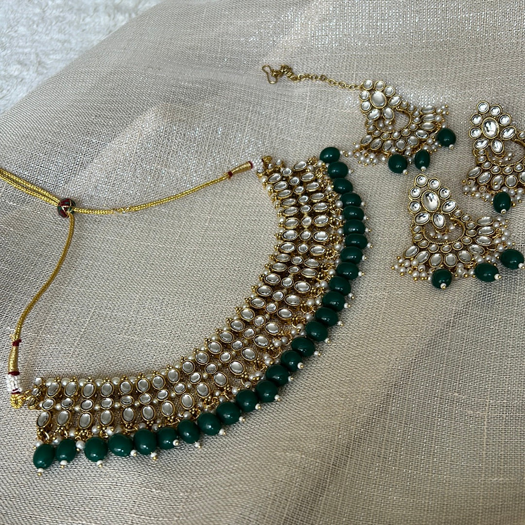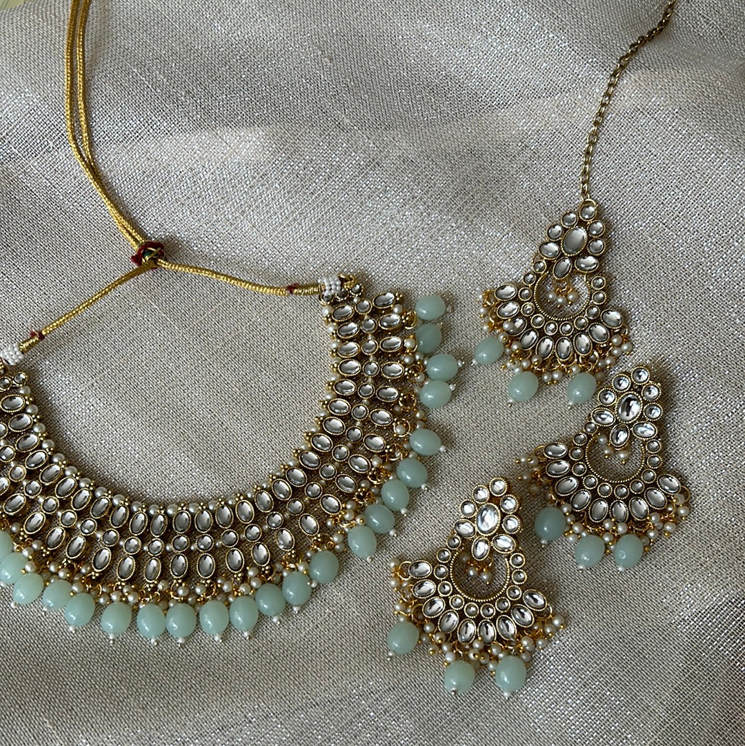 A classic style to complement any Indian outfit. Silver coloured stones on a gold base with bead details. Choose from emerald, baby pink, mint or classic pearls. Matching earrings and tikka complete the set.