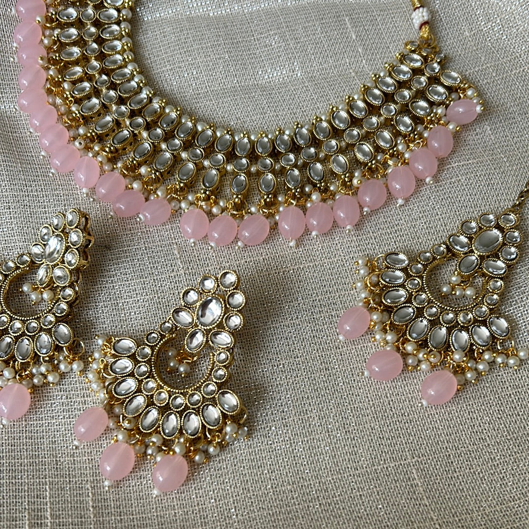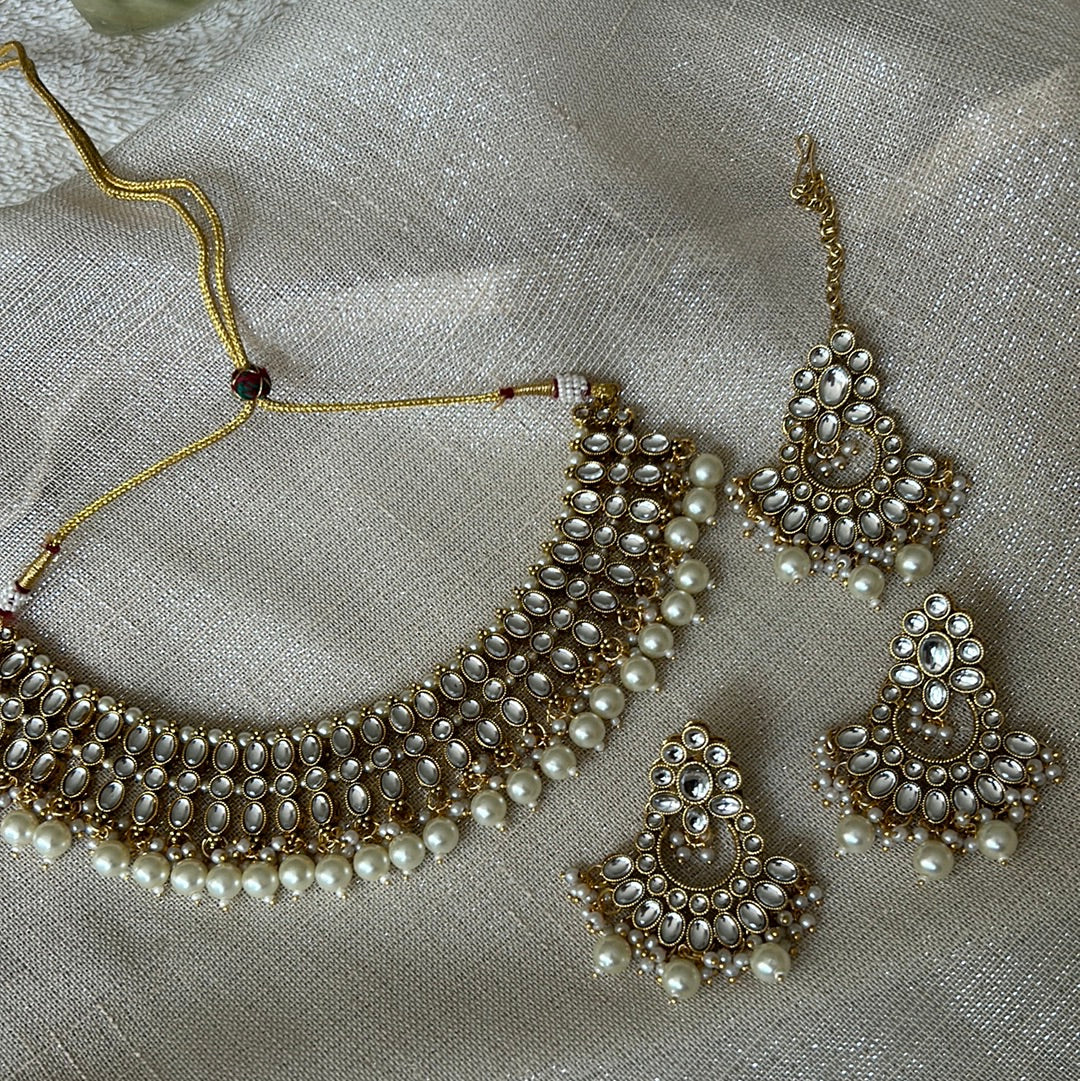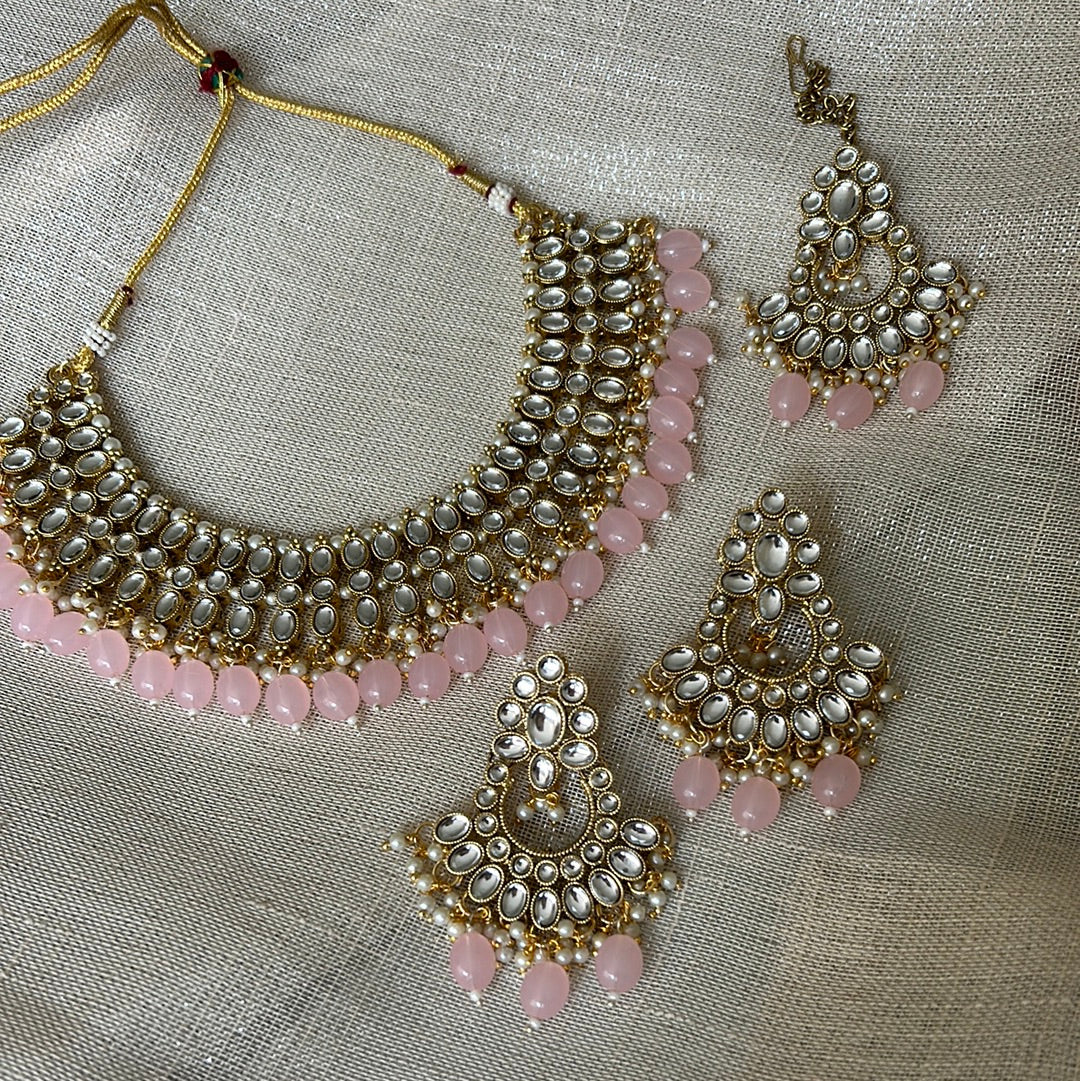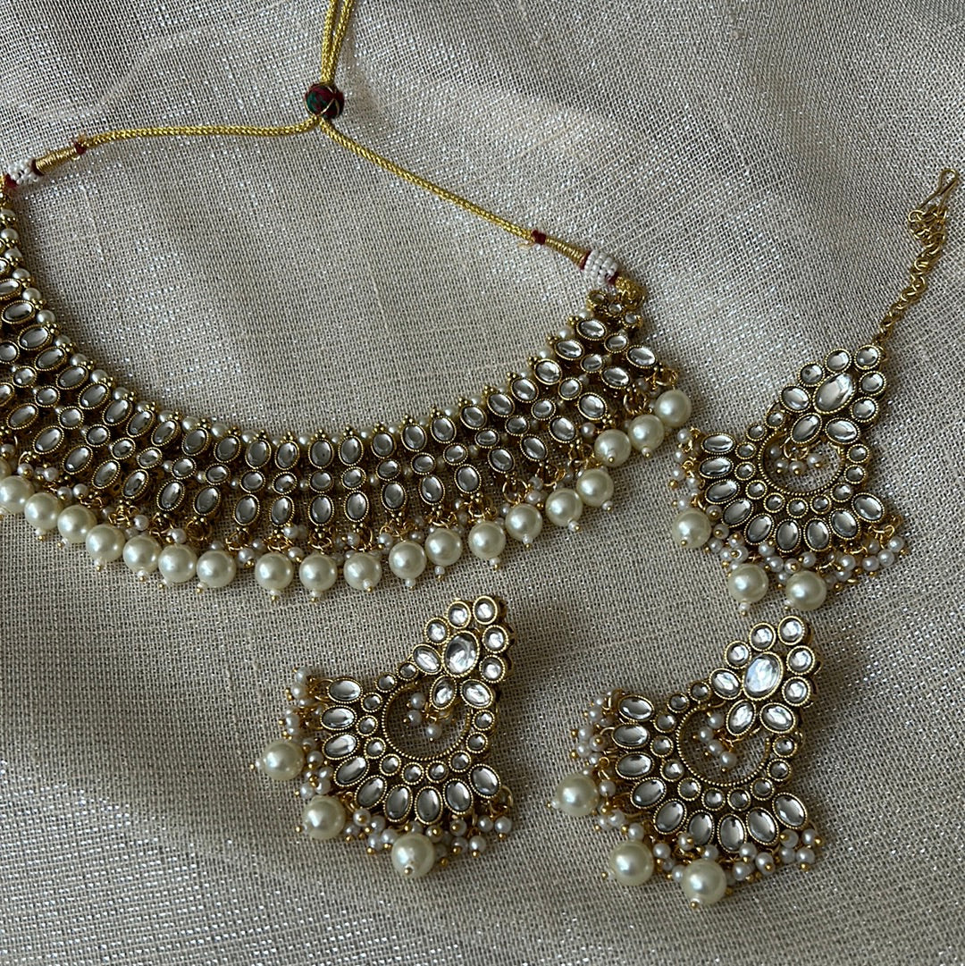 A classic style to complement any Indian outfit. Silver coloured stones on a gold base with bead details. Choose from emerald, baby pink, mint or classic pearls. Matching earrings and tikka complete the set.