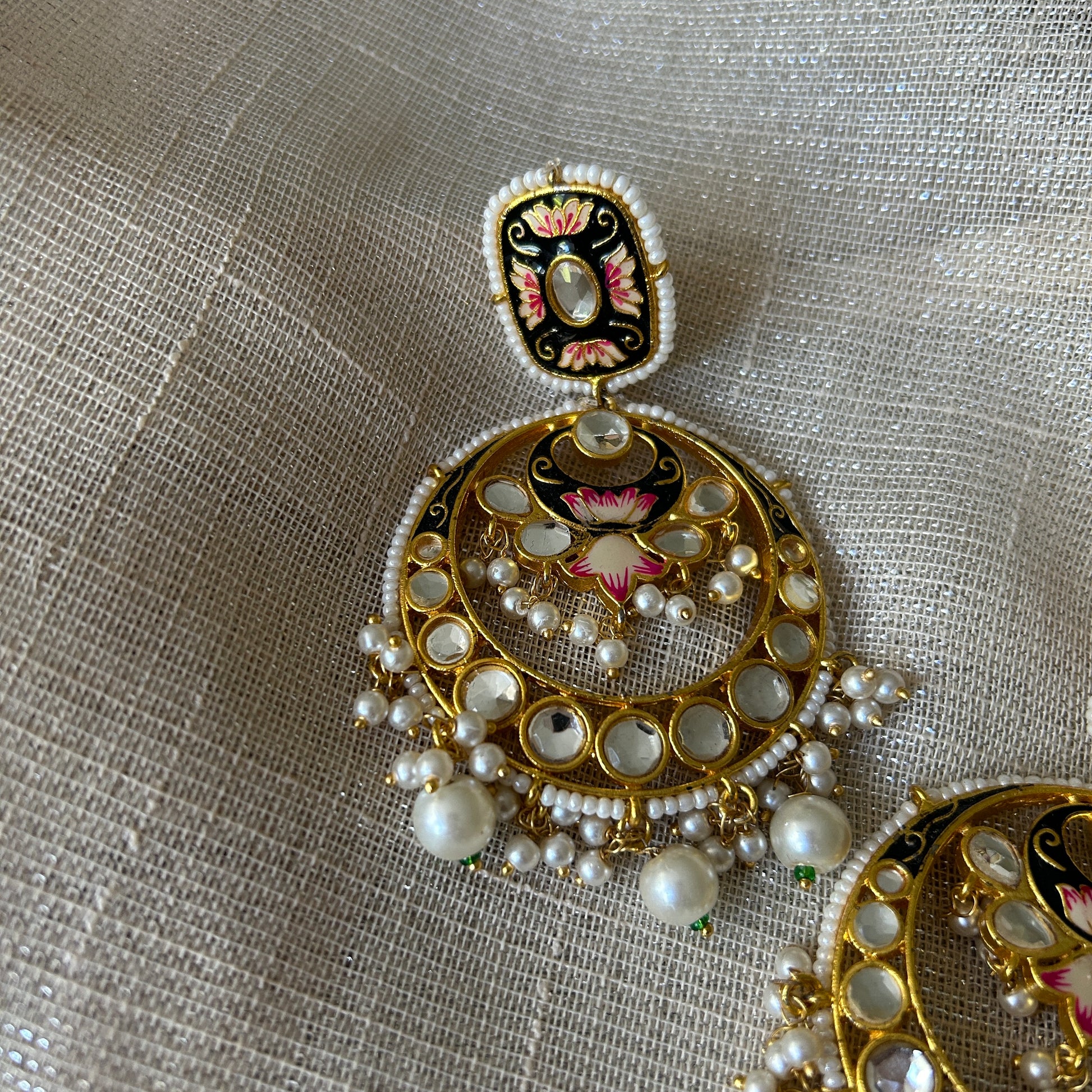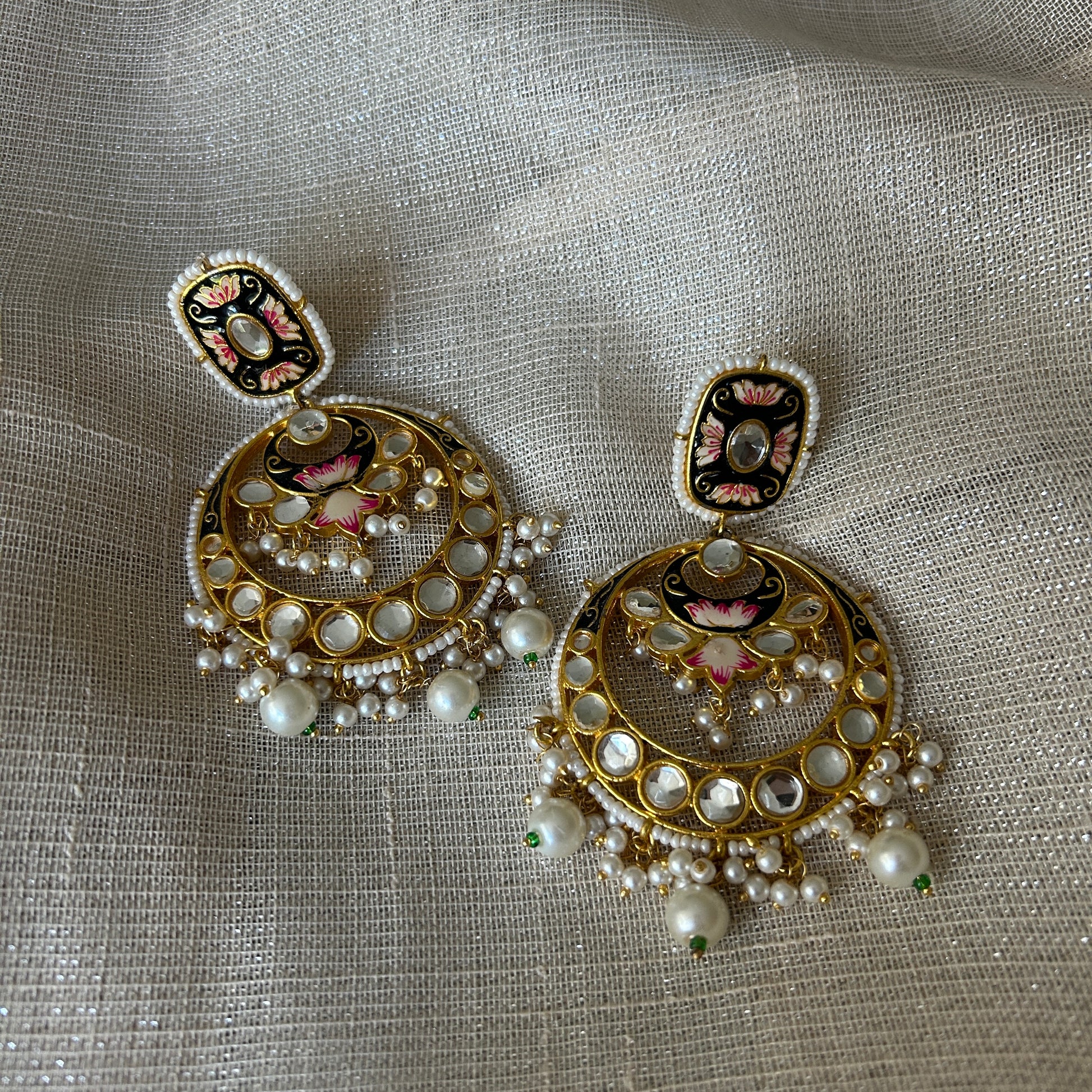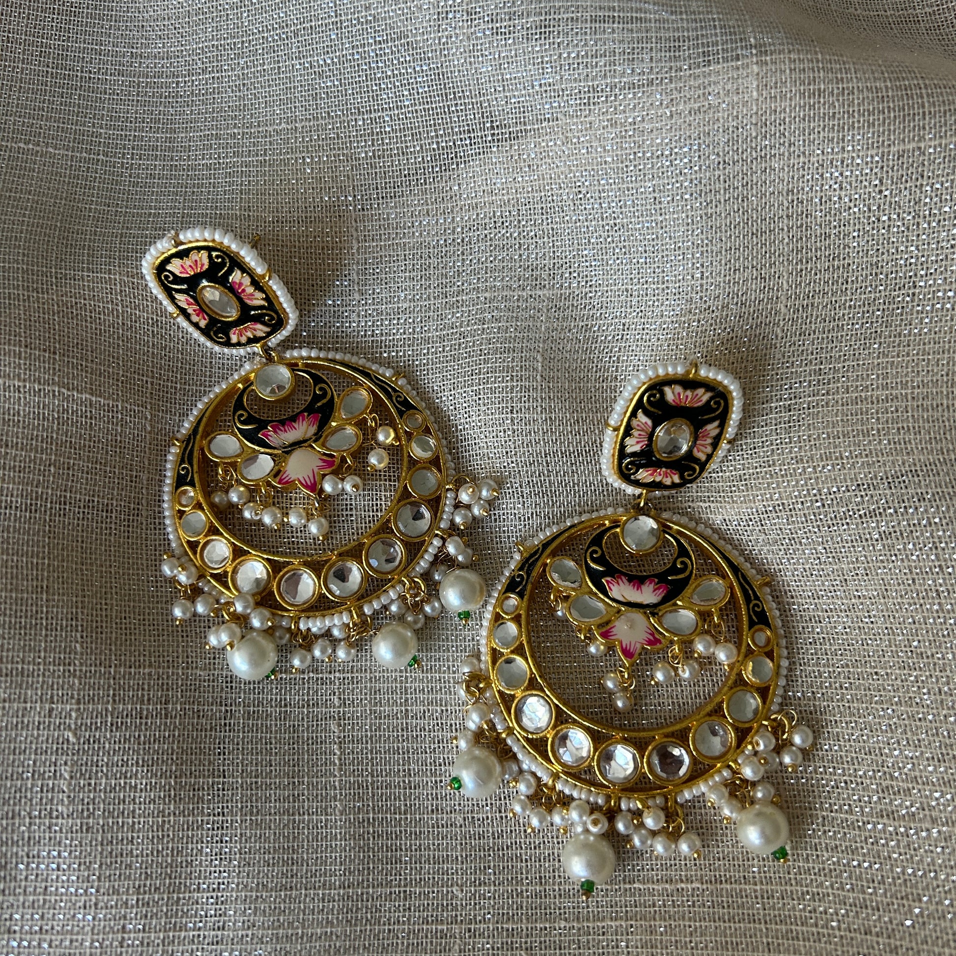 statement earrings in Kundan and meenakari detailing in tones of black and pink.
