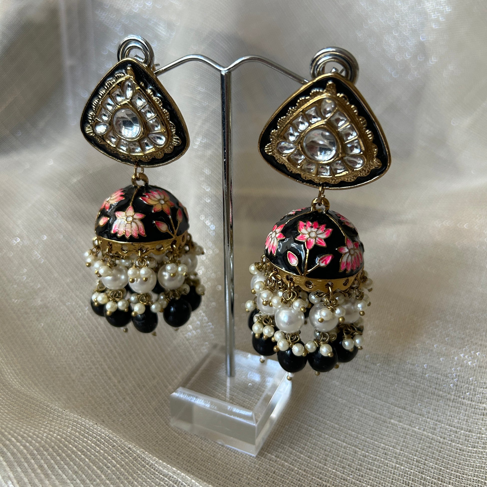 Jhumki earrings with black and pink MEENA hand painted details and pearls.
