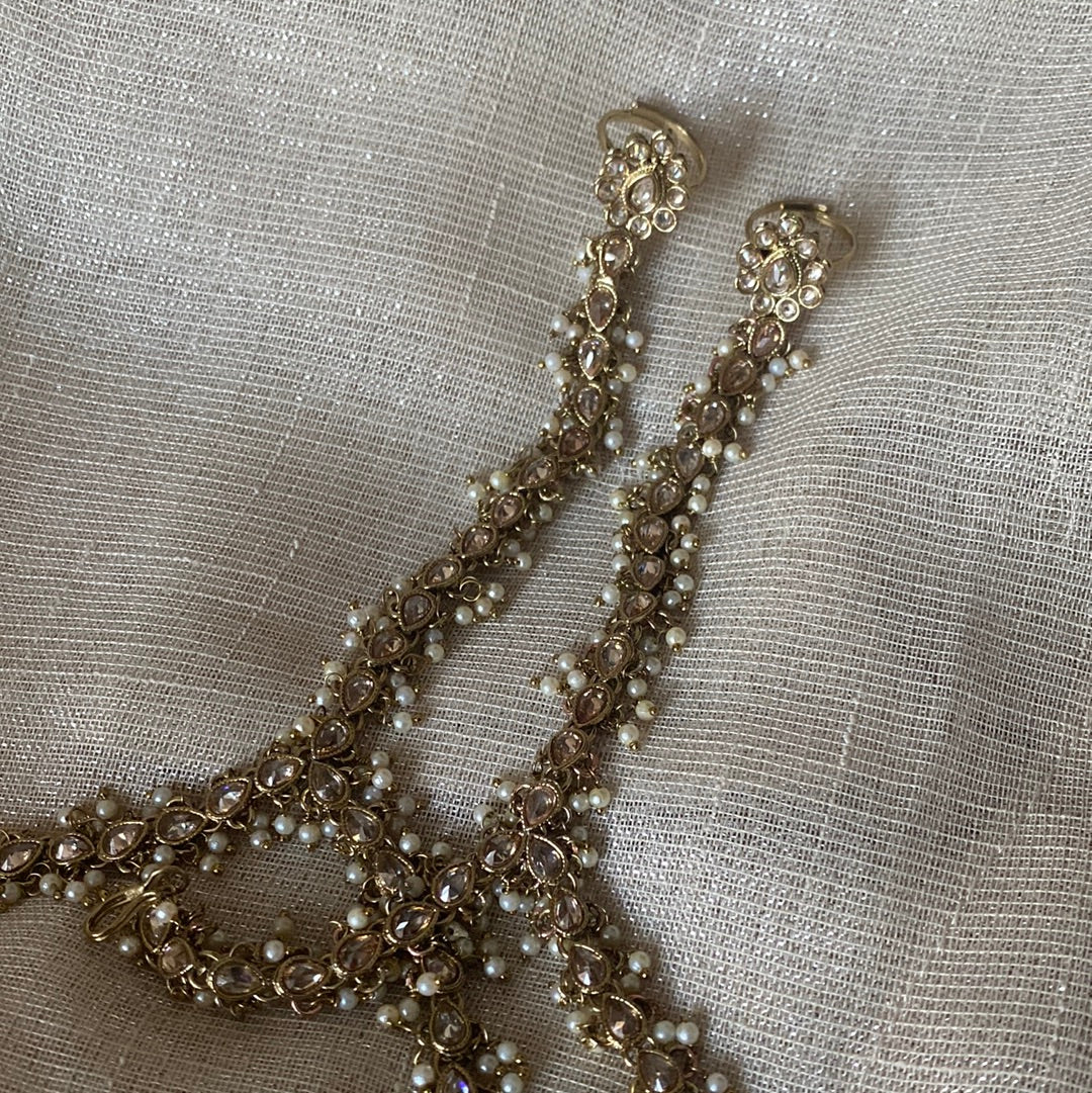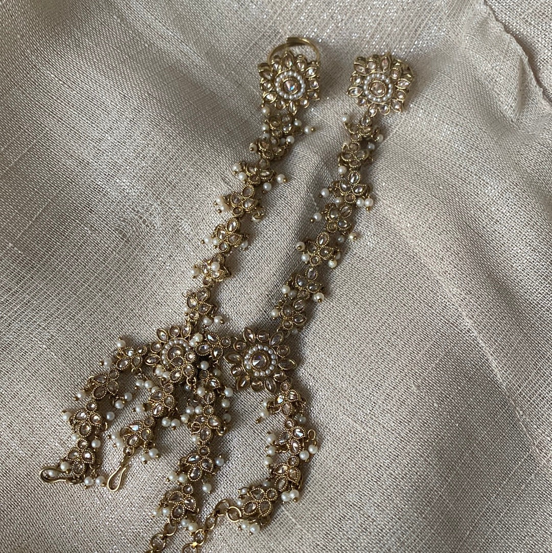 Delicate hand piece in golden Polki stone with pearl detailing. Adjustable around the ring and wrist.