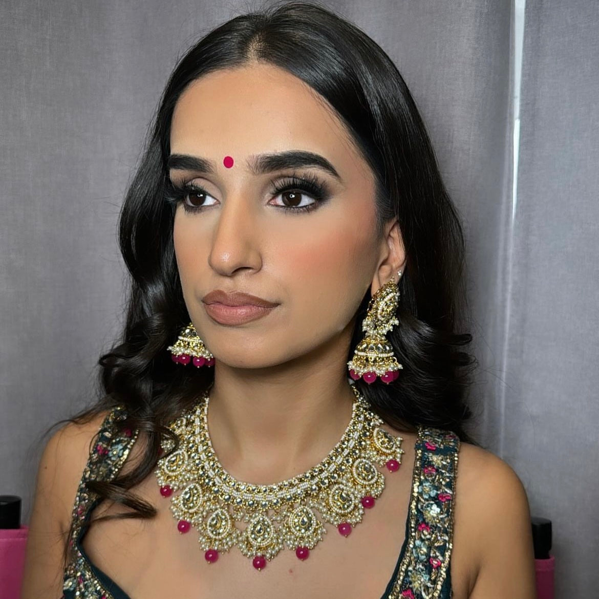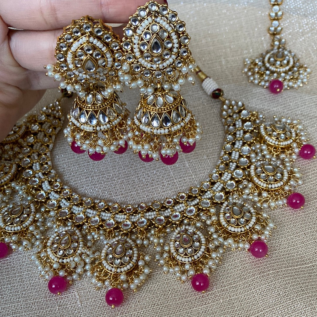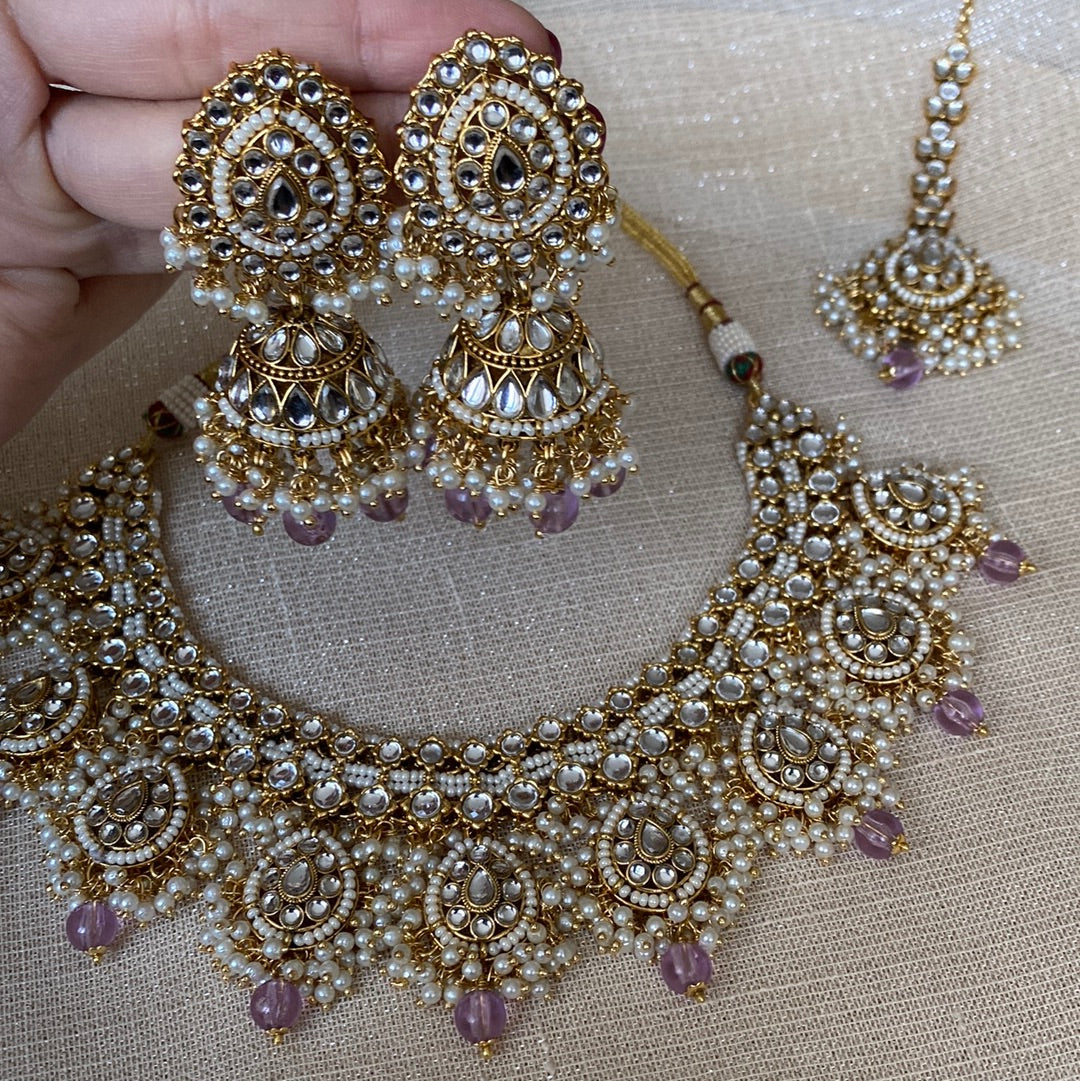 Gorgeous set in clear stone and pearls on gold plated with coloured beads. Mid size jhumki earrings and matching tikka to complete.