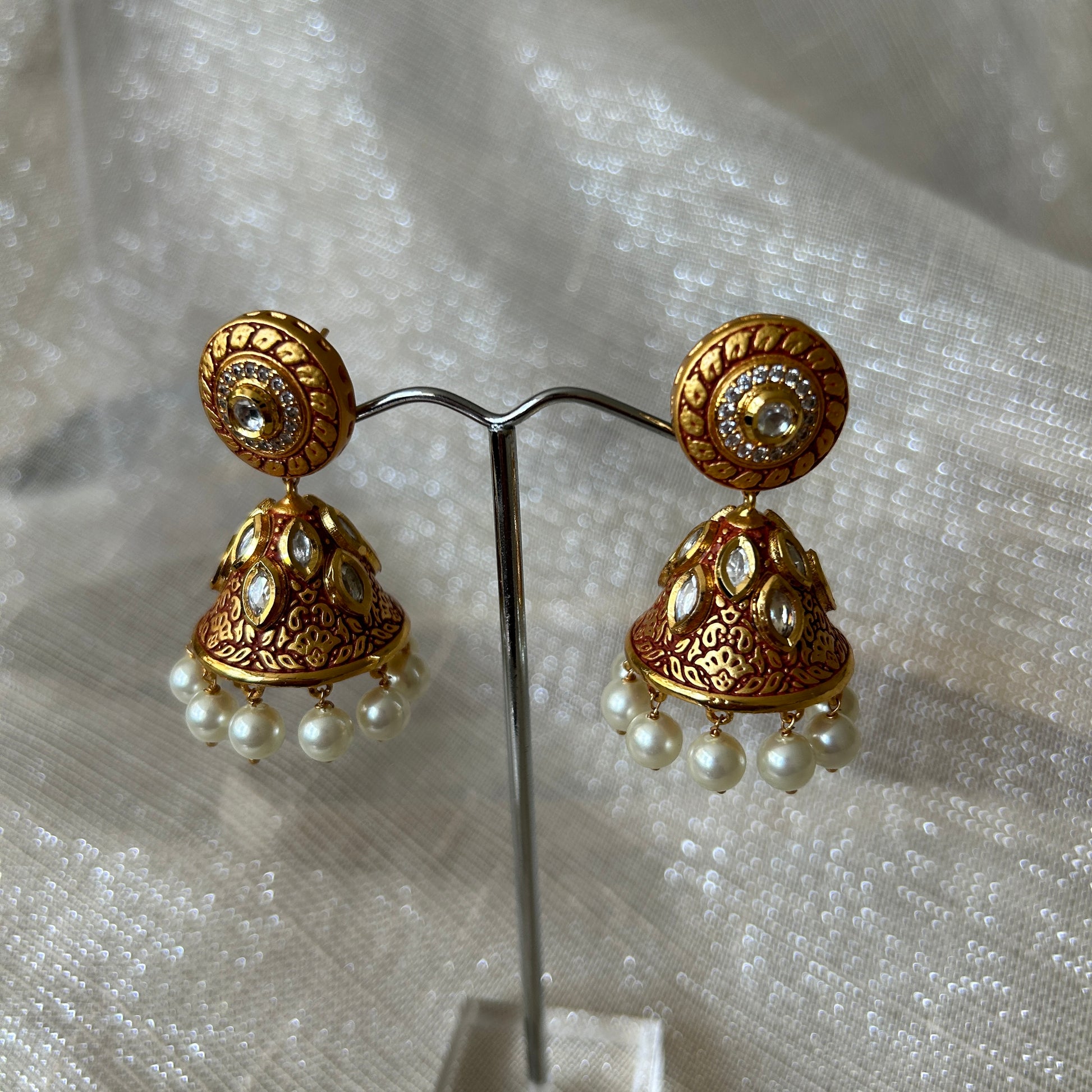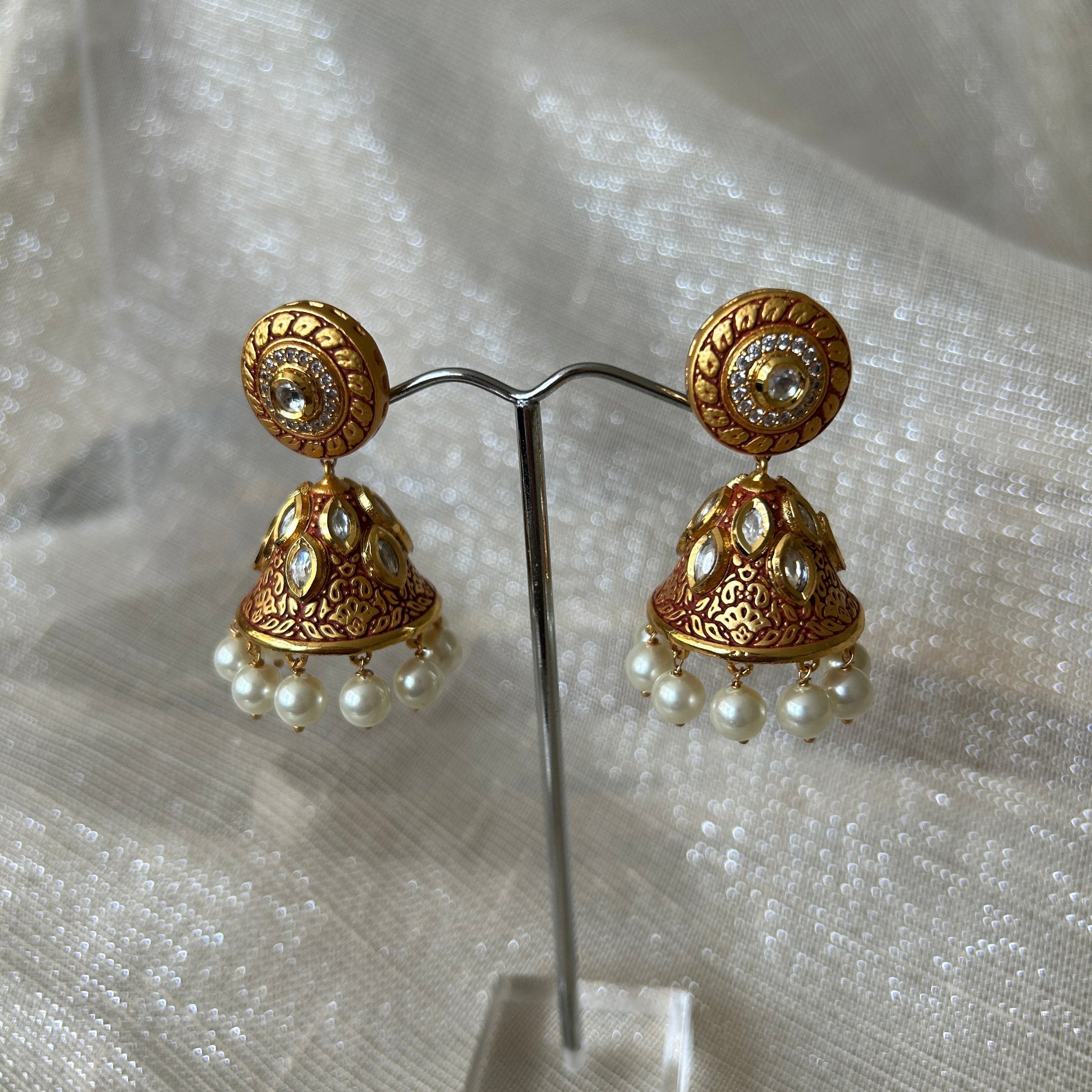 Jhumki earrings with red Meenakari design and pearls