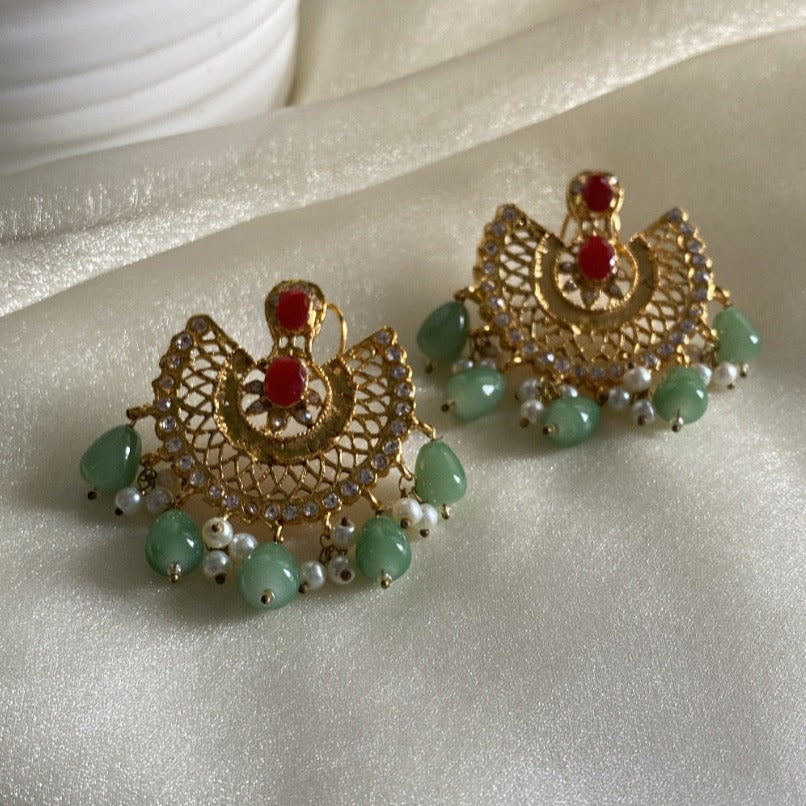 Beautiful statement earrings in gold plate with Ruby and green accents.