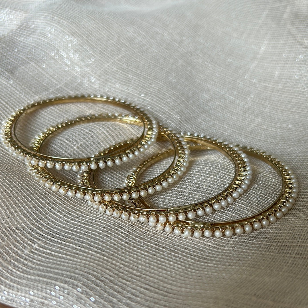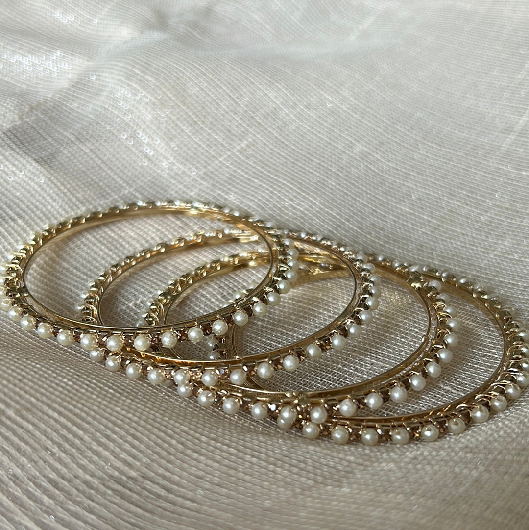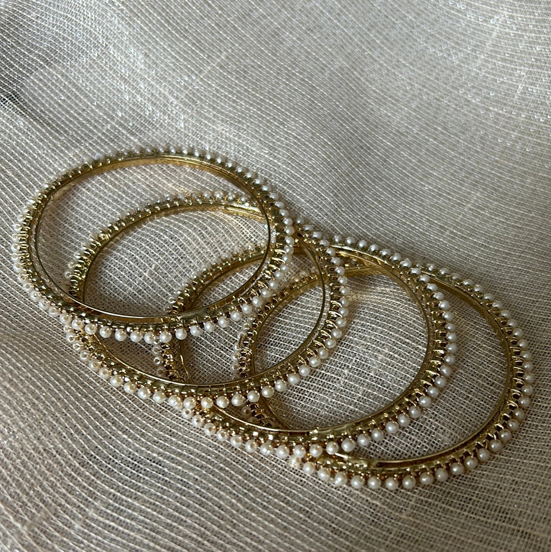 Pack of 4 delicate pearl trimmed gold plated bangles. Great for stacking or wearing alone.