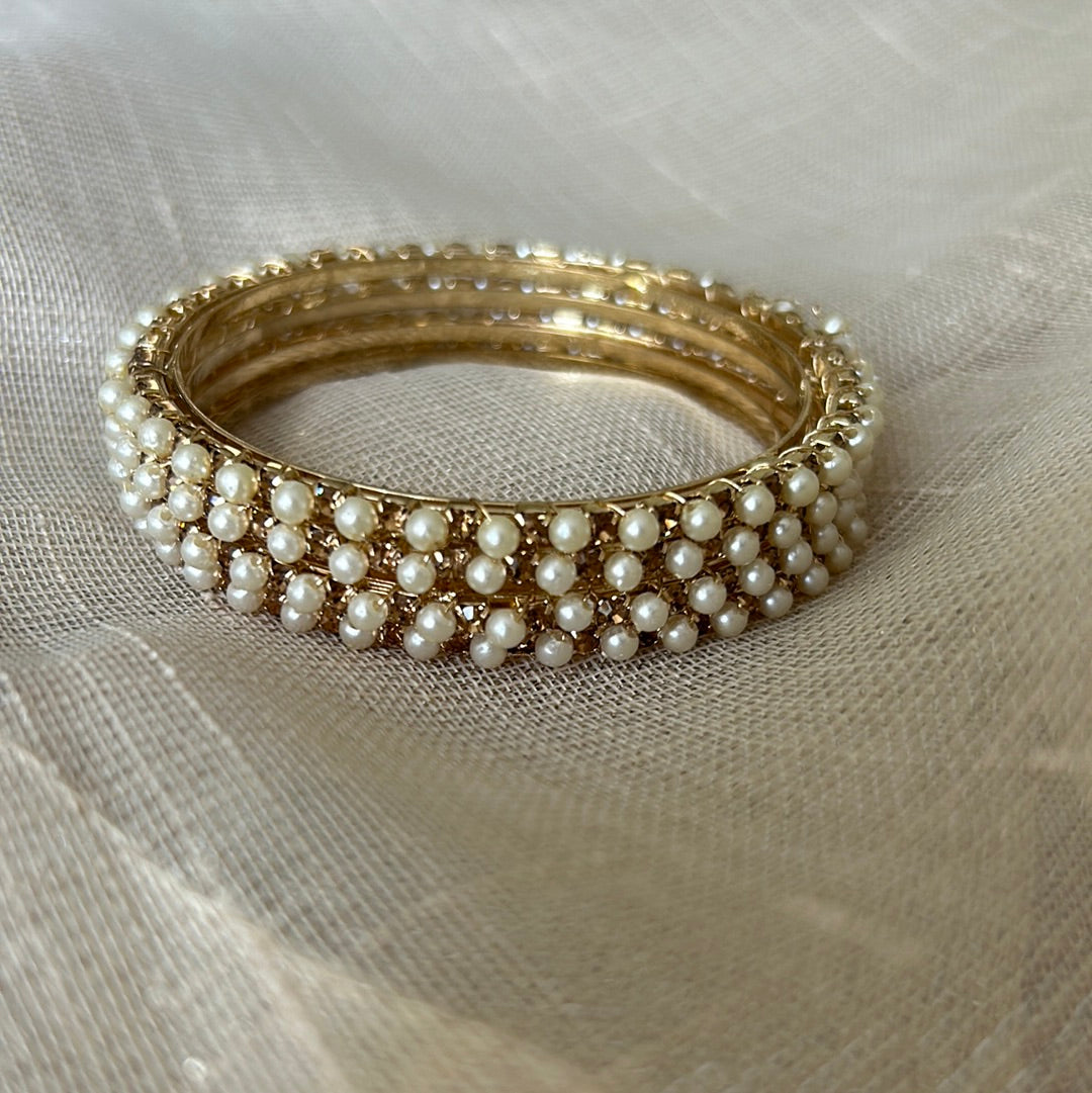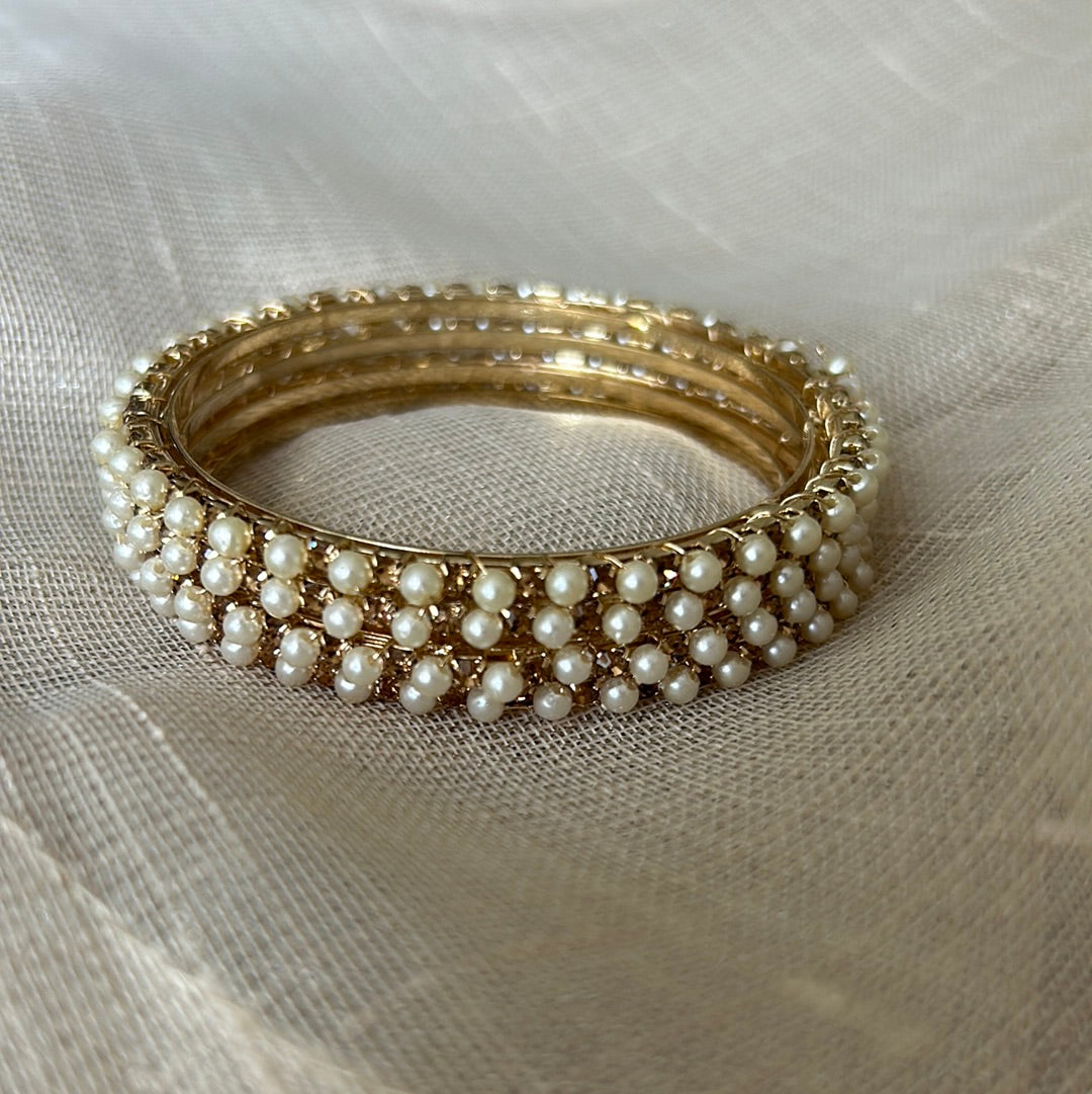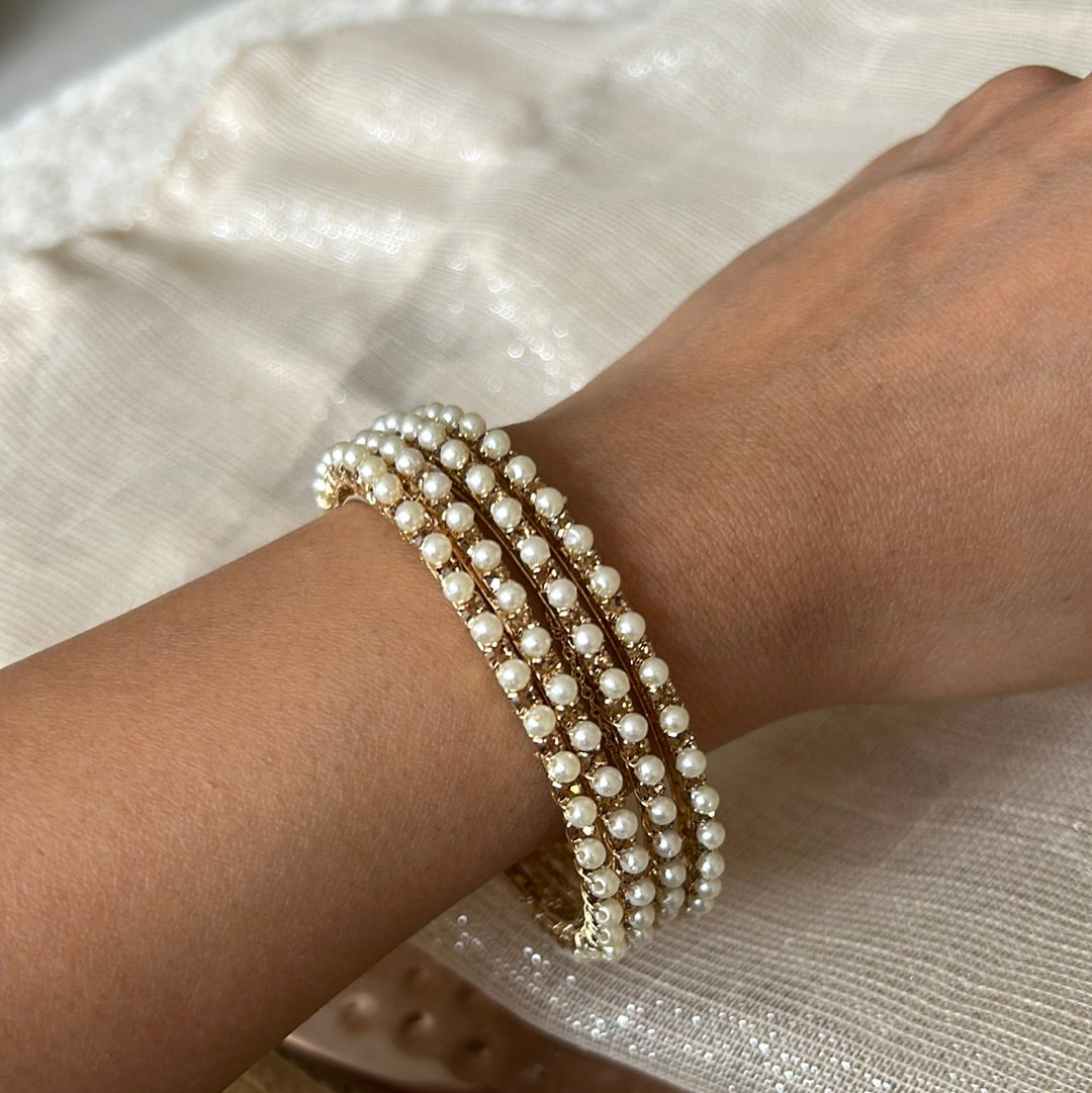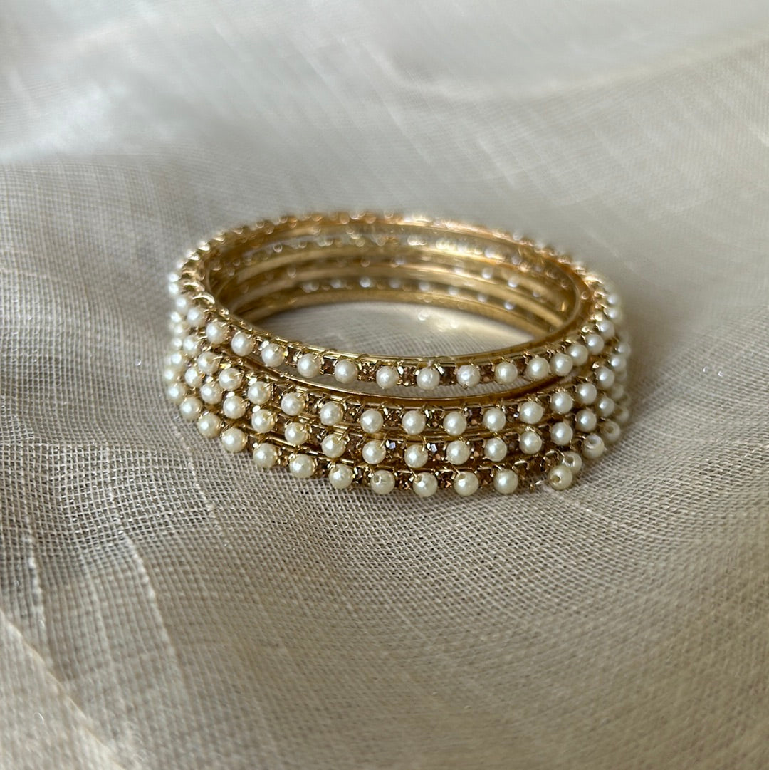 Pack of 4 delicate pearl trimmed gold plated bangles. Great for stacking or wearing alone.