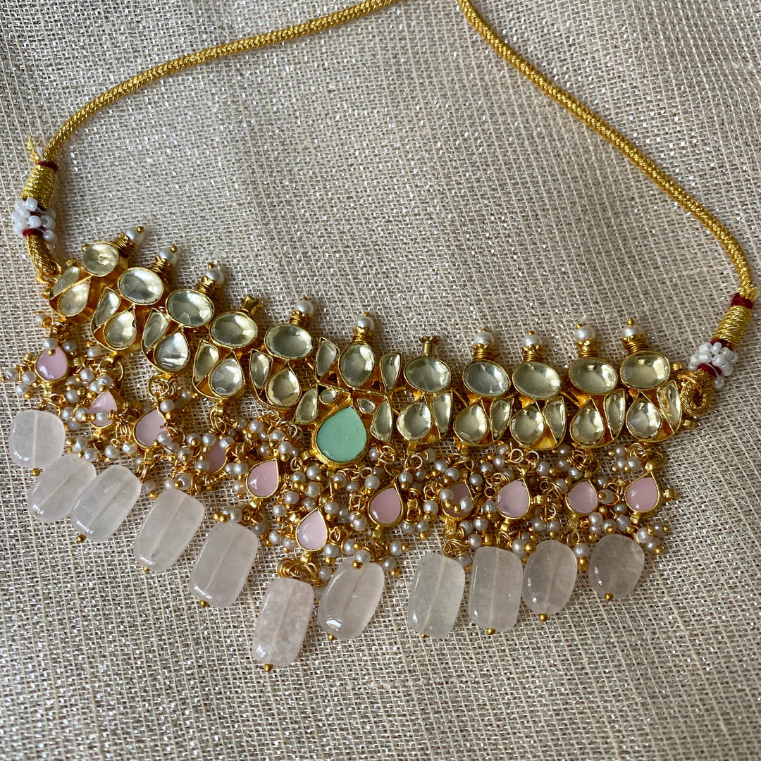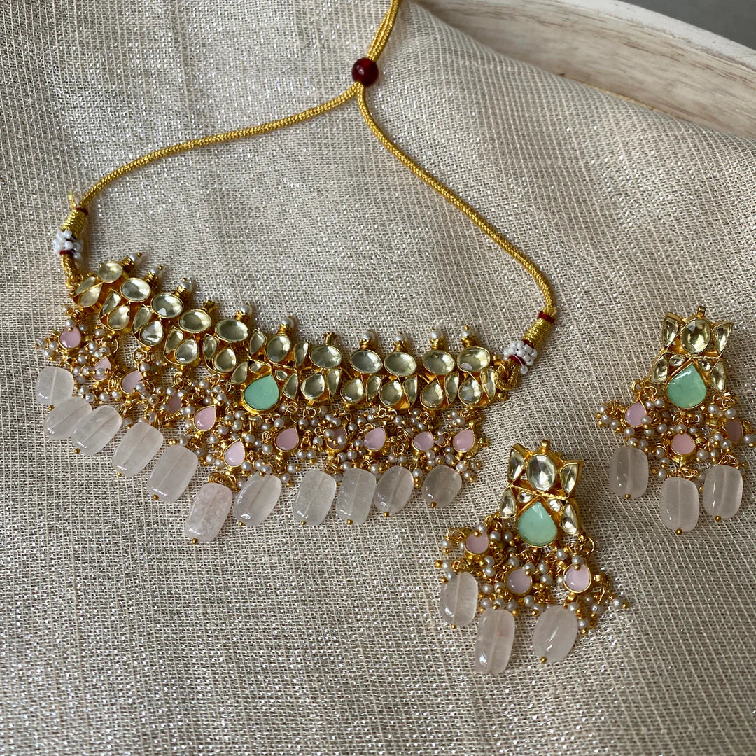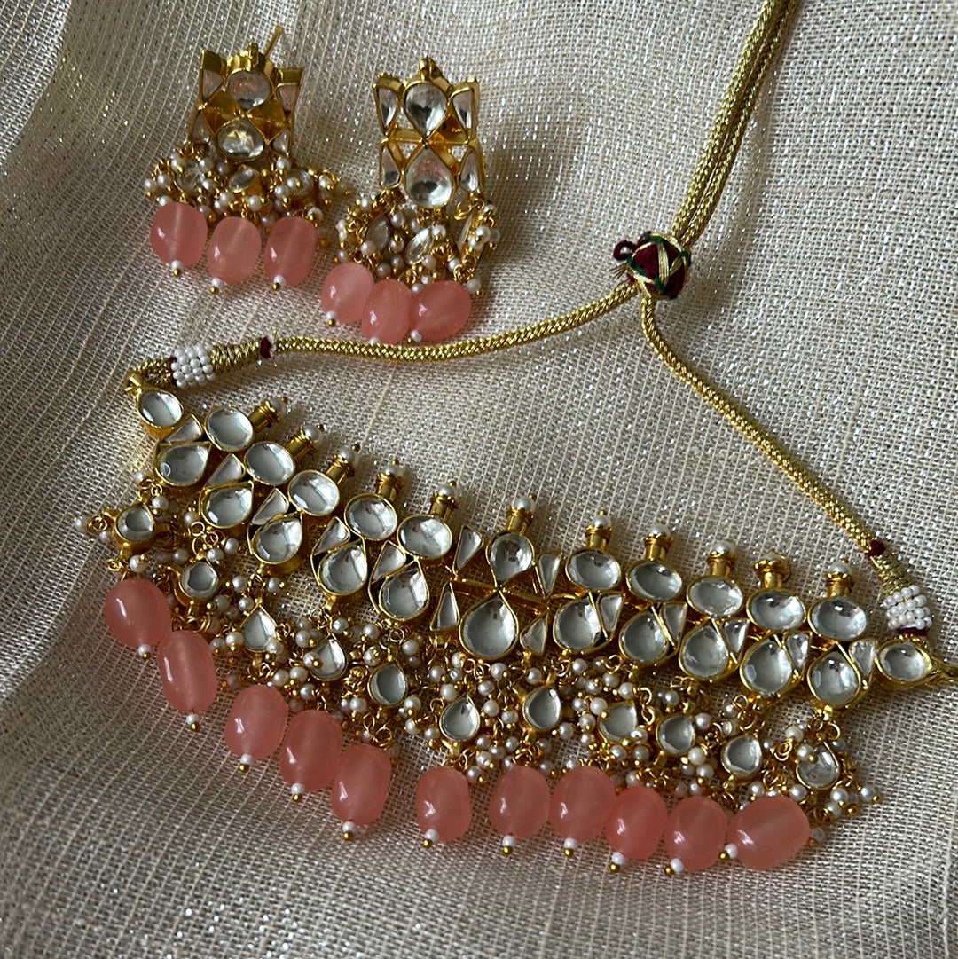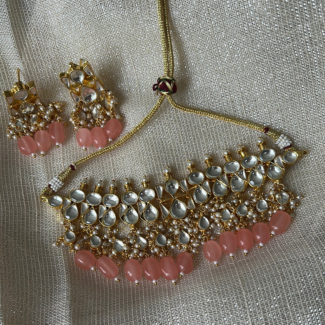 Beautiful kundan choker set with coloured beads and matching earrings. This set will become your go-to for wearing with all your party outfits going forward. Choose from shades of mint, pink, peach or classic pearls.