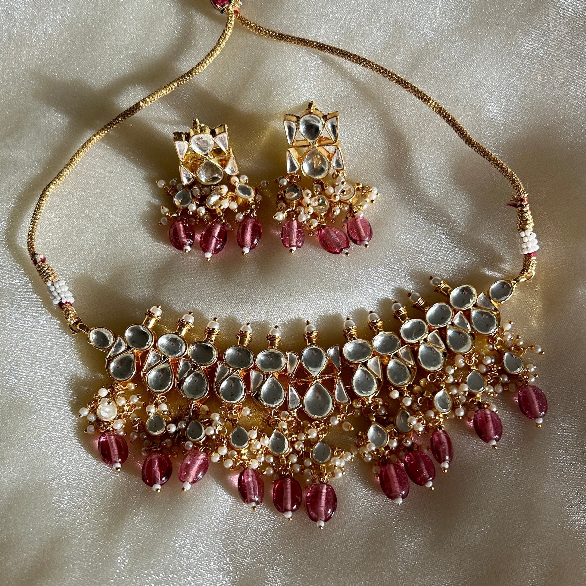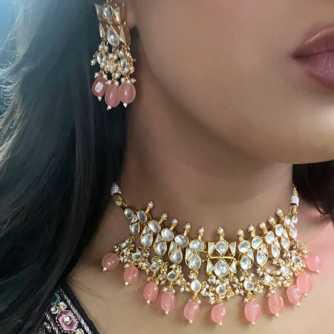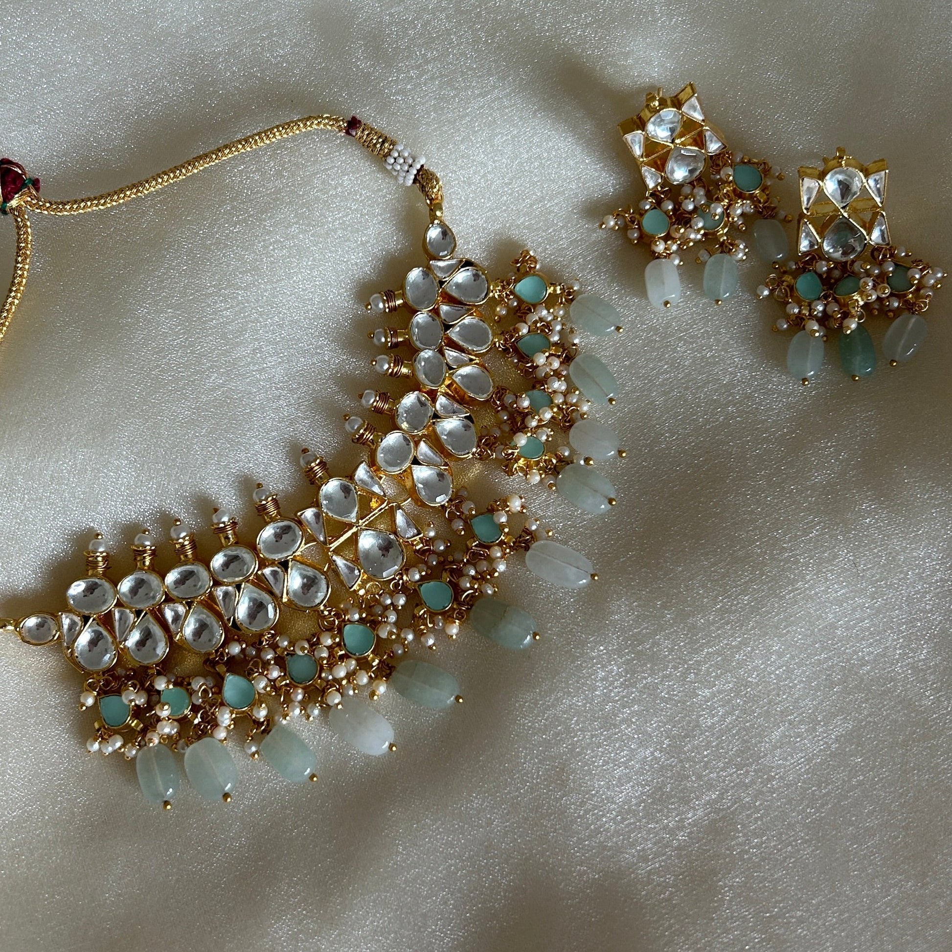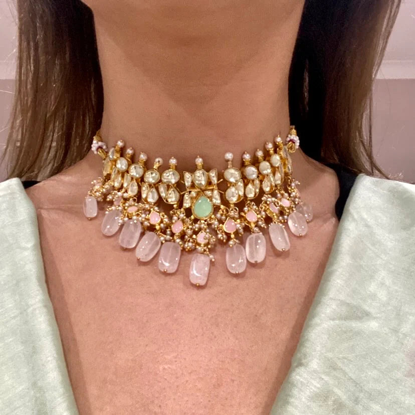 Beautiful kundan choker set with coloured beads and matching earrings. This set will become your go-to for wearing with all your party outfits going forward. Choose from shades of mint, pink, peach or classic pearls.