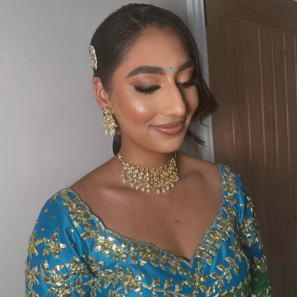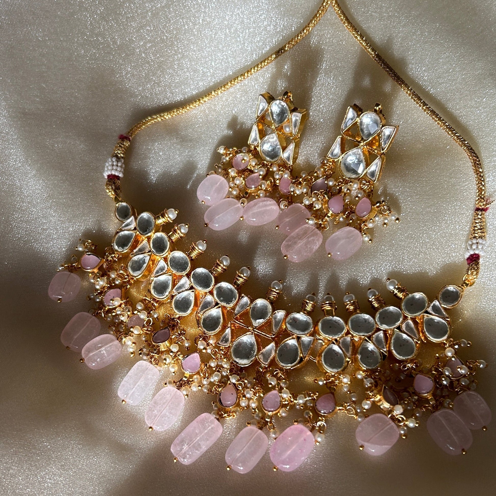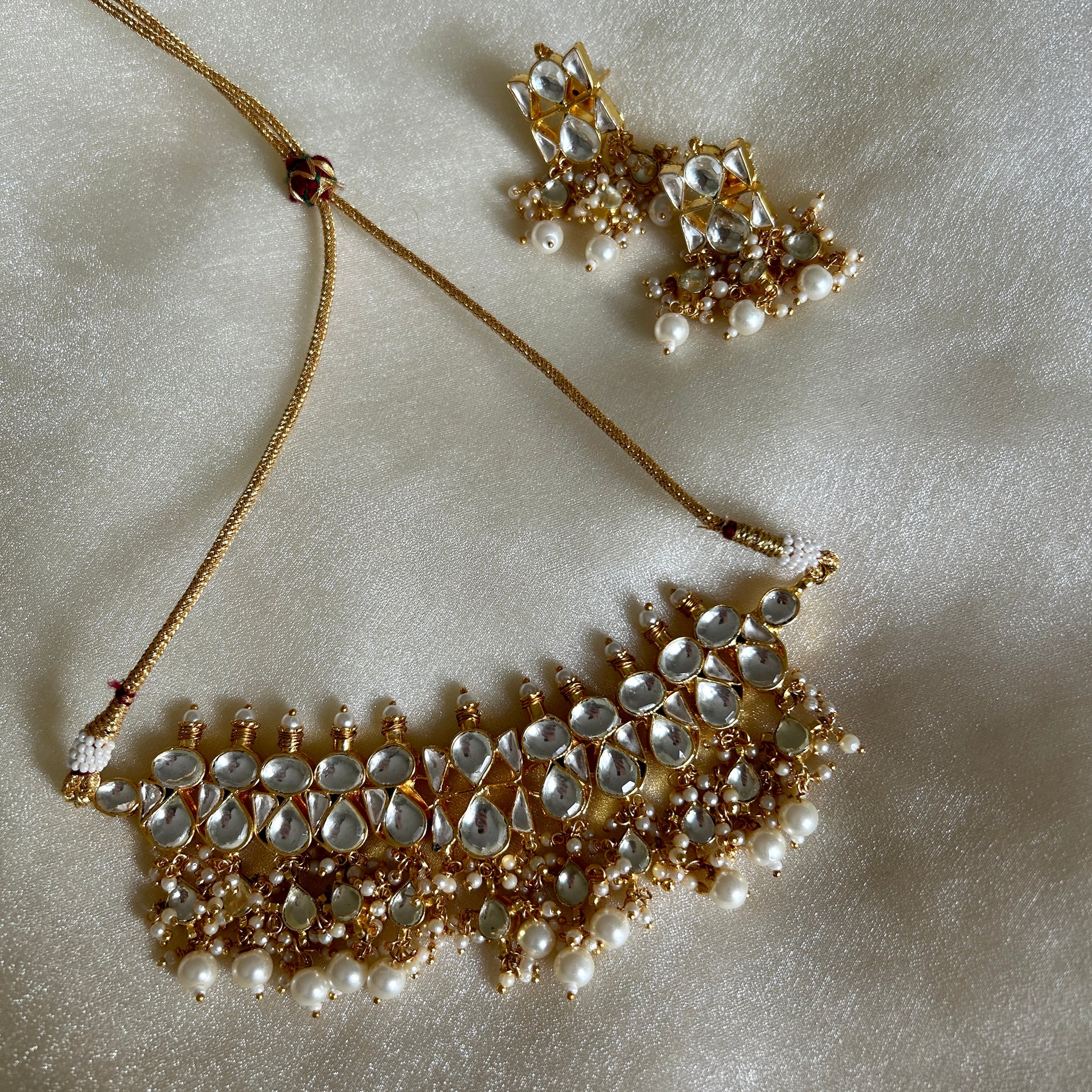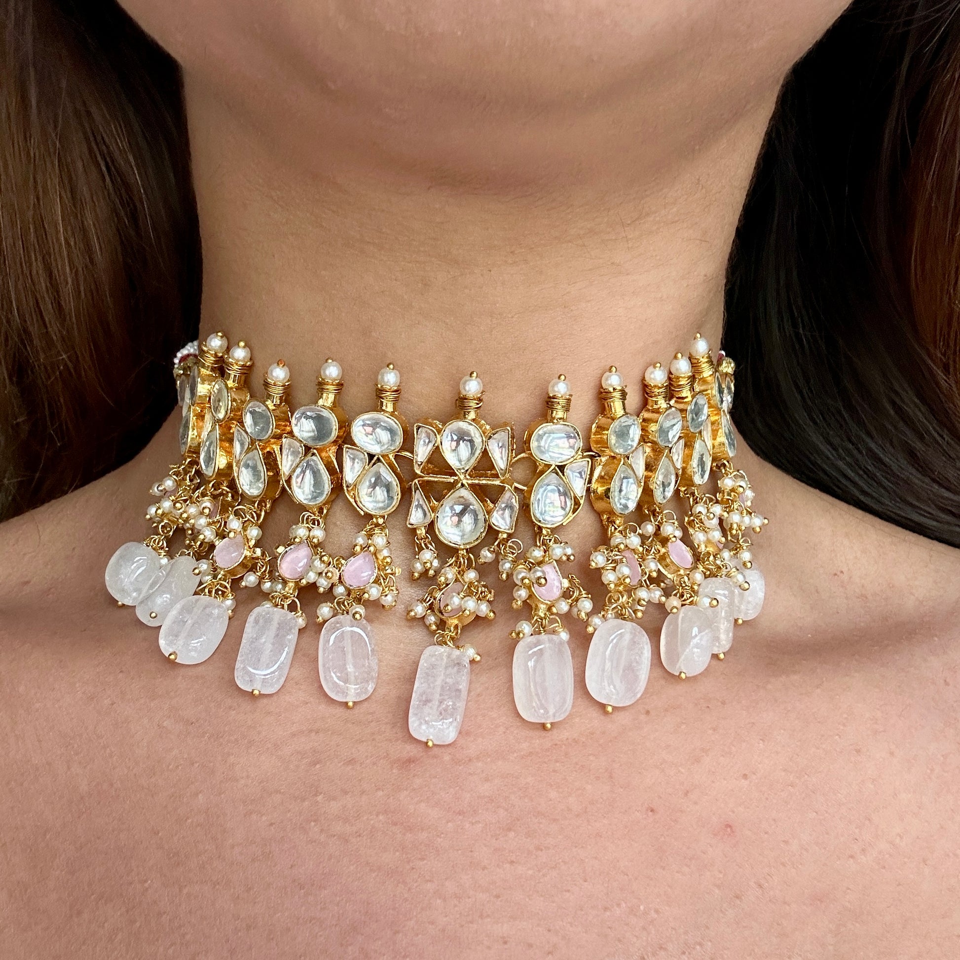 Beautiful kundan choker set with coloured beads and matching earrings. This set will become your go-to for wearing with all your party outfits going forward. Choose from shades of mint, pink, peach or classic pearls.